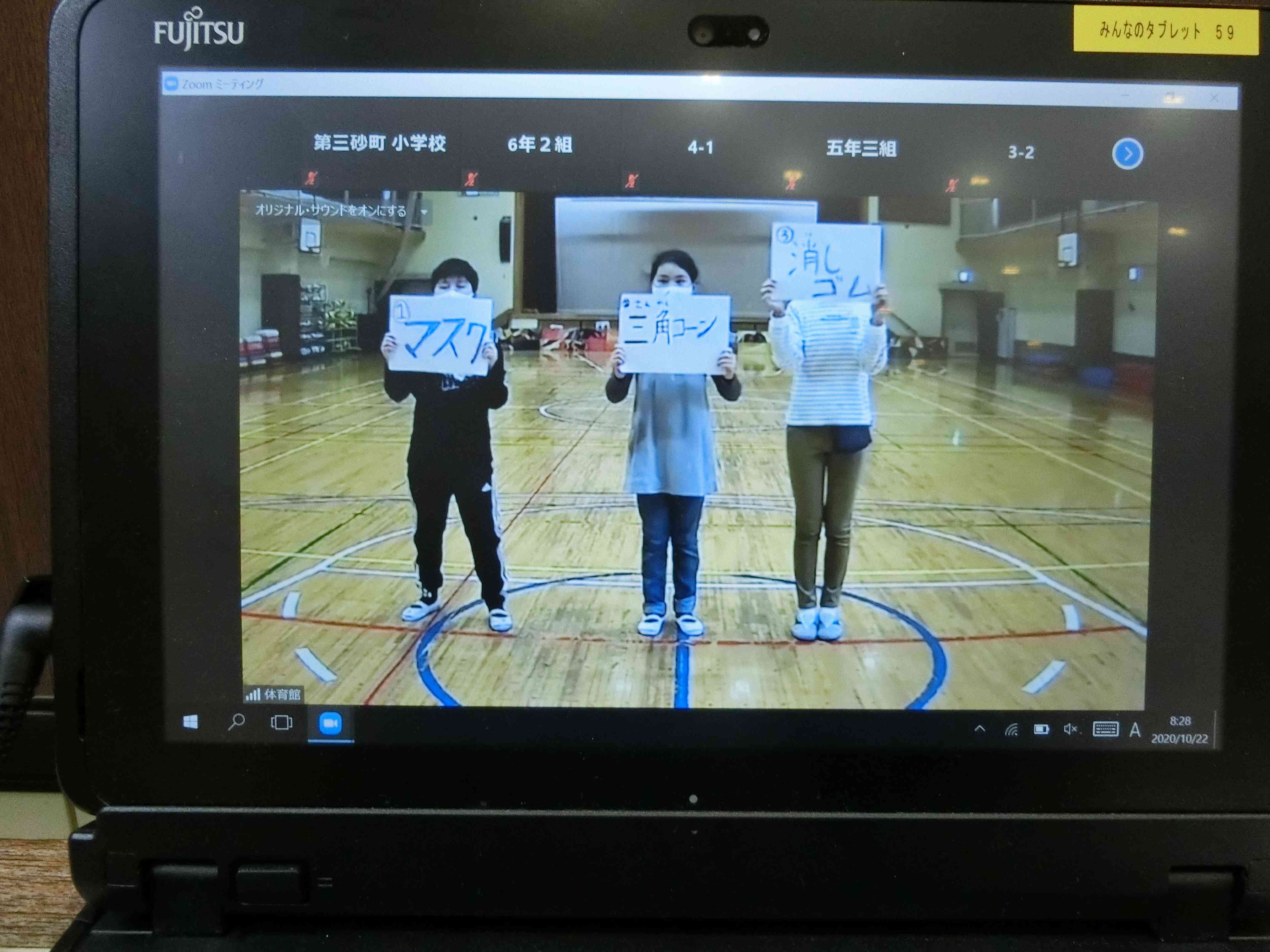 Zoomでの児童集会を行いました。 画面の前を通り過ぎるものが何かを当てるという内容で、Zoomだからこそできる内容でした。 集会委員の児童は、画面越しの反応が見えない中、明るく元気な声で集会を進めていました。