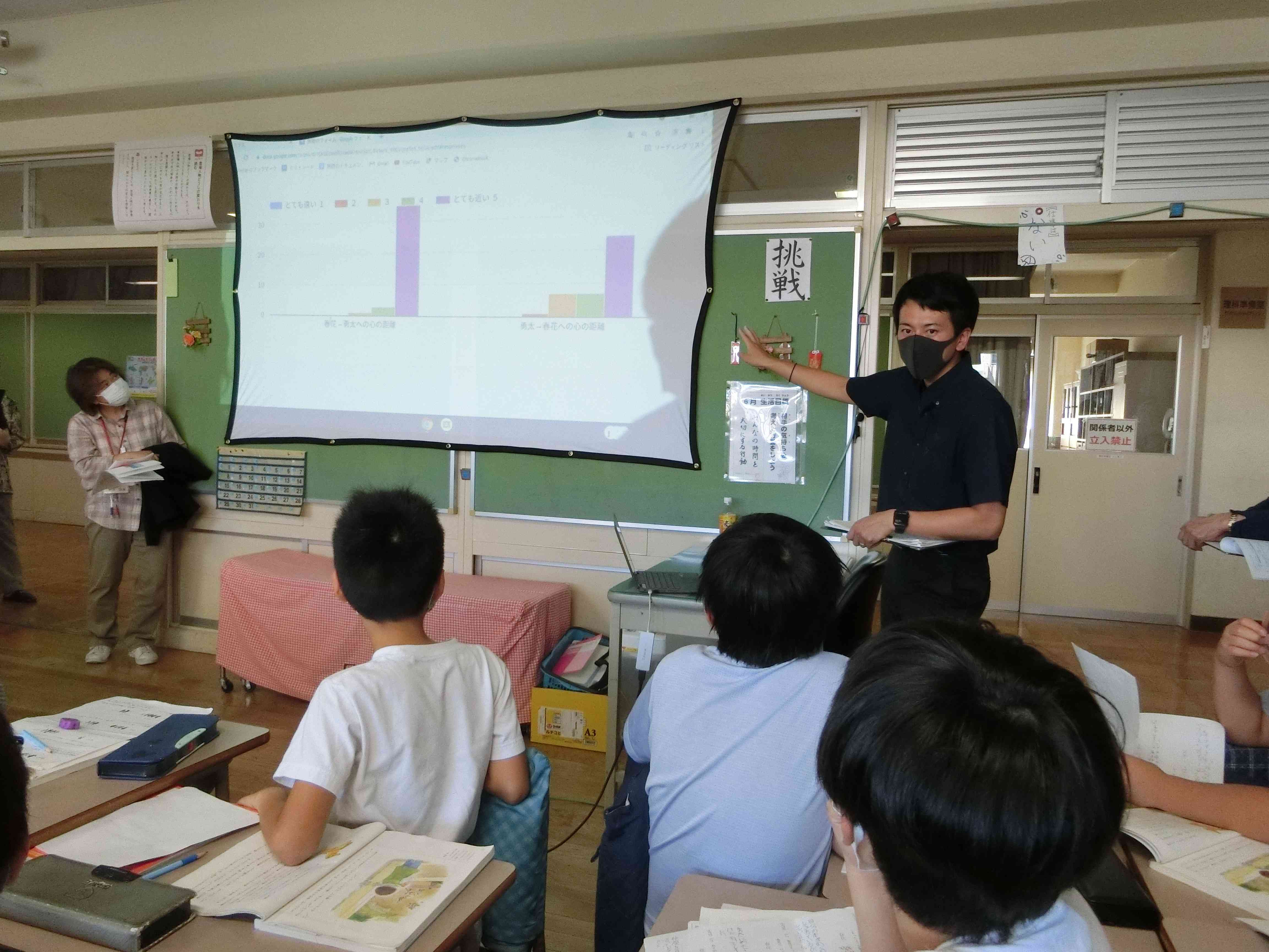 一人一台配布されているChromebookを活用した授業を行っています。音楽では、作曲を行ったり、国語や社会等の教科では、自分の考えを共有したりしています。今までは、ノートを見せ合ったり、発表したりすることで考えの共有を行っていましたが、Chromebookを使ってその場で確認することができるようになりました。ICTを有効に活用し、学びを深めていっています。