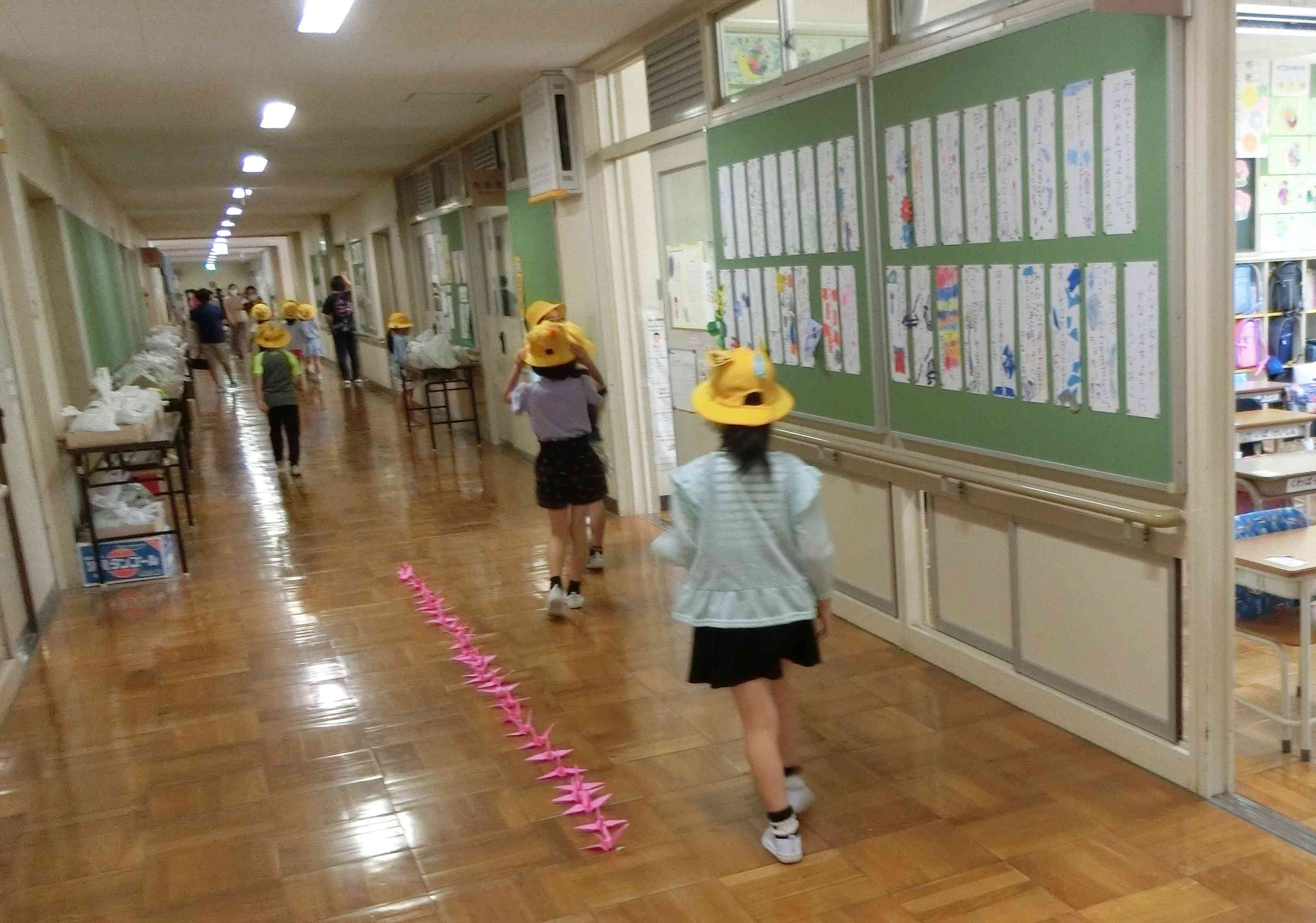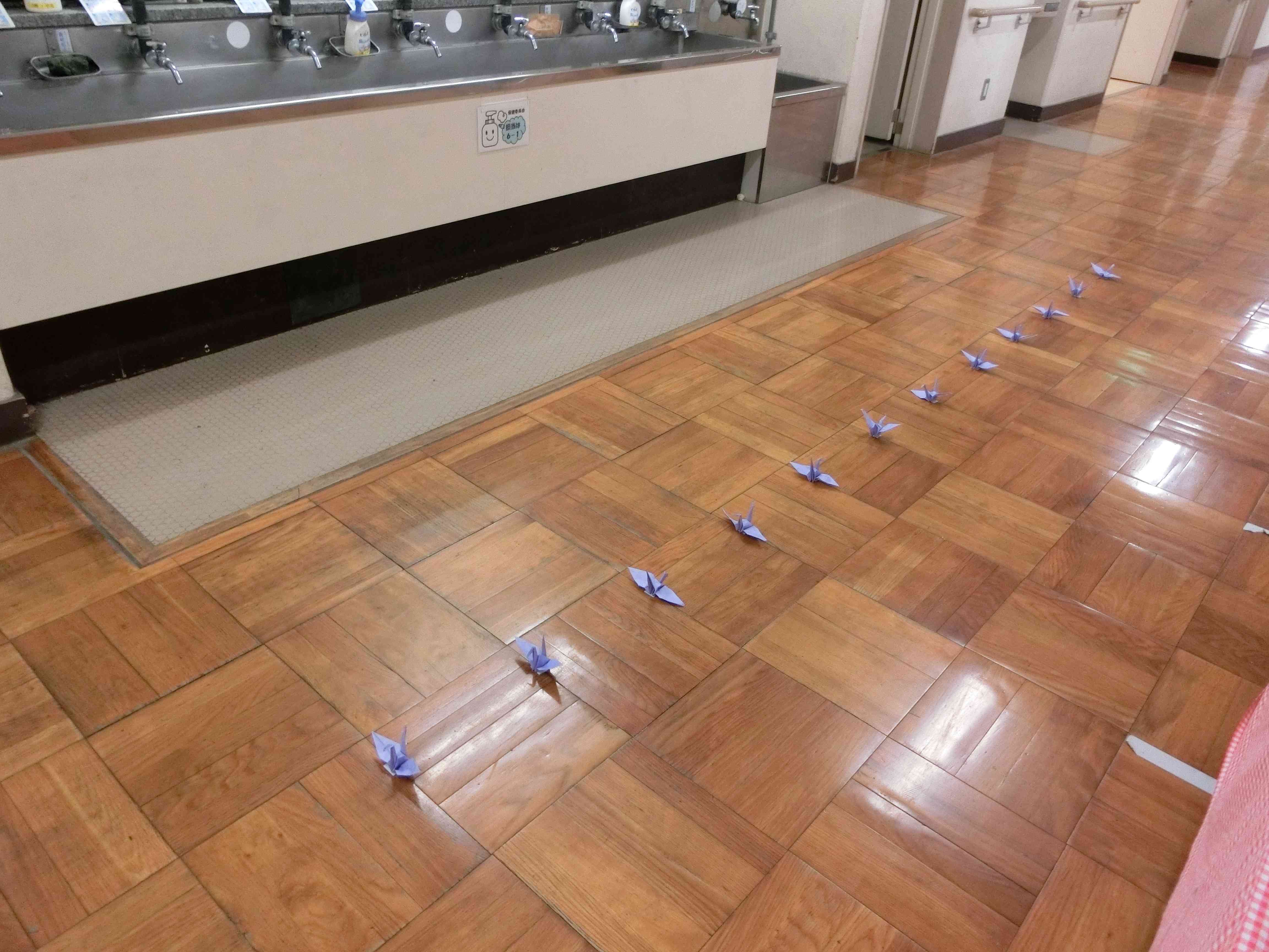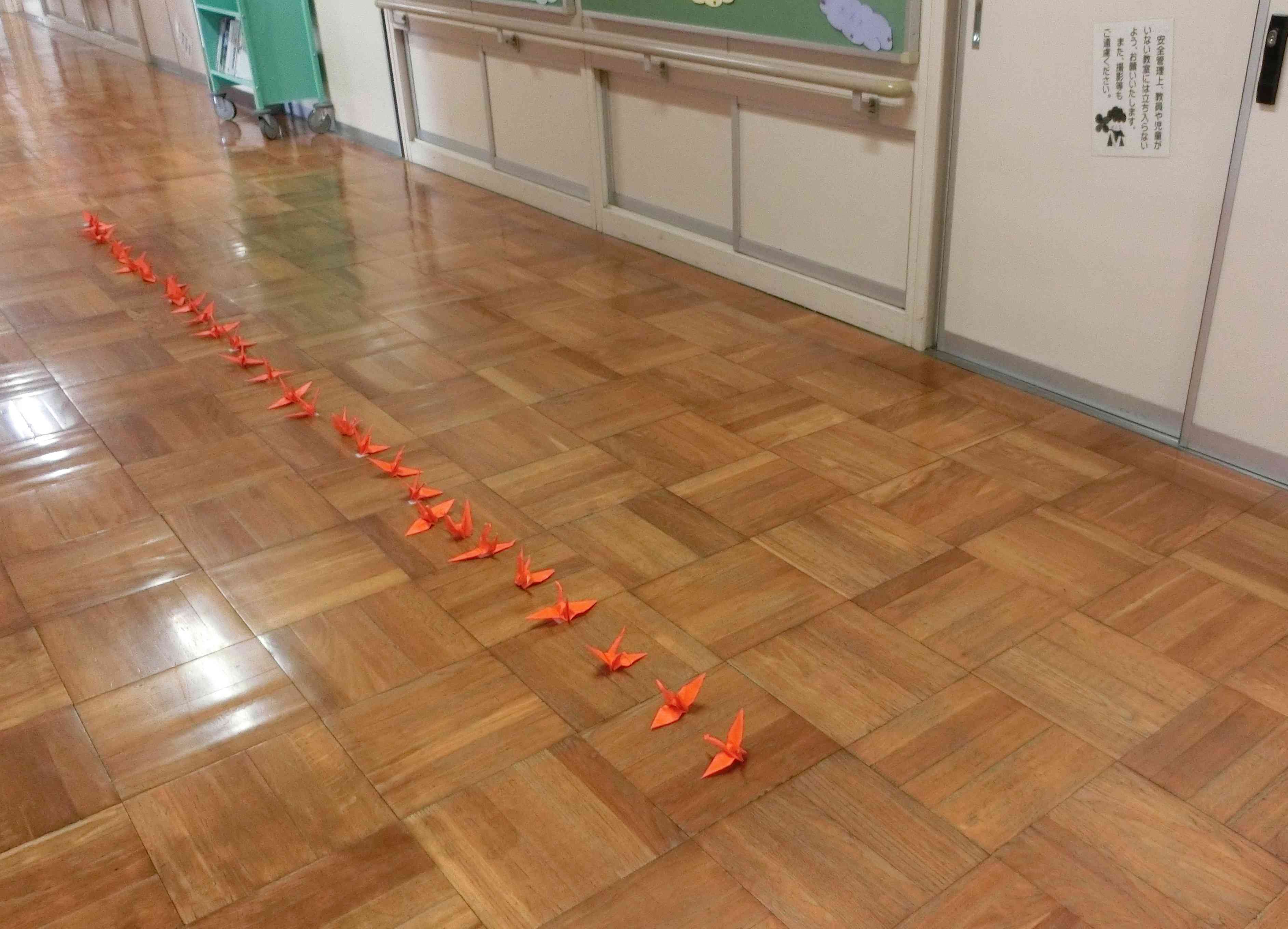 各クラスの前の廊下の真ん中に、各クラスで折った折り鶴を置きました。 ● 廊下は、右側を歩きましょう! ● せまい時は、2列から1列になりましょう! ● 「お先にどうぞ」とゆずり合う気持ちをもちましょう! 折り鶴を置いたことで、言葉で注意しなくても、一人一人が意識しながら学校生活を送っています。
