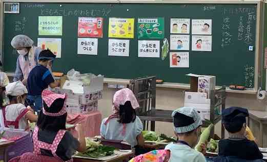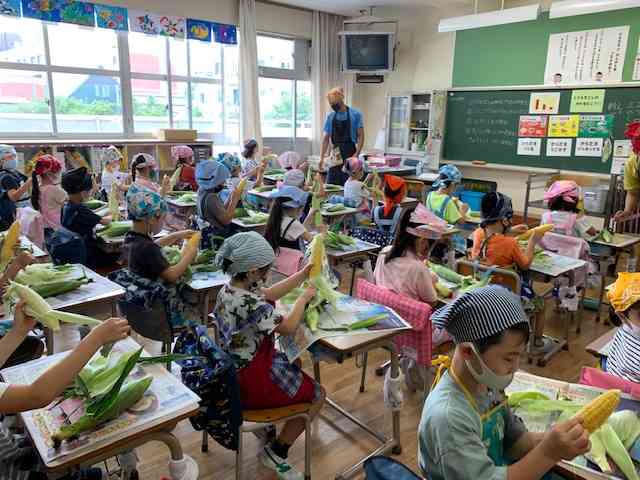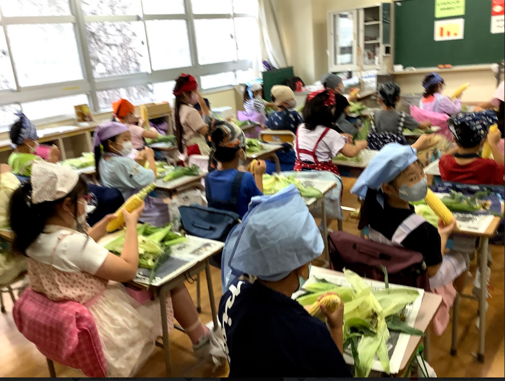 7月15日(木)に、各クラスで、とうもろこしの皮むきを行いました。 とうもろこしは体の調子を整える緑の仲間であることや、収穫後の変化の甘さについて学習し、楽しそうに大きなとうもろこしの皮をむきました。その日の給食では「甘くておいしい!」「これは、ぼくがむいたとうもろこしだ!」と言いながら、おいしくとうもろこしを食べていました。