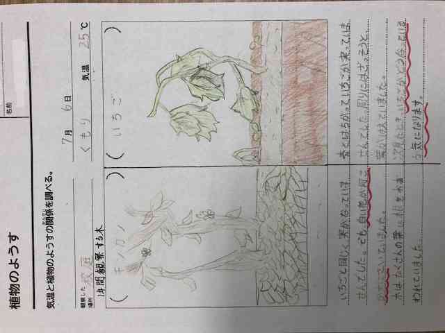 梅雨が明け、蝉の鳴き声が聞かれるようになり、連日うだるような暑さです。 4年生は、理科の学習でツルレイシを育て、季節ごとに観察をしています。夏休み中も枯れないように、主事さん方のお力も借りながら水やりをしていきます。猛暑に負けず、実が生りますように!! また、校庭にある植物の中で、自分が選んだ植物も1年間定期的に観察をしています。前の観察からの変化だけでなく、植物による様子の違いにも注目してもらいたいです。【添付ファイル】