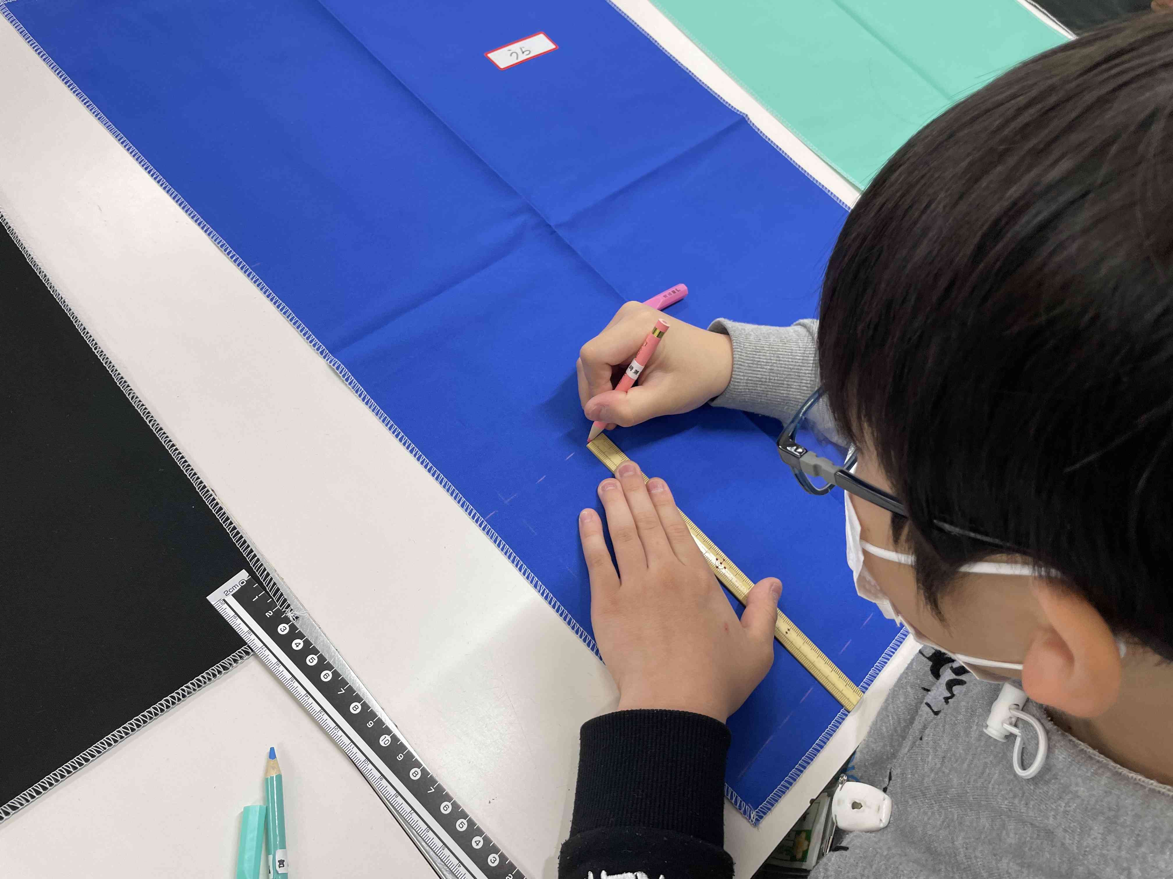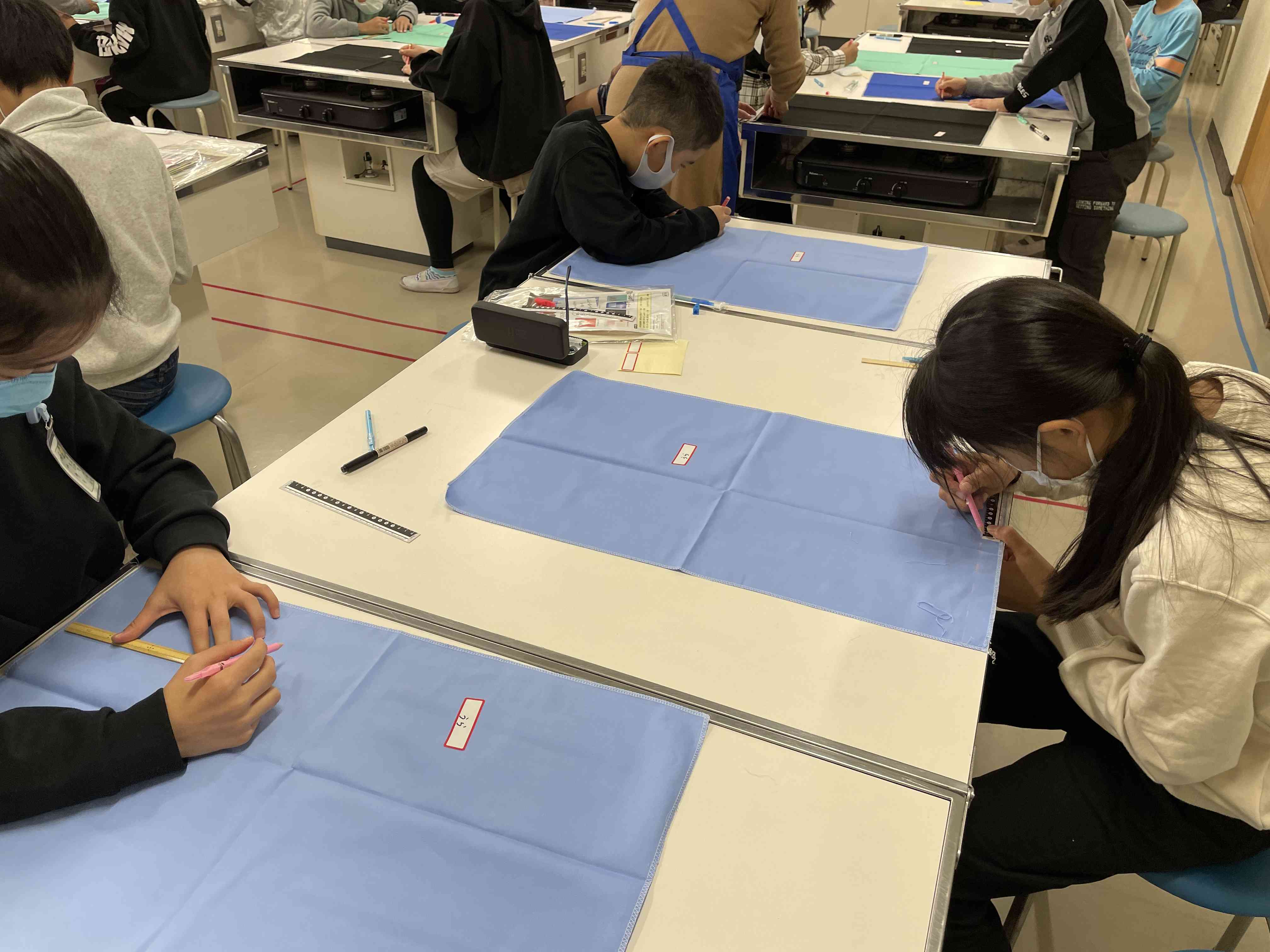 家庭科の「ミシンにトライ」の学習の様子です。ミシンを使って縫う前に、布に印をつけているところです。どの子も一生懸命に取り組んでいます。集中しているため、しっかりと定規を押さえて印をつけていても、少しずつ定規がずれていることに気付かず、斜めに線を引いてる場面もありました。(自然と笑顔になっていました。) 安全に気を付けながら印つけを行い、その活動が終わったらミシンを使って縫います。地域支援の方も4人サポートに入ってくださっています。どんな作品ができるのか、楽しみにしています。【添付ファイル】