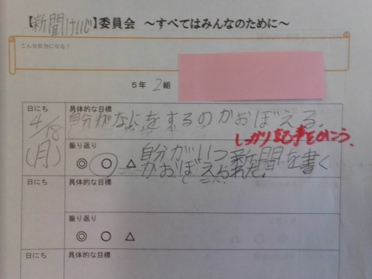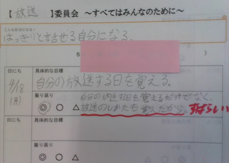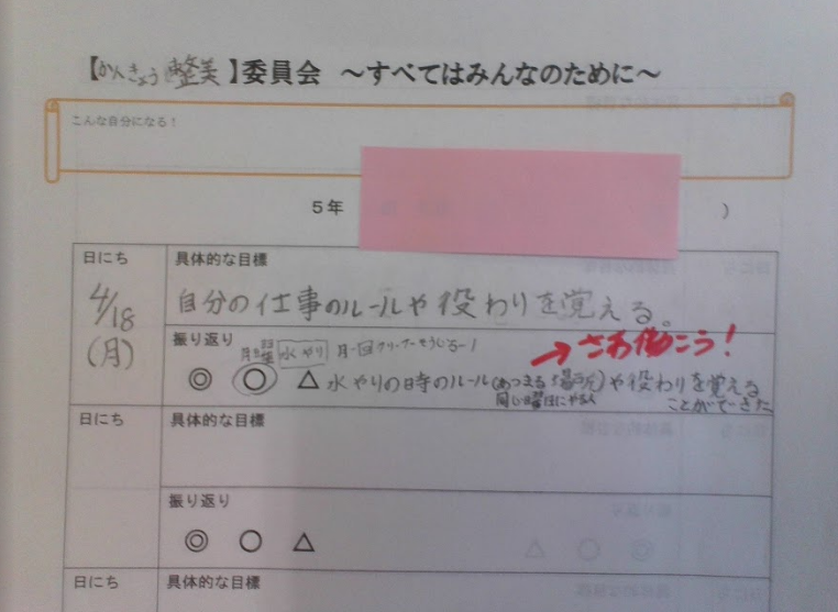 高学年は、学級・学年を超えて学校全体のため に働こう!という気持ちで、委員会活動に取り 組んでいます。6年生に教わりながら、まずは仕 事を覚えることから始めました。活動毎に、めあ てをたて、ふり返りを生かそうとしています。自 信をもって活動を続けてほしいです。