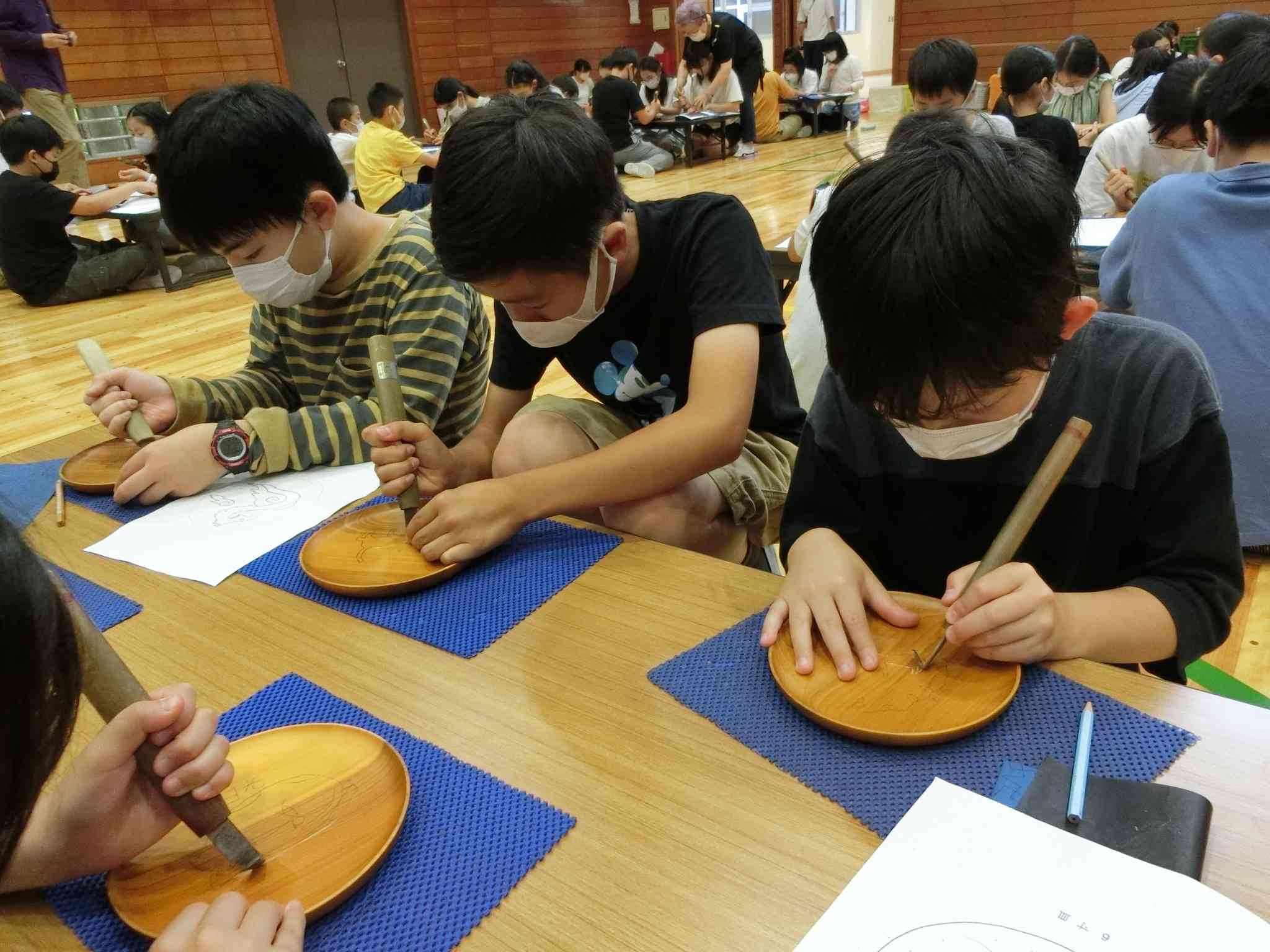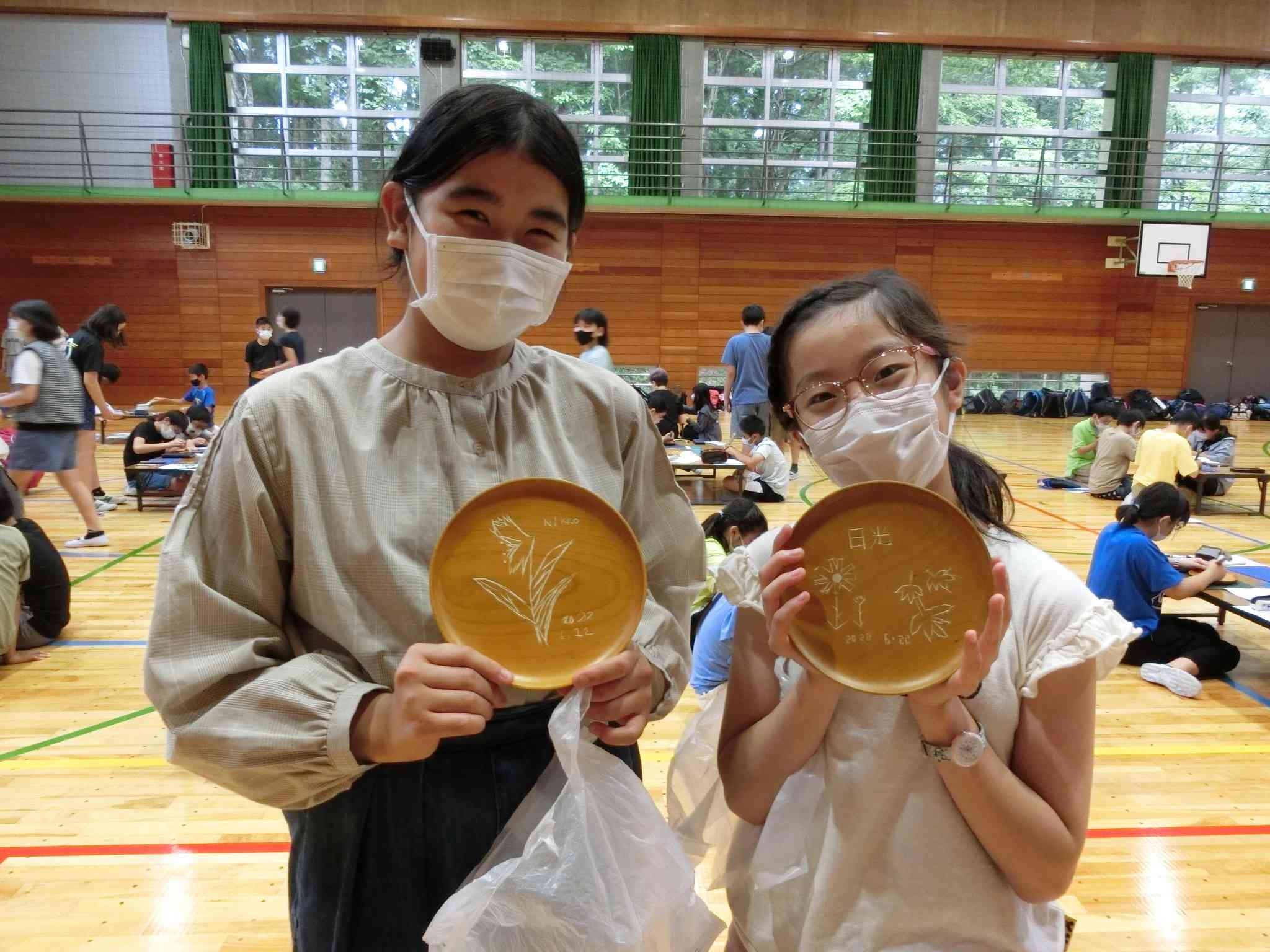 午後は、宿舎の体育館で日光彫りを体験しました。 日光彫りで使う道具は、図工の授業で使っている彫刻刀とは違います。 普段使っている道具と違うことに苦戦しながらも、事前に一人一人考えてきたデザインを彫りました。 また早く終わった人は自主的に掃除をしたり、片付けも協力して行ったりと、とても立派な姿でした。