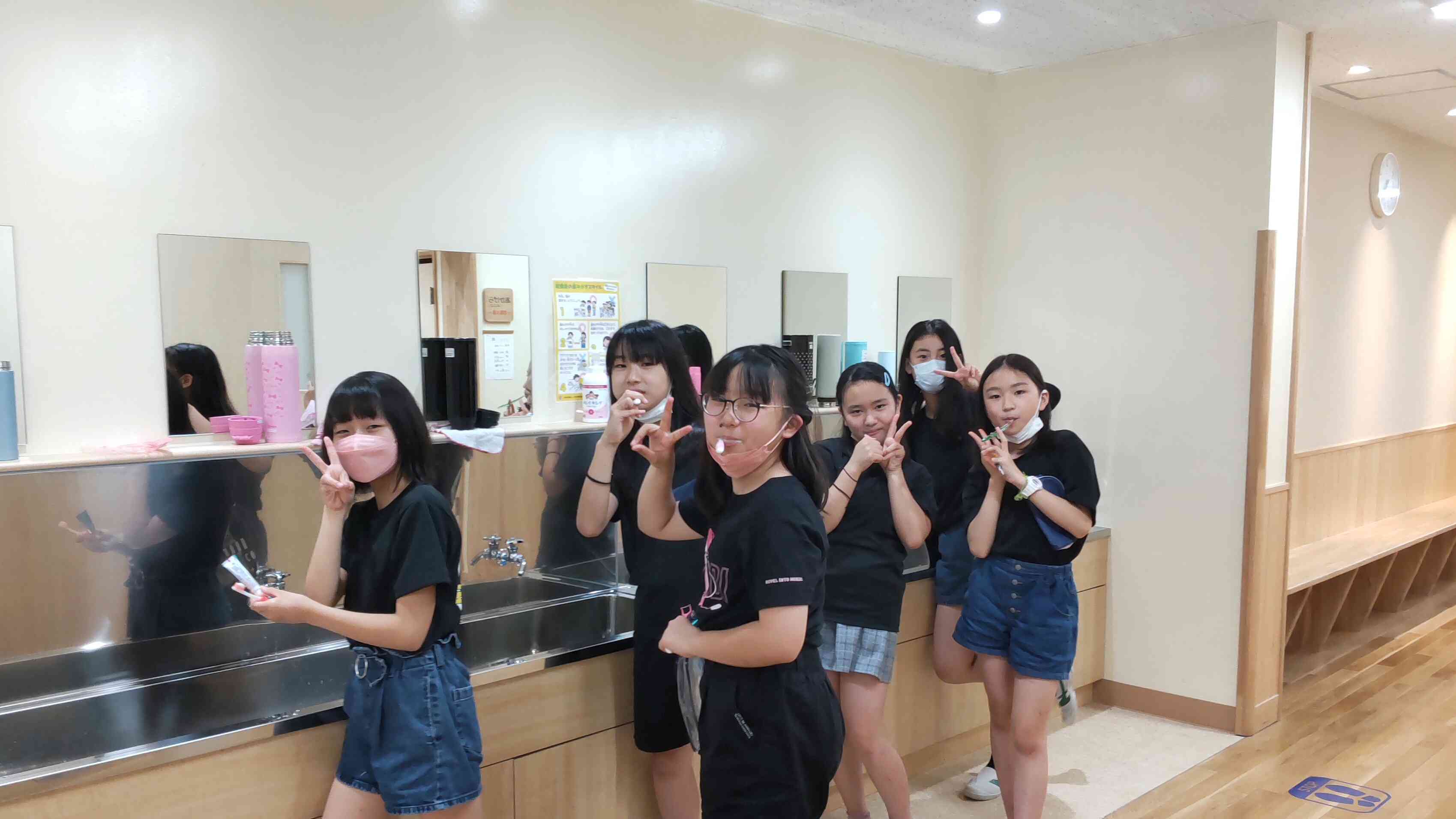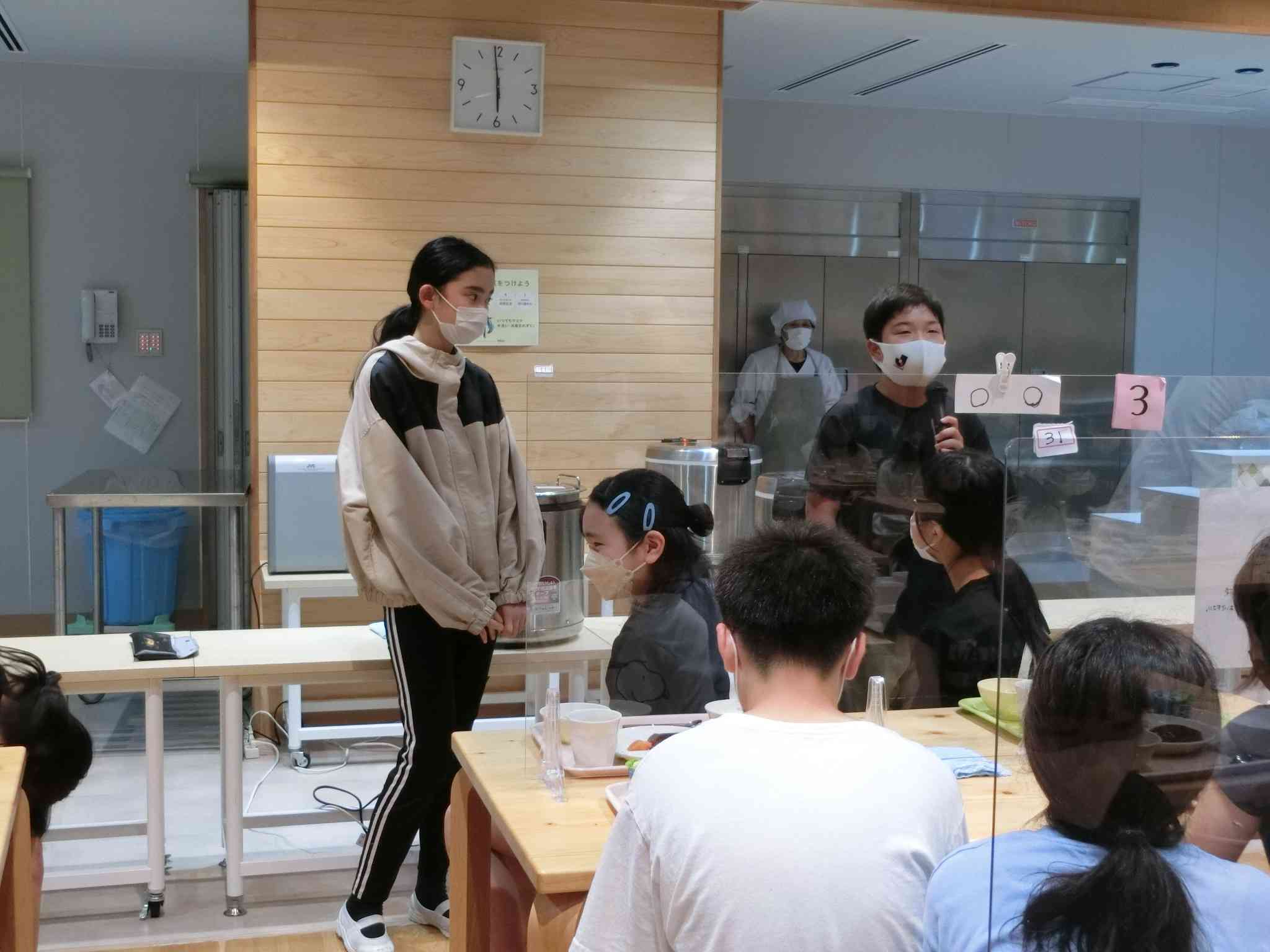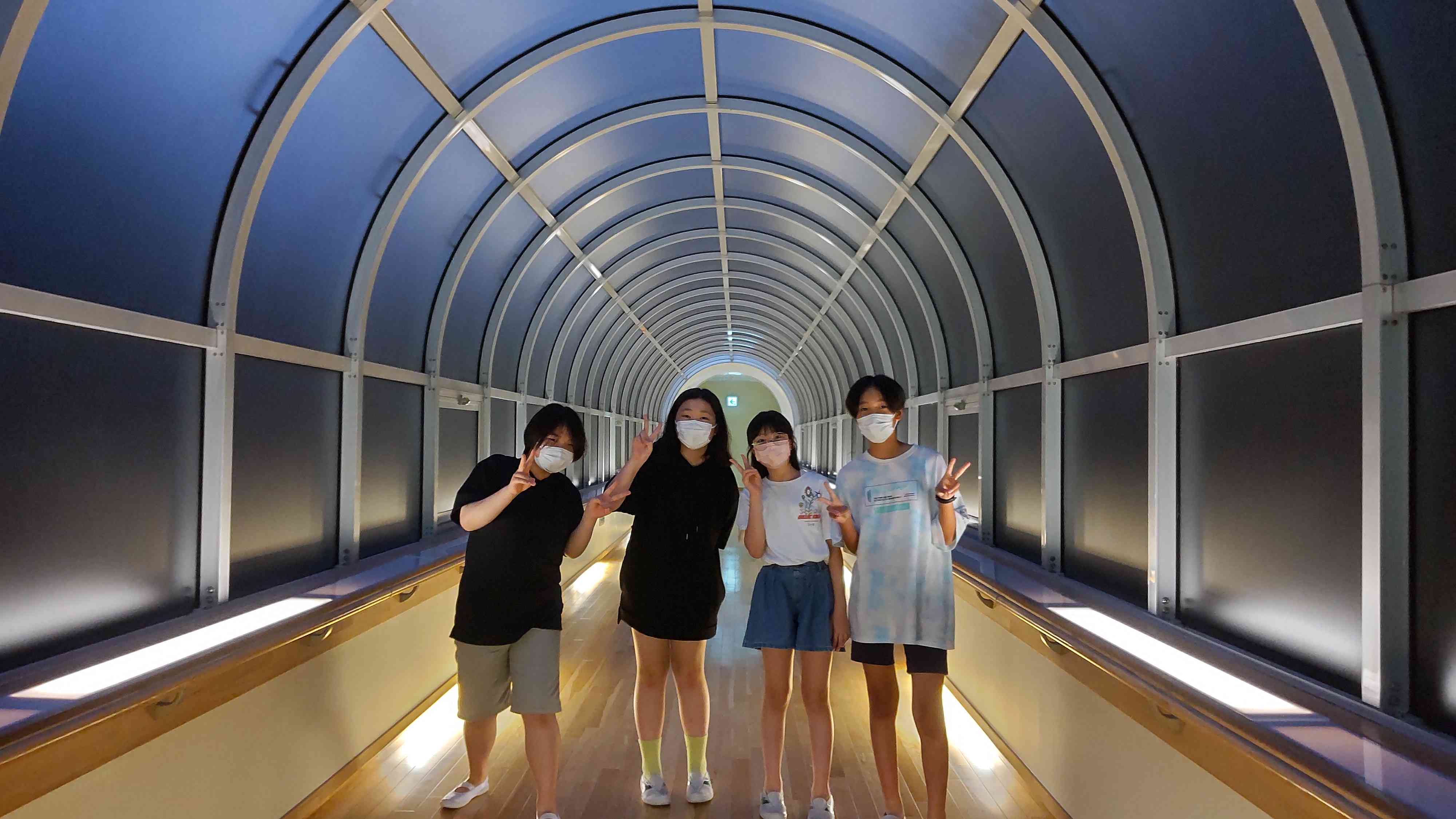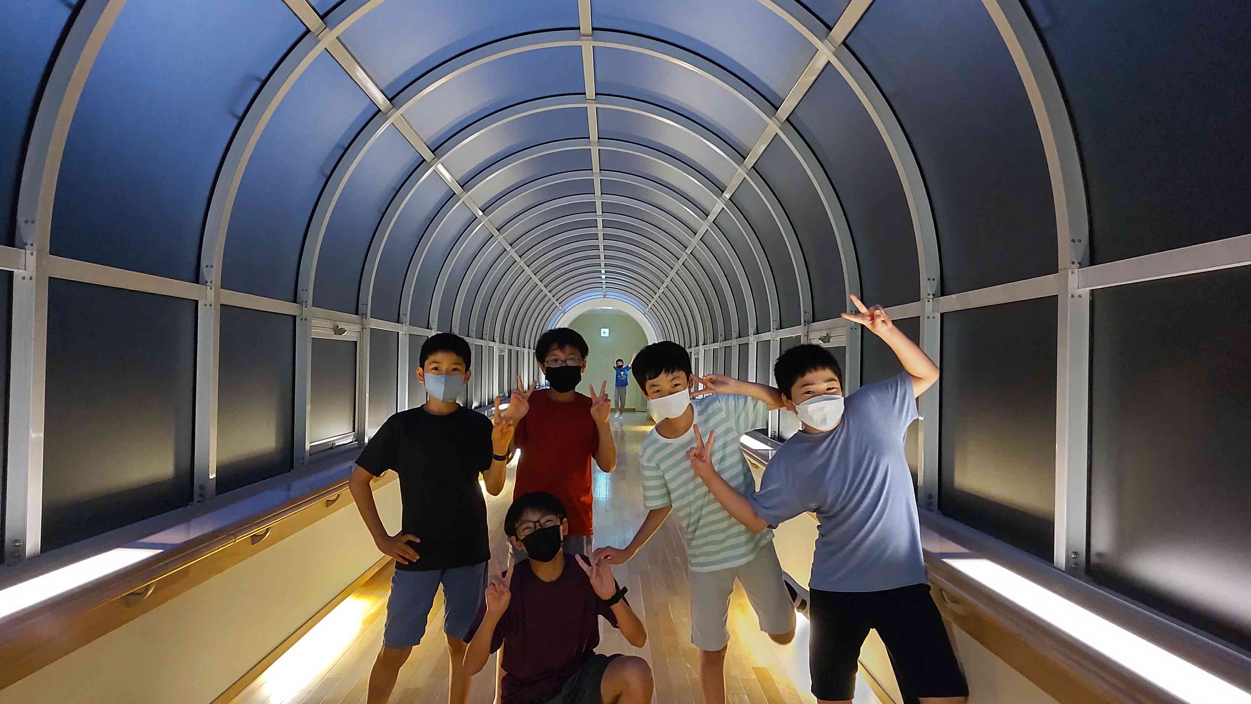 宿舎に戻ってきて、自由に部屋で過ごし、入浴を済ませ、夕食を食べました。 今日の夕食には、日光ならではの「揚げ湯葉」が入ったスープがでました。 この後は、体育館でレクリエーションがあります。 昨日も体育館に続く渡り廊下を通りましたが、昼間だったこともあり、昼とは違う夜の幻想的な雰囲気の渡り廊下にテンションも上がっています。