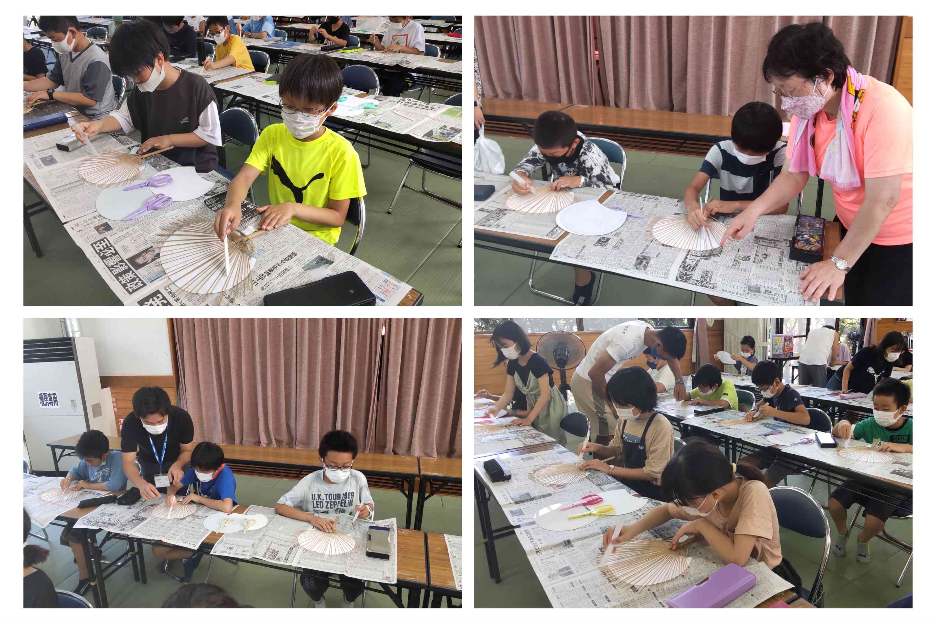 日本三大うちわの1つである、房州うちわ作りを体験しました。 竹に糊を付け裏紙が貼られた状態で渡されたうちわに、こどもたちがヘラで竹の間隔を揃え、表紙を貼りました。 その後、型紙で下書きをし、はみ出した部分をハサミで切り、縁を糊の付いた和紙で貼りました。 細かい作業は手伝ってもらいながら、房州うちわを作ることがあっきました。