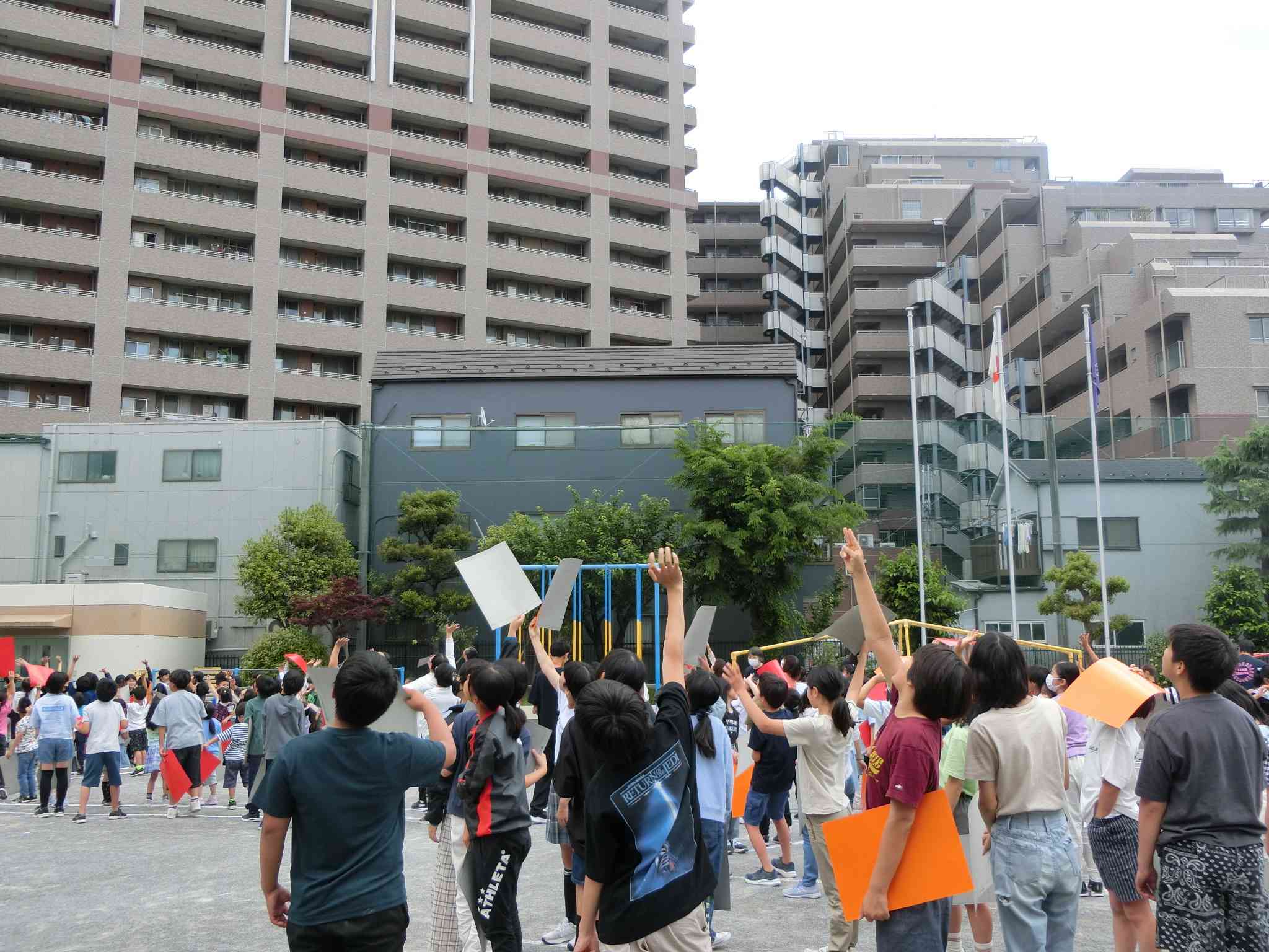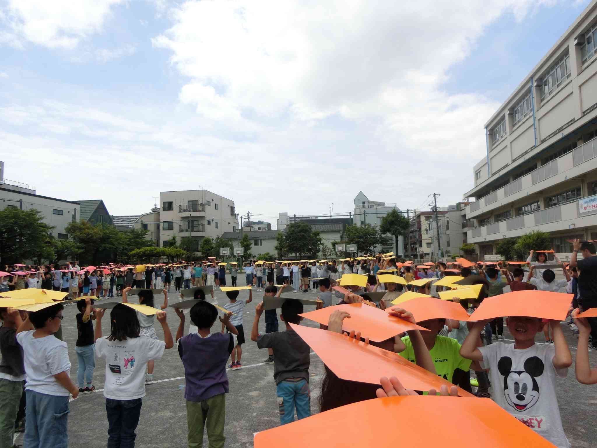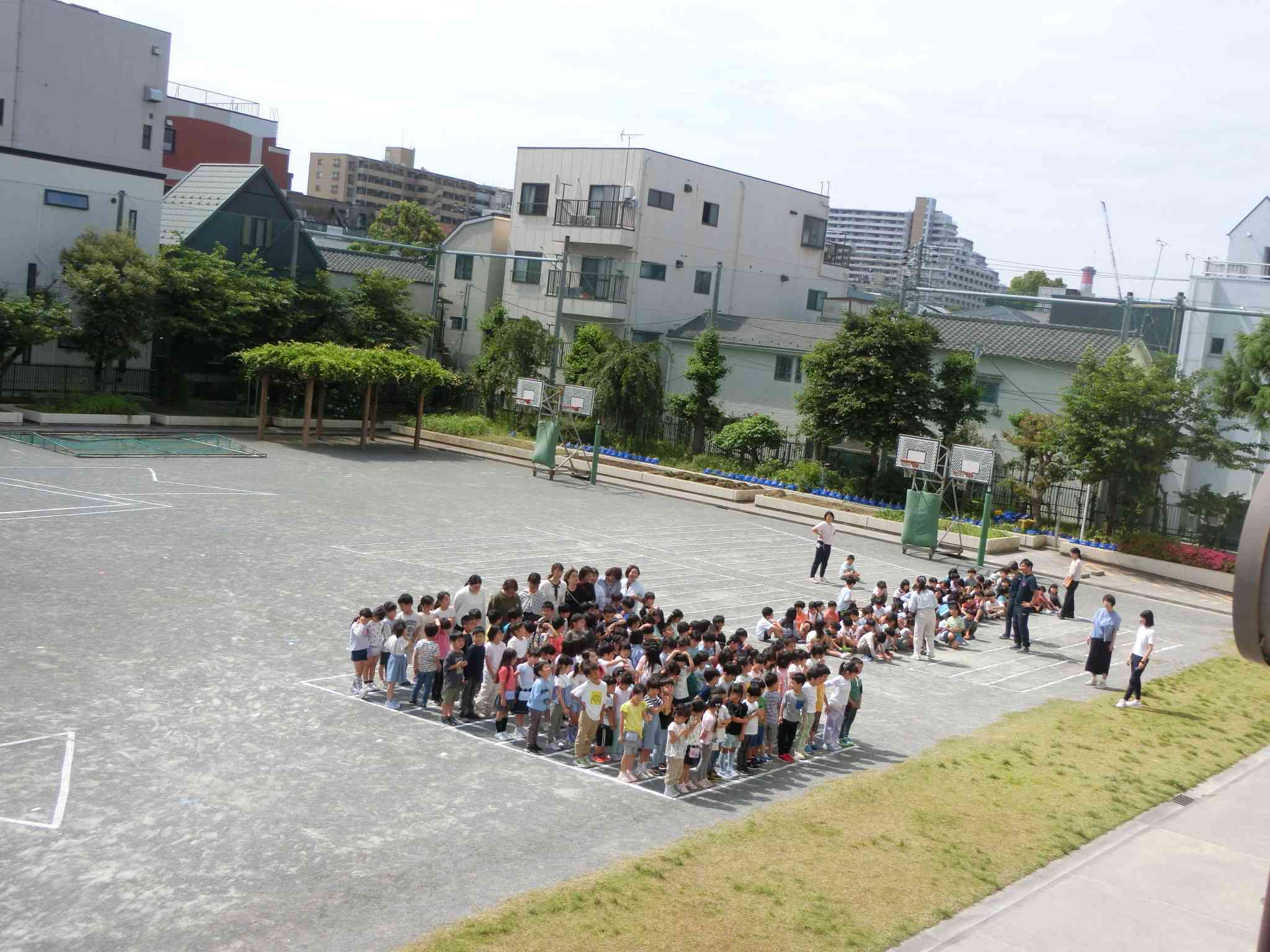 本日、5月22日(水)の午前に開校95周年の全校写真と学年写真、航空写真を撮影しました。 周年行事が2回目の6年生のこどもたちからは、「90周年の時、赤色だった〜」や「家でファイル使ってる〜」など、1年生の時のことを思い出している会話も聞こえてきました。 こどもたちはヘリコプターの音が気になりながらも頑張って頭の上に紙を置いたり、最後はヘリコプターに手を降ったりしていました。 全校で集合して写真を撮るのは、周年行事がある年ならではの活動です。 今回の航空写真のデザインは、今年の3年生の子が考えたものでした。 出来上がりが楽しみです♪【添付ファイル】