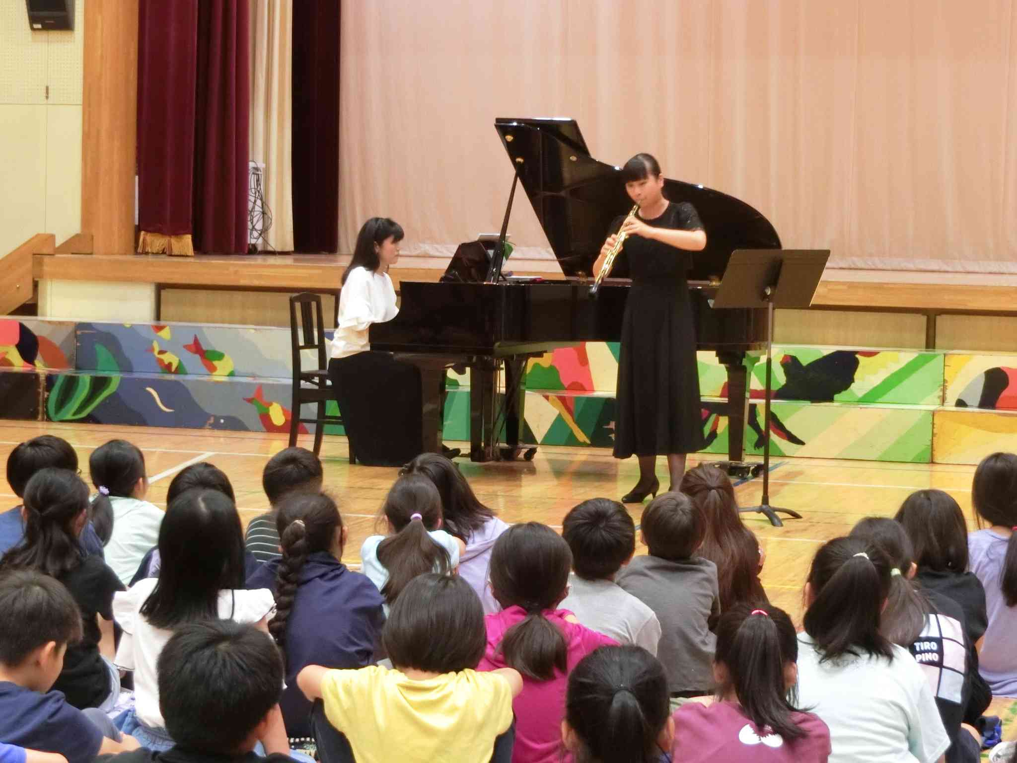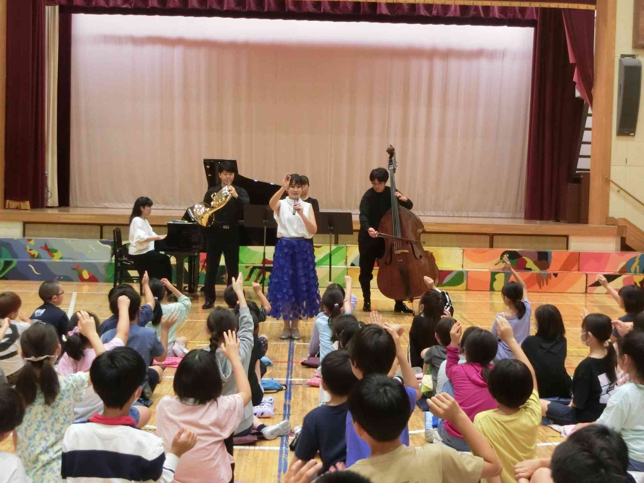来月の本公演に向けて、5月23日(木)5・6校時に、4年生を対象に事前ワークショップとして、ミニコンサートがありました。 これは、文化庁の「学校における文化芸術鑑賞・体験推進事業 舞台芸術等総合支援事業(学校巡回公演)」に応募し、採択されたものです。 今回は、パシフィックフィルハーモニア東京から、コントラバス、オーボエ、ホルン、ピアノの方に来ていただき、オーケストラでの各楽器の魅力や役割、楽器の特徴などを教えてもらい、各楽器の音色に注目しながら演奏を聴きました。 特に、金管楽器のマウスピースだけでアンパンマンマーチを演奏している姿に、こどもたちは驚いていました。 また、4つの楽器による校歌の演奏に合わせて歌ったり、指揮者体験をしたりしました。 こどもたちの感想を見てみると、「吹く楽器は息をたくさん使うから難しいと思っていたけど、オーボエは息があまって苦しいということを初めて知った」や「どの楽器の音色も響いて美しかった」など、実際に話を聞いたり、演奏を聴いたりしたからこそわかったことや気付いたこと、感じたことが多かったようです。 本公演は、6月21日(金)5・6校時に3〜6年生を対象に、60人編成のオーケストラが本校に演奏しに来てくれます。 一足先に楽器の響きを味わった4年生のこどもたちは、今から本公演を楽しみにしています。【添付ファイル】