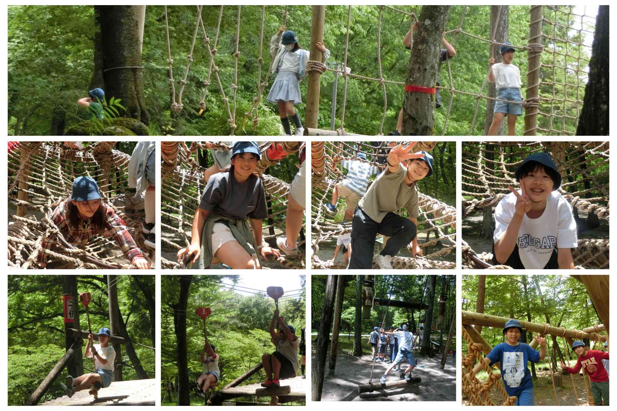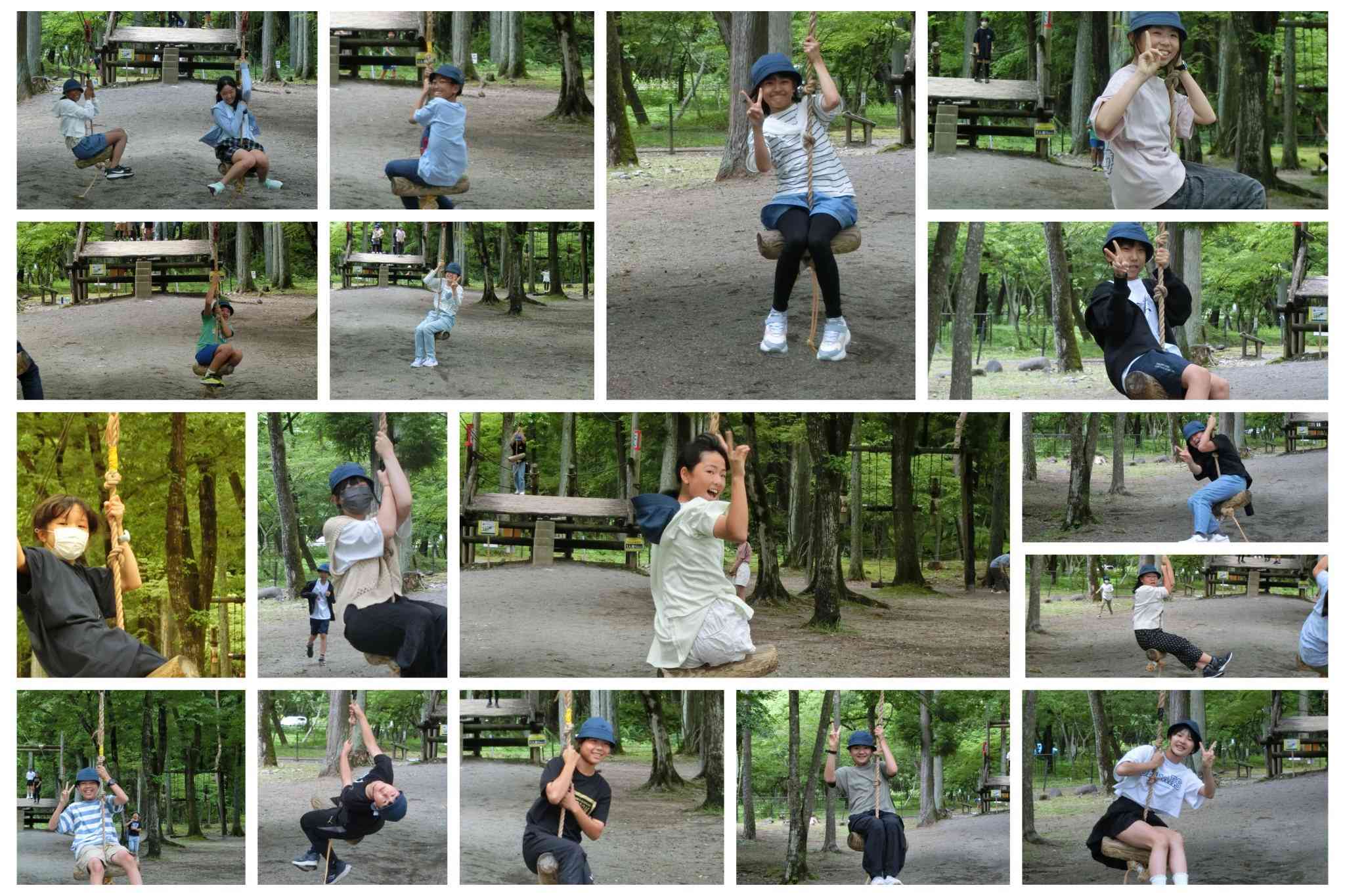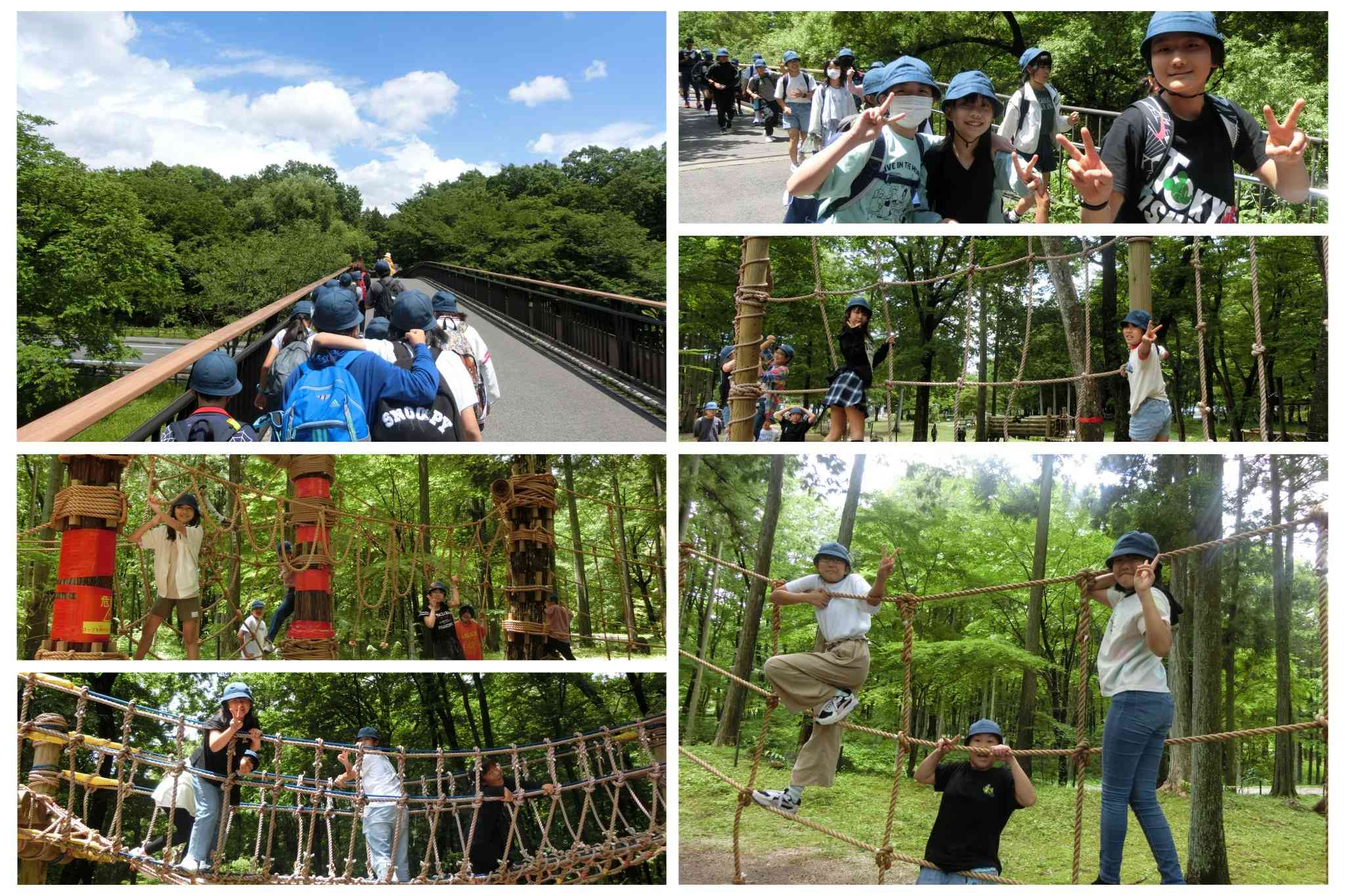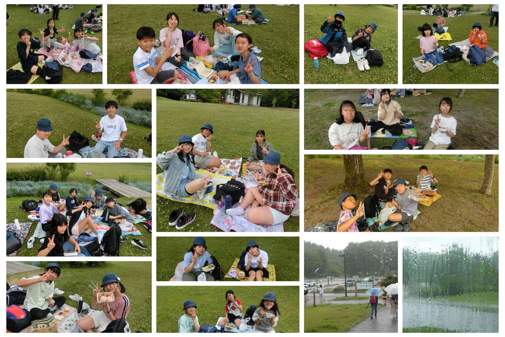 だいや川公園のフィールドアスレチックに行ってきました。 こどもたちは、「楽しい!」や「怖い!」という声や「助けて〜」や「こうやるといいよ!」など助け合う声が飛び交う中、アスレチックを楽しんでいました。 お弁当では、「昨日、明太子のおにぎりにしてとお願いしたんだ〜」や「自分で作ったよ」など会話を楽しみながら食べていました。 そして、食べ終わった瞬間に、バケツをひっくり返したような雨が降ってきました。【添付ファイル】