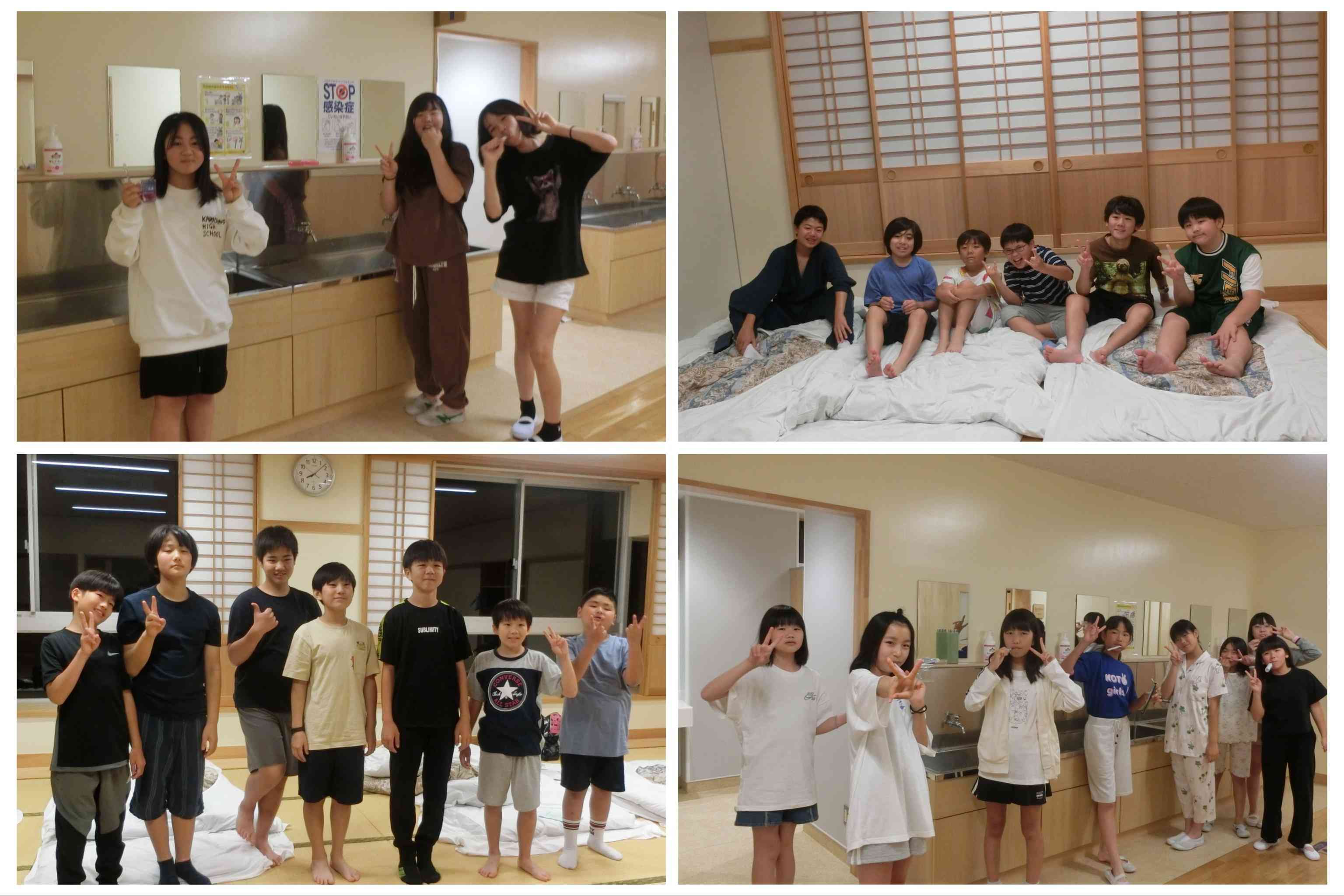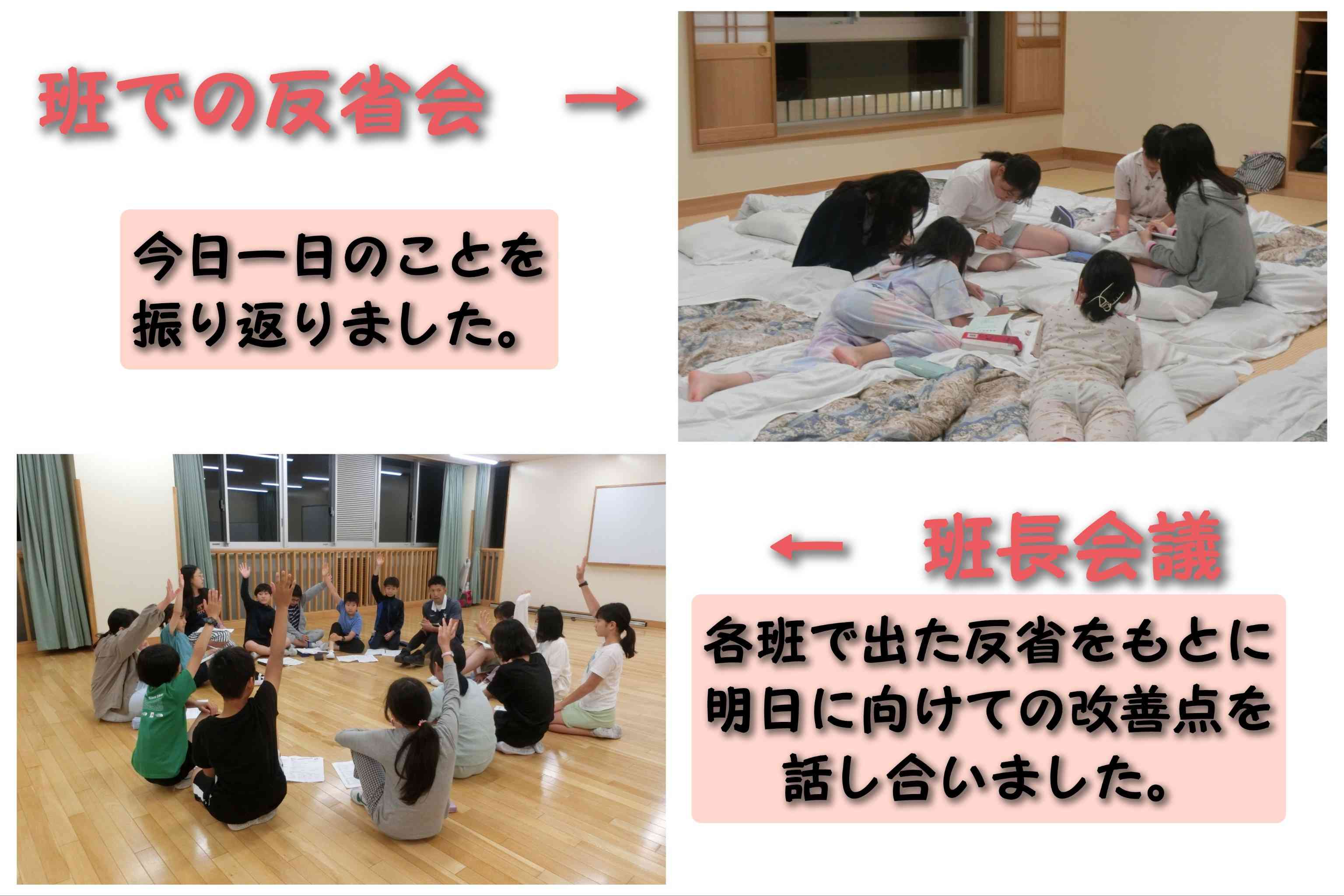 校長先生のこわ〜い話から始まった、肝試し。 行く前から涙目の子や「キャー」と叫びすぎたからか喉が痛くなった子などいましたが、みんな楽しんでいました。 肝試しのあとは、各班で反省会をし、そこで出た反省をもとに班長会議で明日に向けた振り返りをしました。 いろいろな学校で一緒に行っいるカメラマンさんからは、自分たちで話し合いを進めているレベルの高い班長会議だったと話していました。 明日に向けて、おやすみなさい☆【添付ファイル】