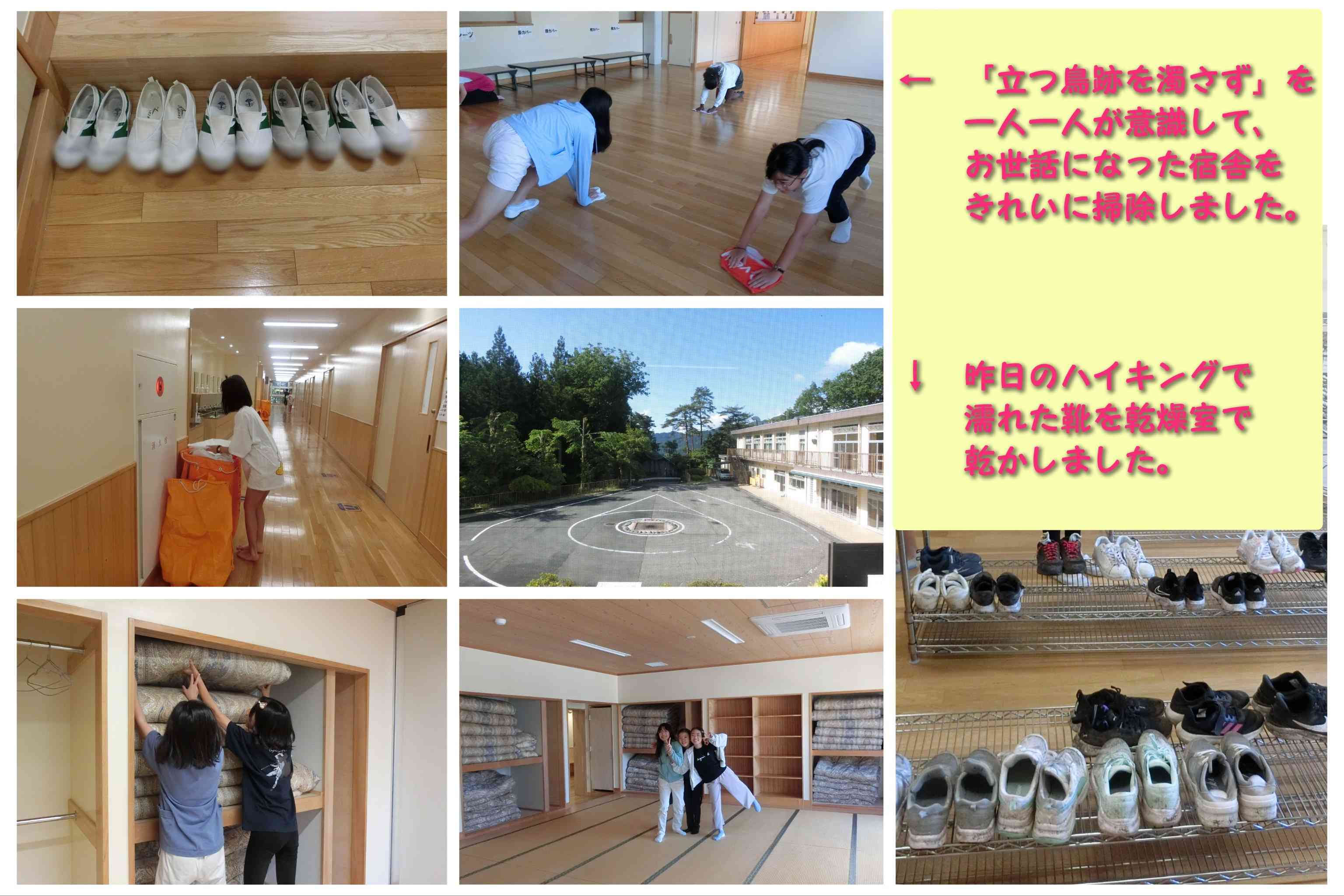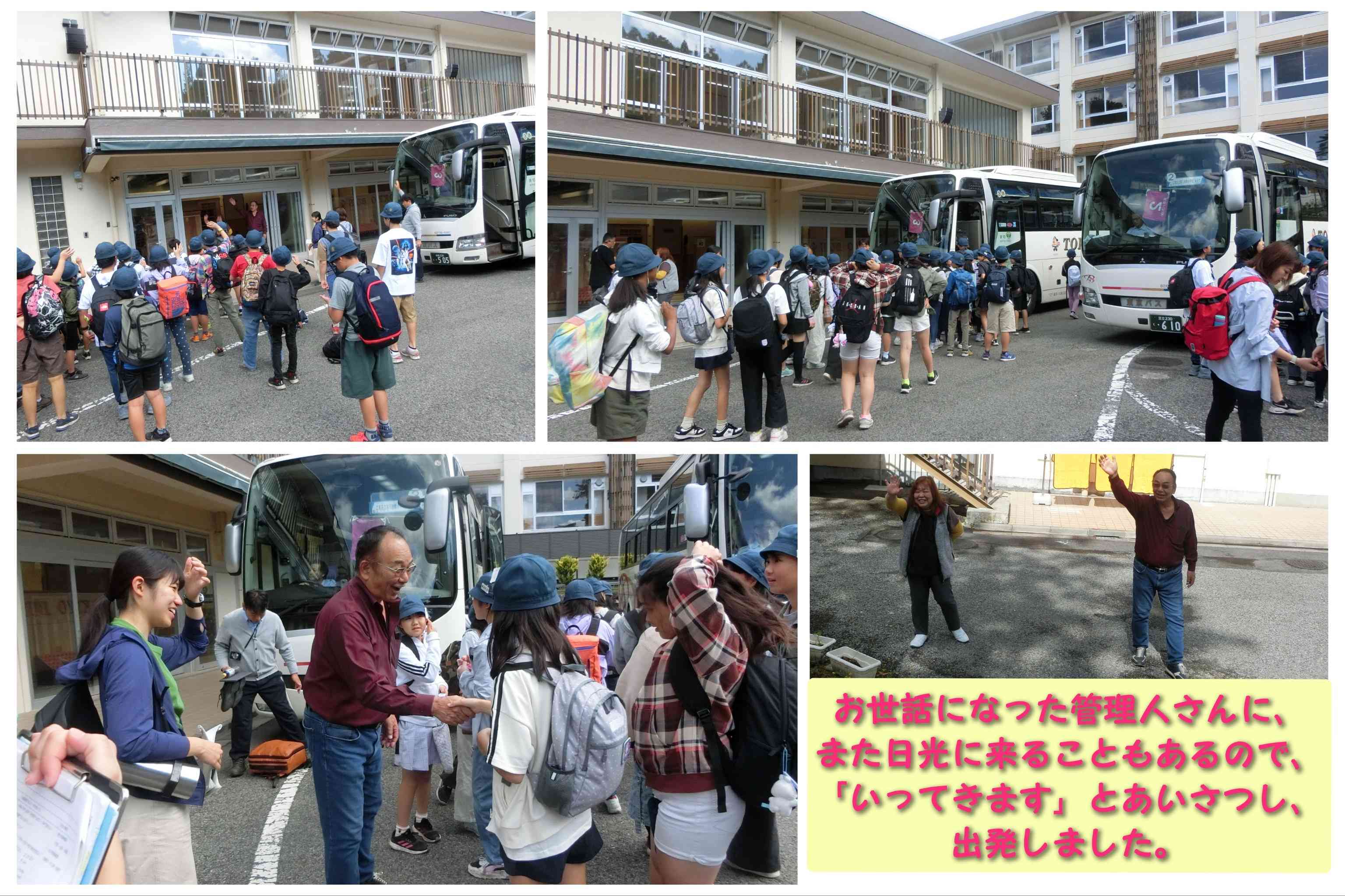 今日の日光は、晴れています。 昨日のハイキングの疲れから、朝なかなか起きられない子もいましたが、起きてからはテキパキとシーツや布団を畳んだり、荷物の整理をしたり、掃除をしたりしました。 閉校式では、お世話になった管理人さんにしっかりとお礼の気持ちを表していました。 ※3日目の日記が遅れてしまい、申し訳ありませんでした。 大きな怪我や病気もなく、みんな元気に過ごしています!【添付ファイル】