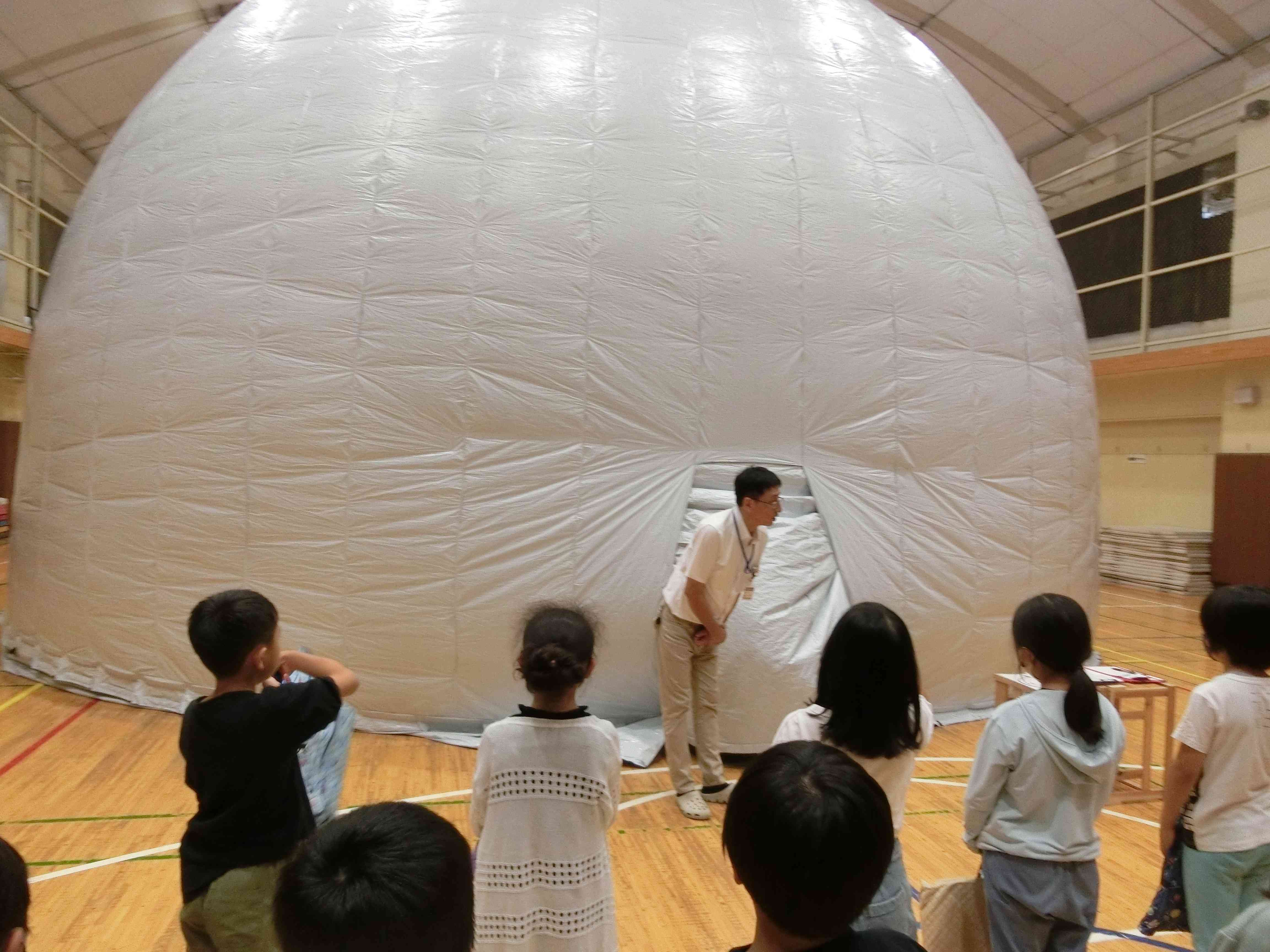7月4日(木)に体育館にて、プラネタリウム体験を行いました。体育館に大きなドームを設置して、子供たちはその中に入り、思い思いに星空を観察しました。太陽や月の動きや夏の星座について、黄道十二星座や北極星ついてなど、様々な天体についての解説を聞きました。見つけた星座を指さしながら、楽しそうに気づいたことを次々と話す姿が見られました。 鑑賞後の感想では、星座が88個もあることや、普段は見えないけれど本当はたくさんの星があることに驚いた、と星について驚いたり興味がわいたりしたことを振り返りとして書いていました。【添付ファイル】