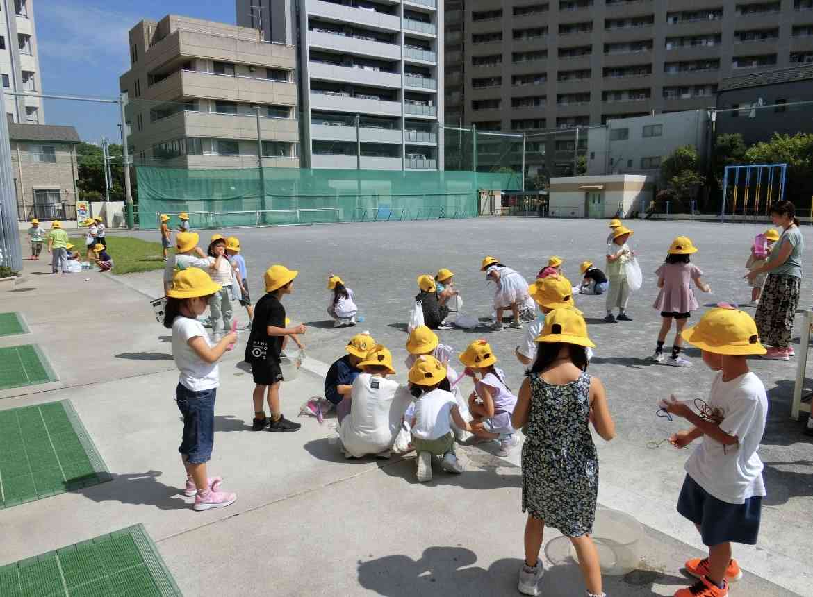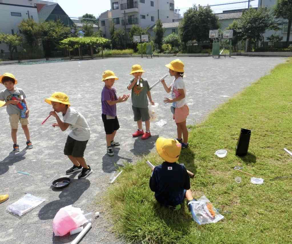 本日は、生活科の授業でしゃぼん玉遊びをしました。 使う道具によって、しゃぼん玉の大きさや形に違いがあることに気付き、楽しむことができました。