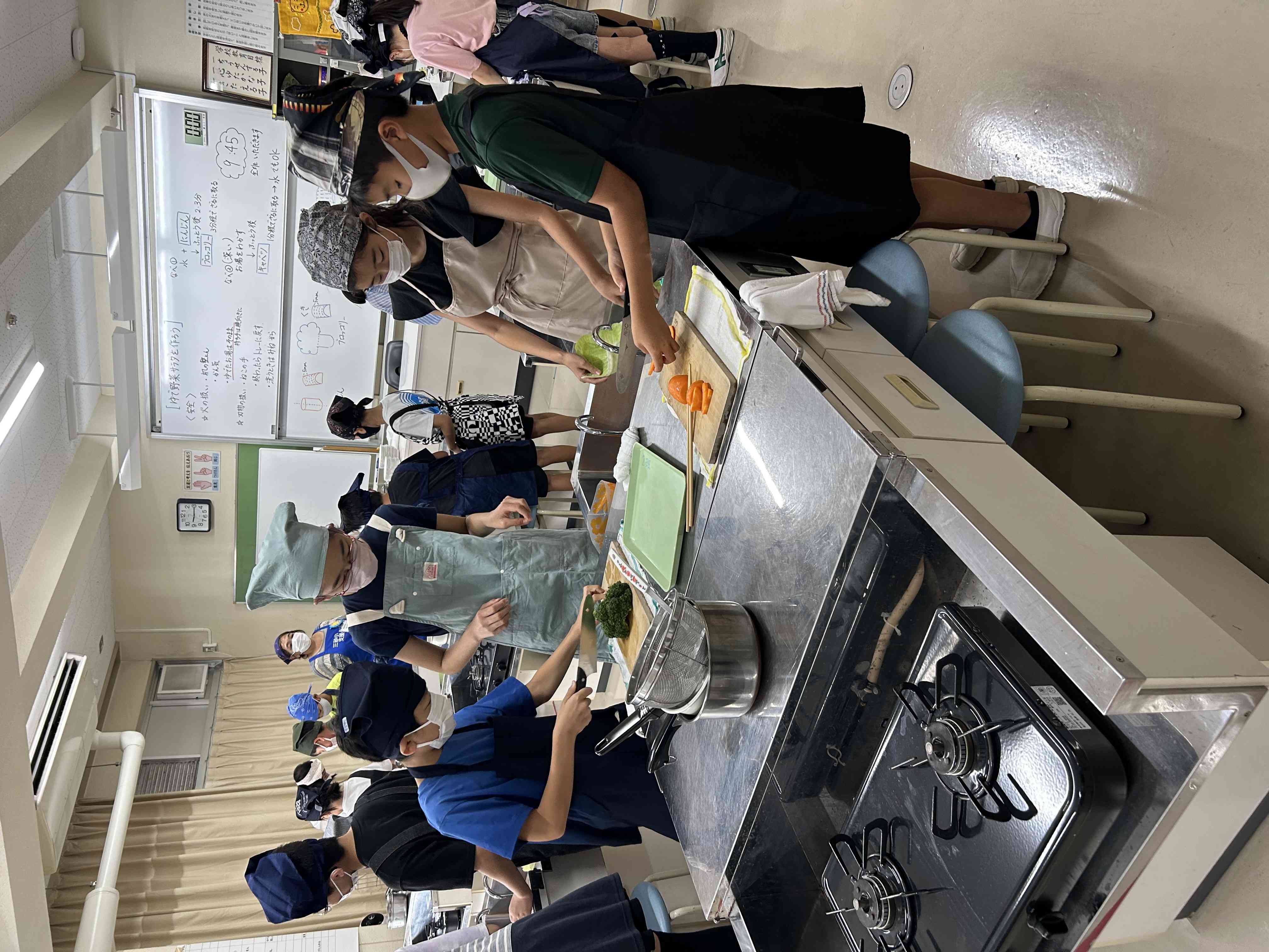 家庭科では、「野菜をゆでる」実習を行いました。班で協力して野菜を洗ったり、切ったりと作業を行いました。ゆでた野菜はドレッシングをかけていただきました。