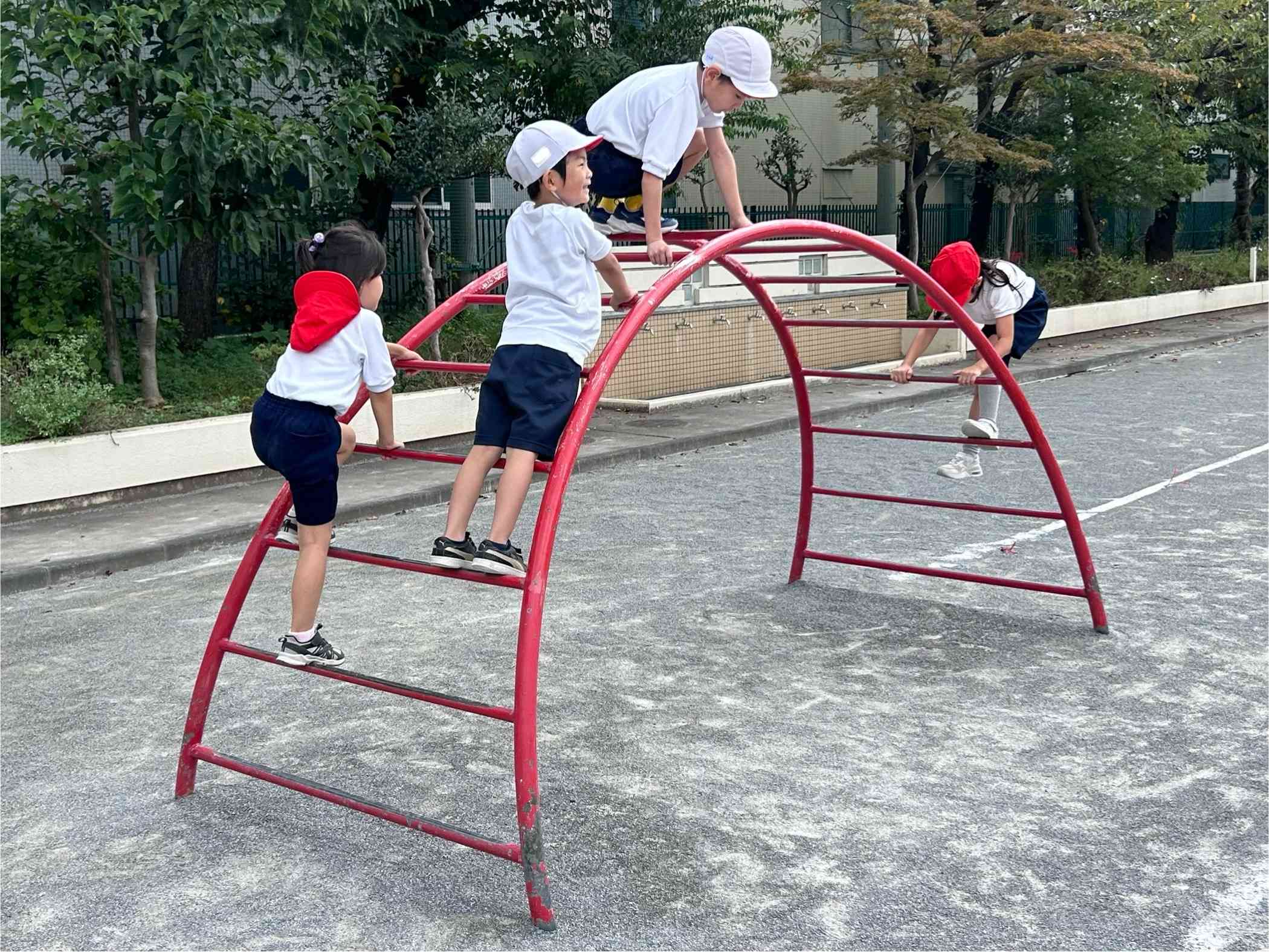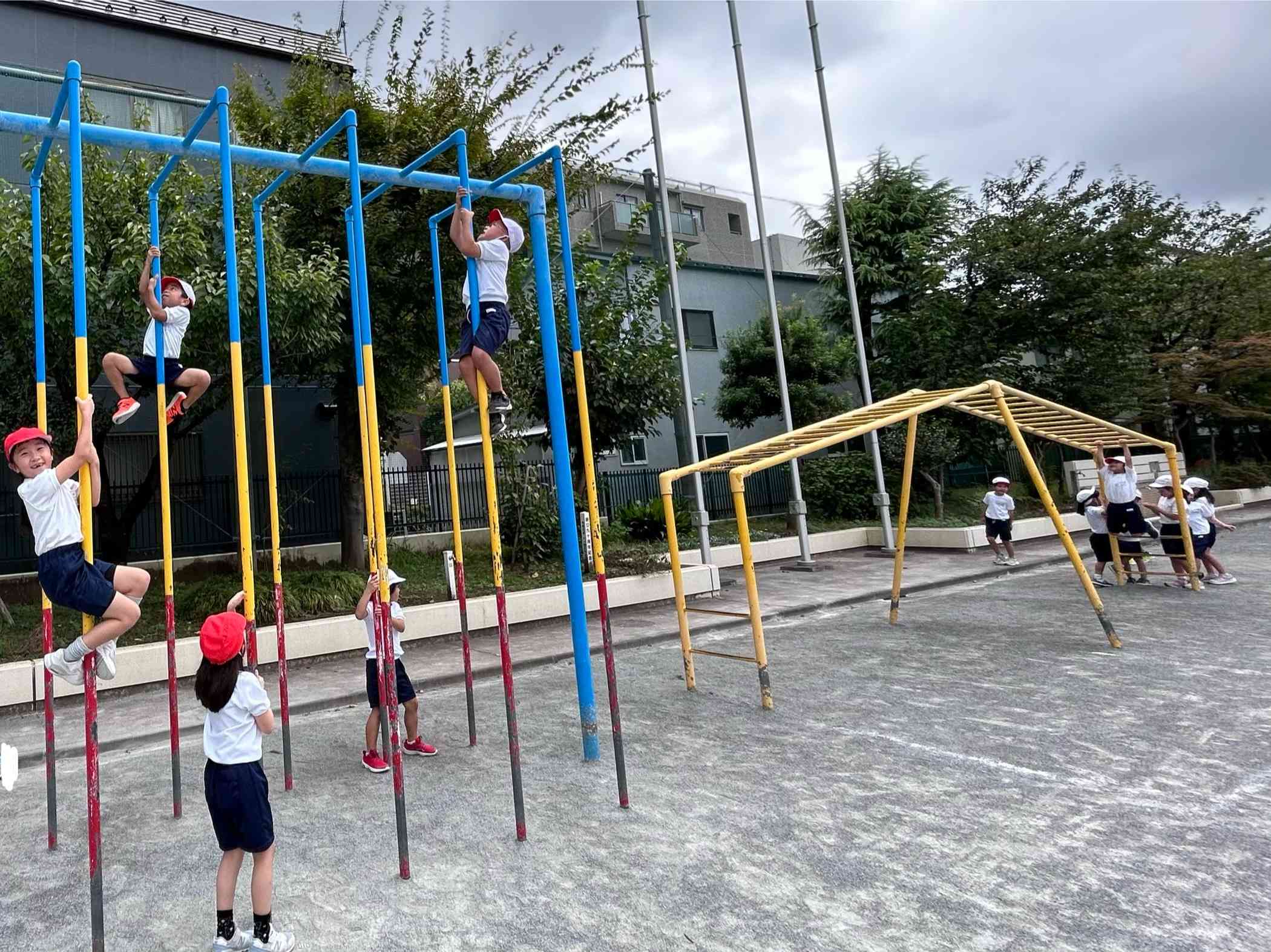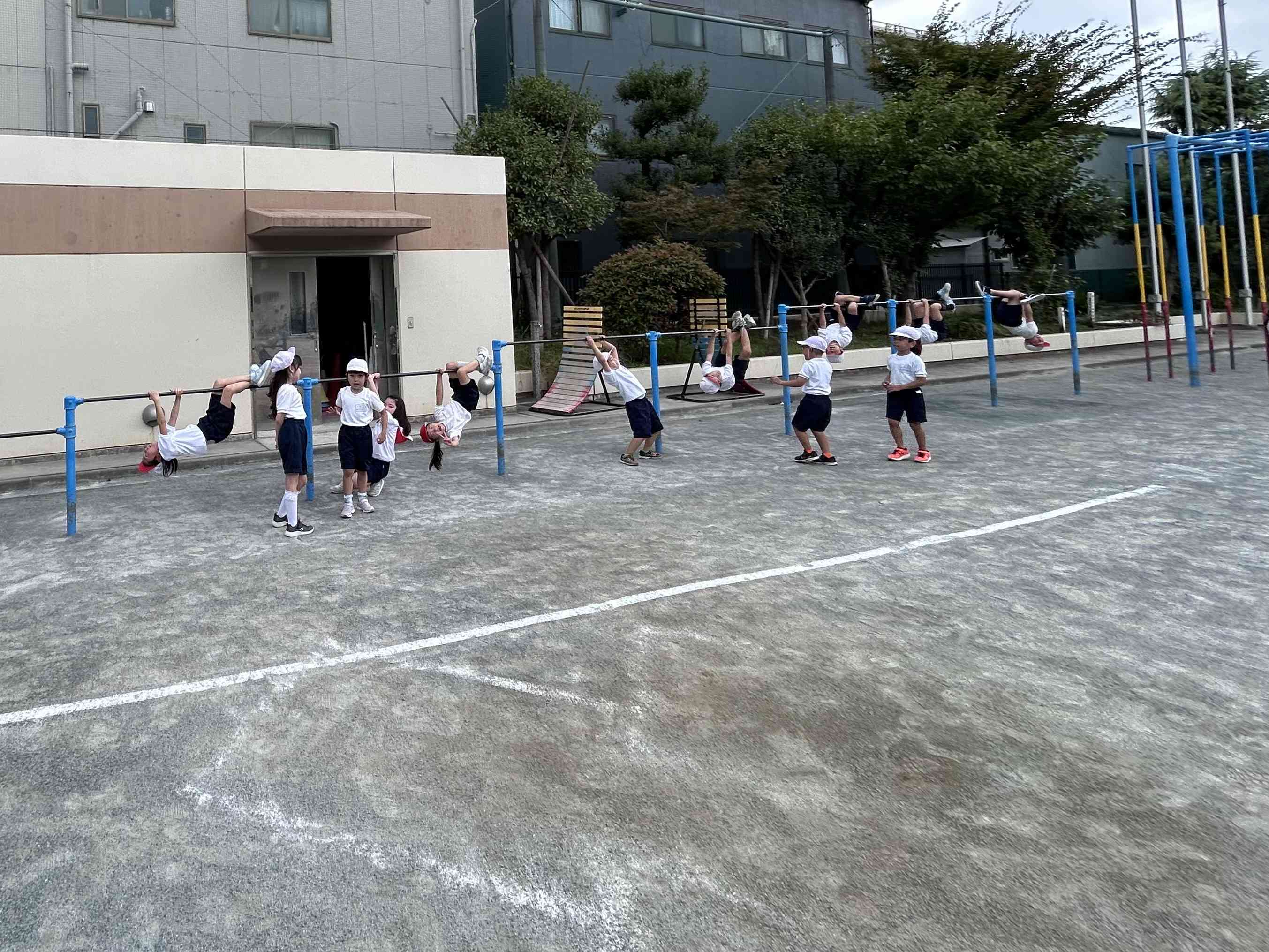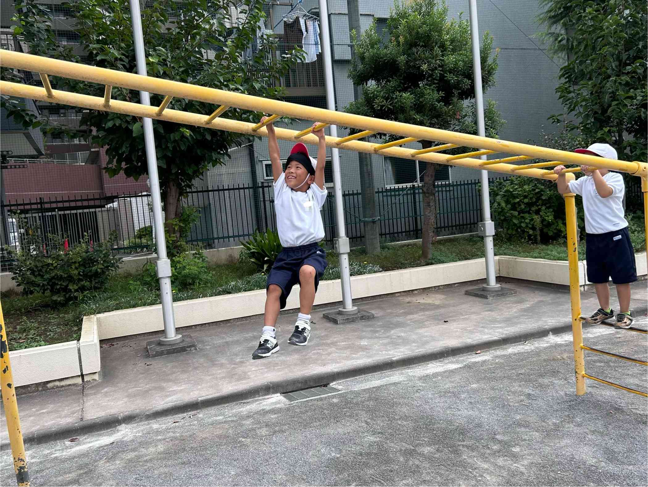 体育の学習では、固定遊具を使った運動や鉄棒を行っています。 初めは難しかったことも、何度も挑戦していくうちにできるようになりました。 できるようになったことを「見て見て!」と披露してくれます。