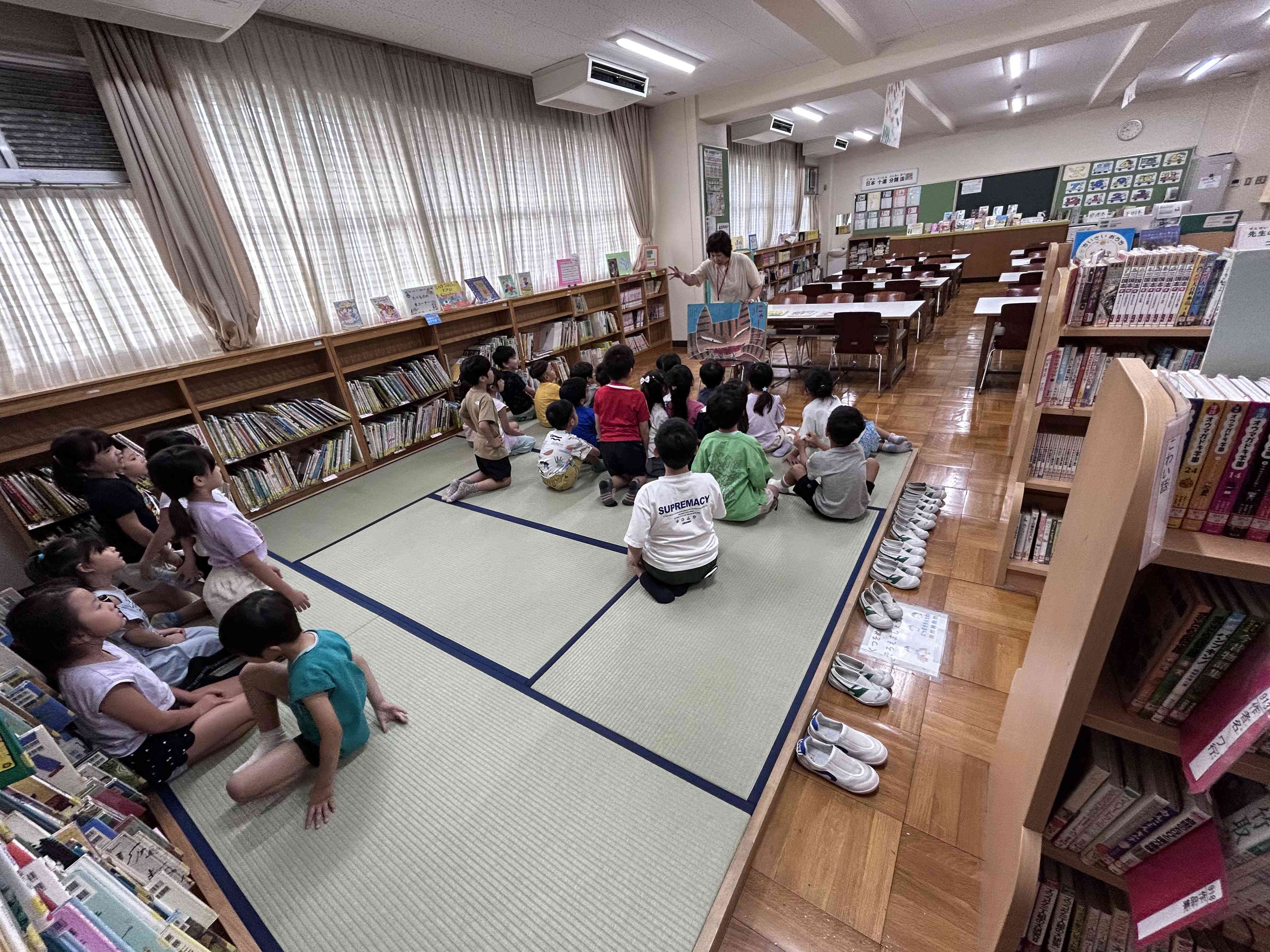 図書の時間には、本の貸し借りの他に、図書の先生が読み聞かせをして下さります。今回は『にゃーご』でした。大きいねこの「にゃーご」と小さいねずみの「にゃーご」はどんな感じかな?なりきりながらみんなで「にゃーご!」と言って楽しんでいました。
