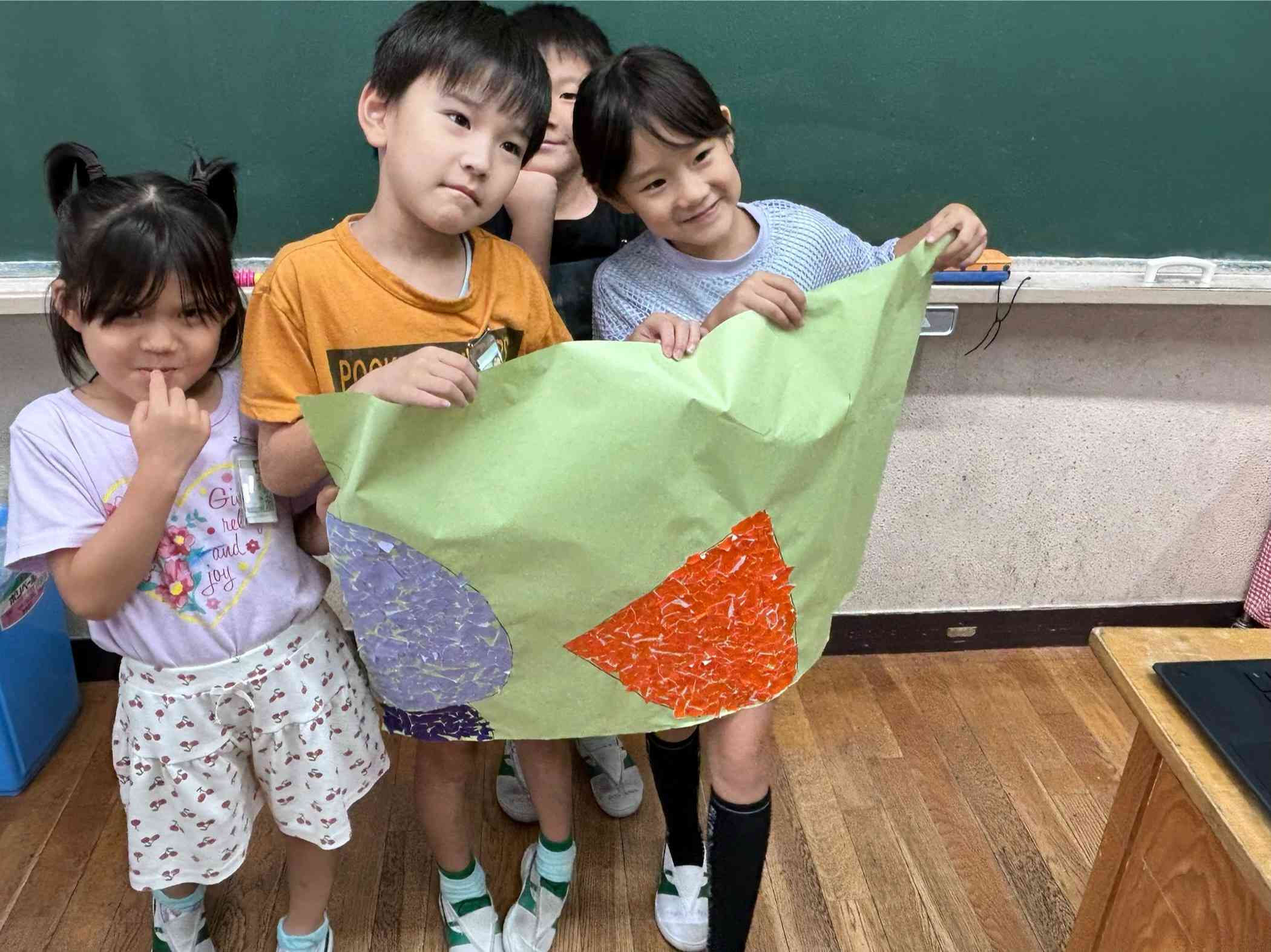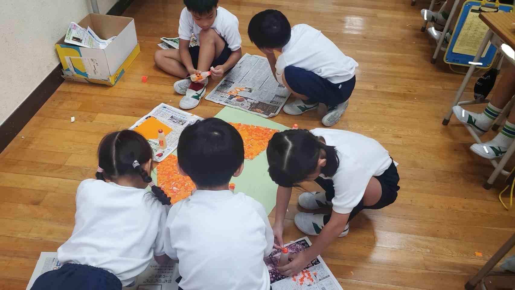 代表委員さんの企画で全校プレゼントを作っています。 各クラス持ち寄って最後は1つの絵が完成するそうです。 「何の絵になるんだろうね。」と全校の作品が集まったときを楽しみに作っていました。