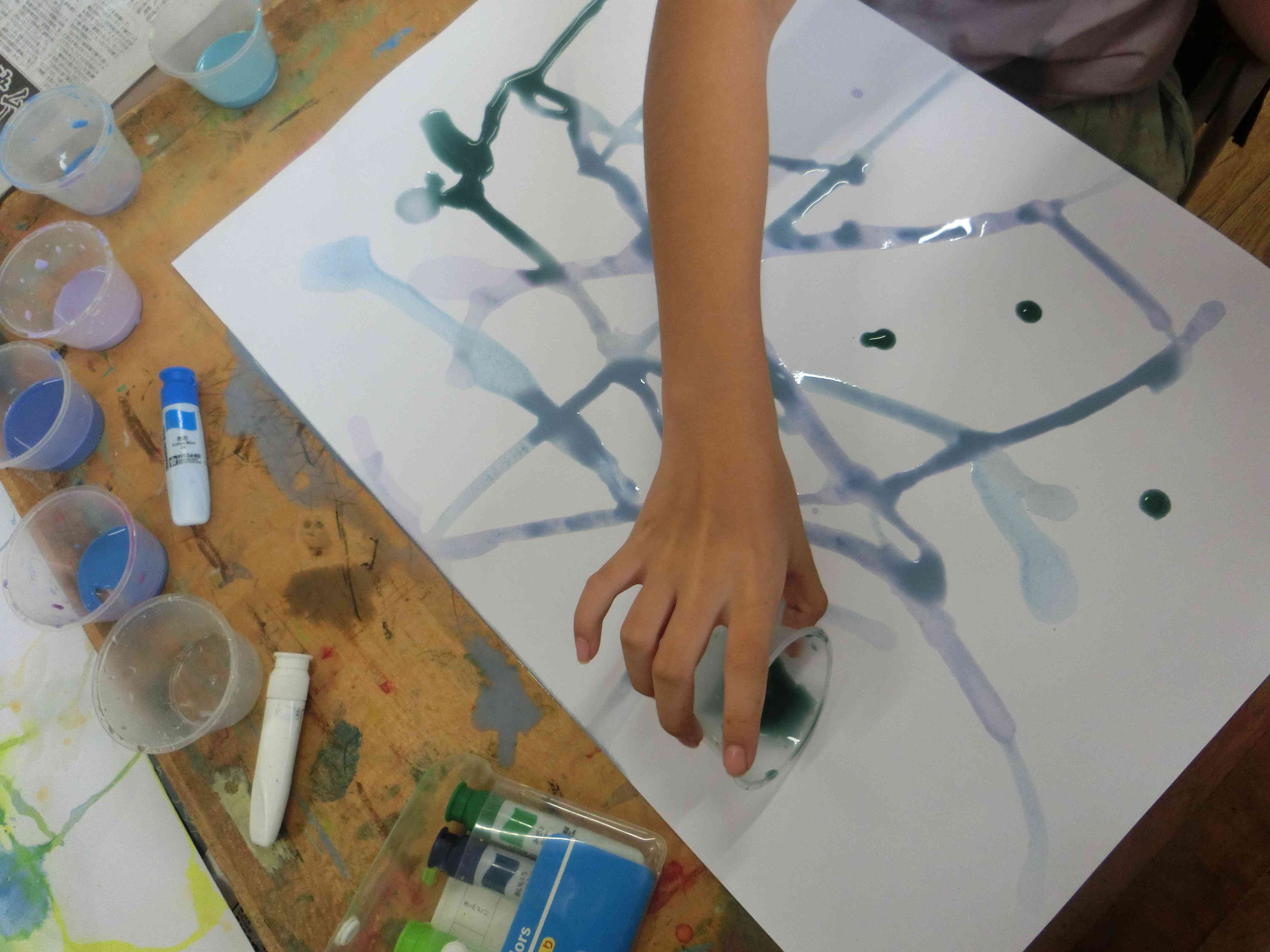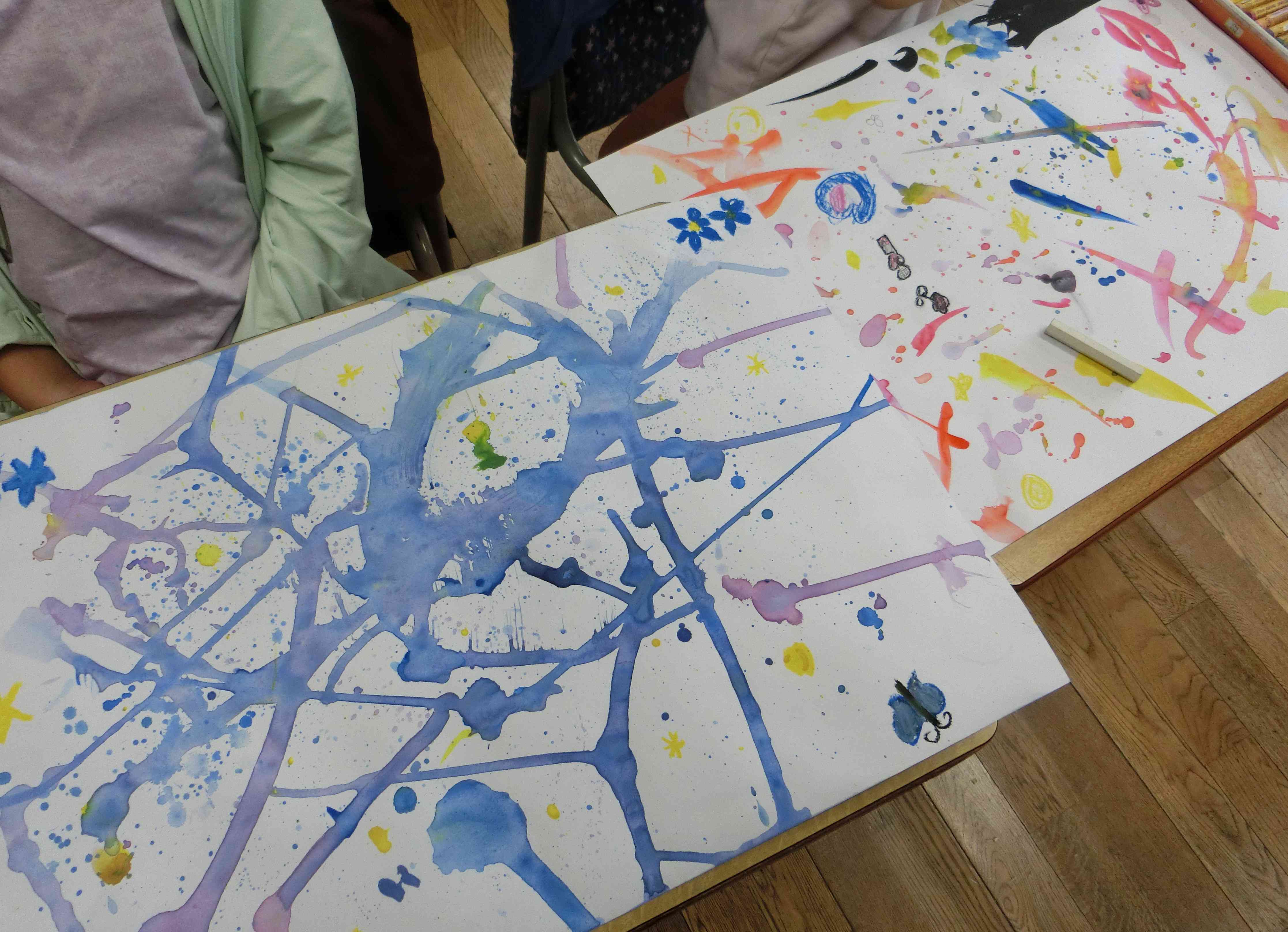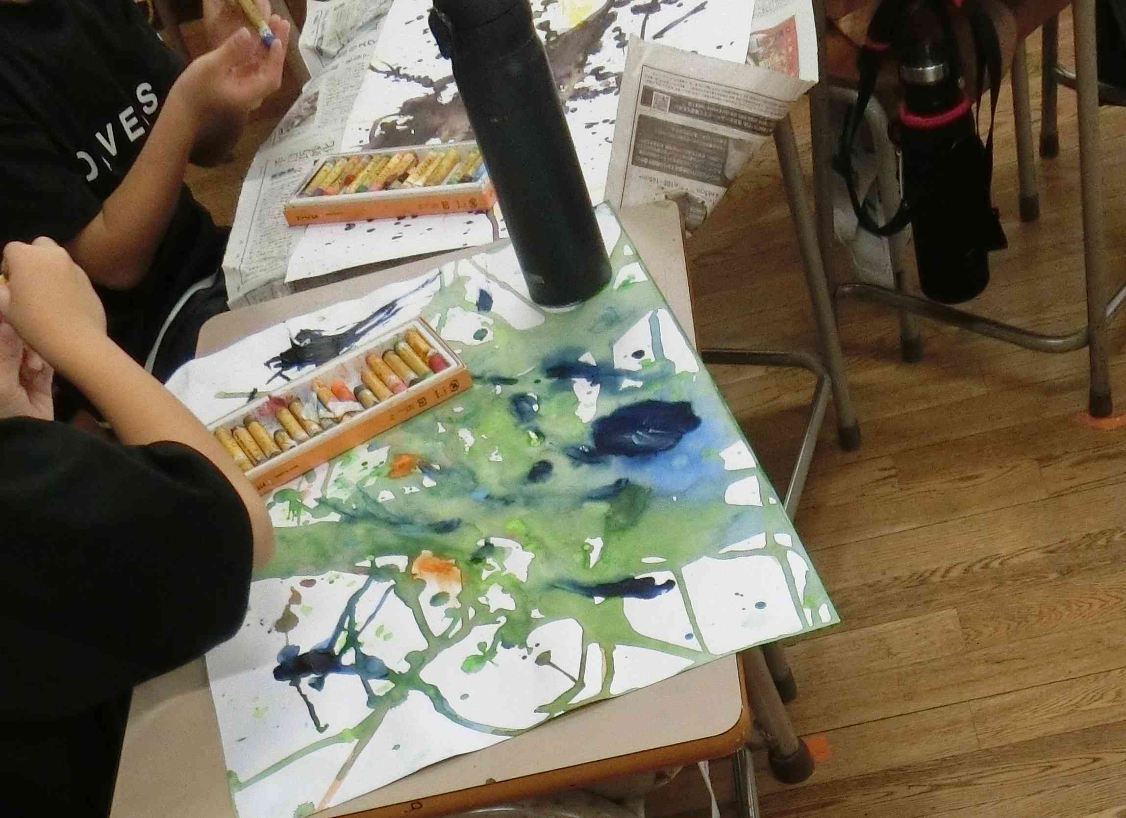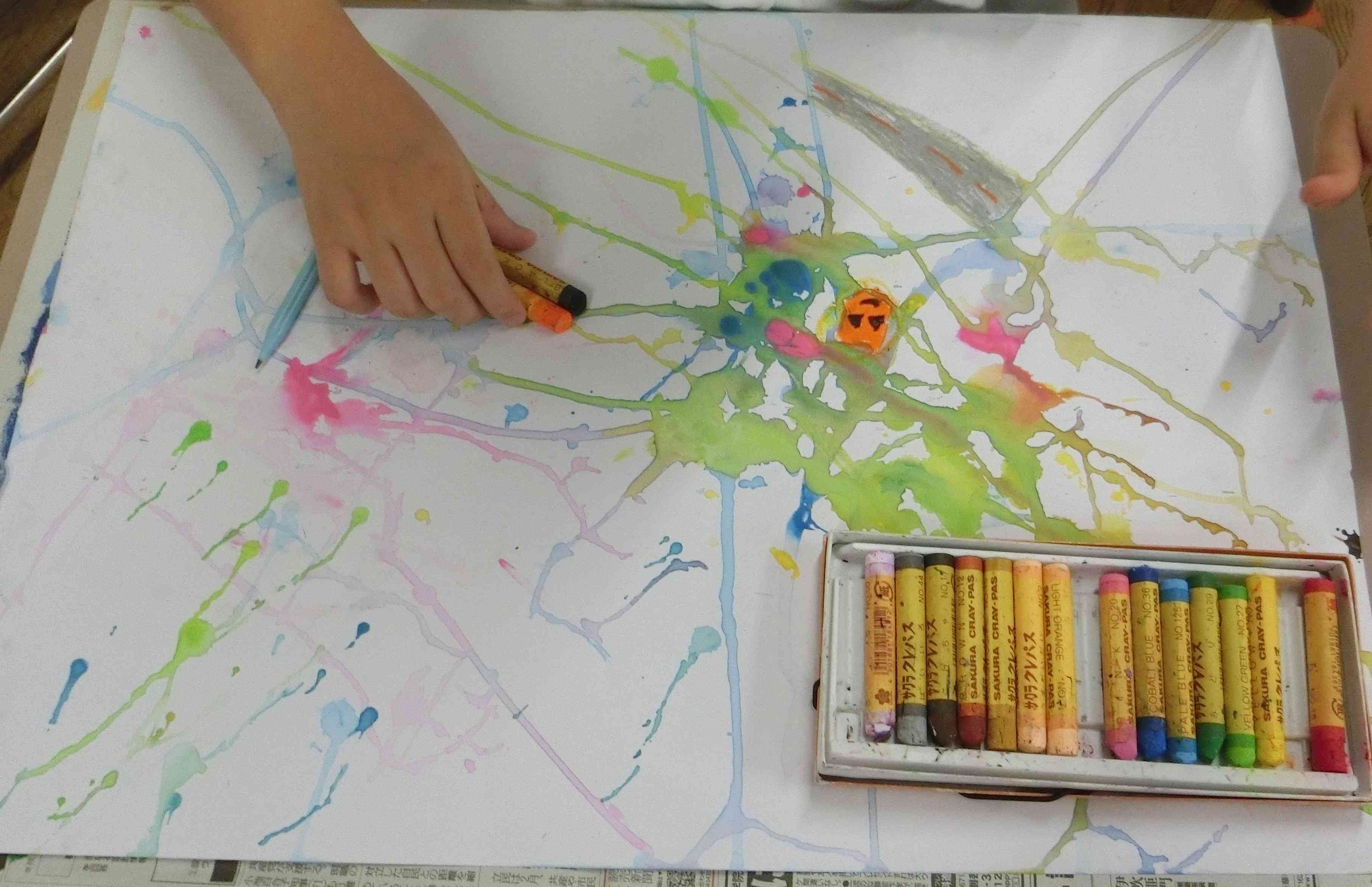 2年生の図画工作の授業「えのぐをたらしたかたちから」では、画用紙に絵の具をたらして模様をつくりました。 偶然にできた形や色の混ざり合いを楽しみ、絵の具がかわいたあとは「色合いが宇宙みたい!」「この部分が顔に見えるよ」と想像を膨らませ、クレヨンで飾りをかきこんで完成させました。
