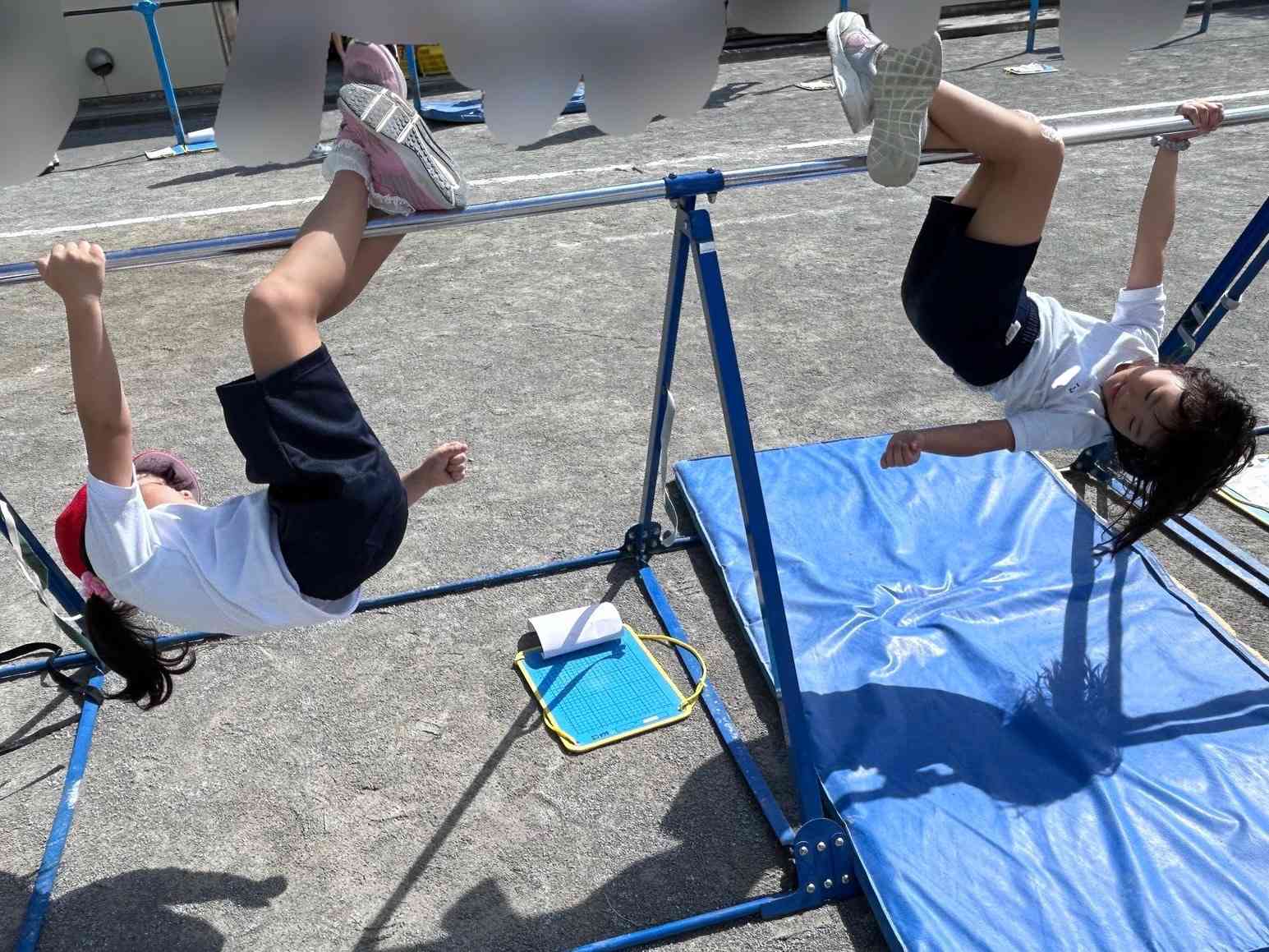 音楽の時間には、10月の音楽朝会と創立95周年記念集会向けての歌「未来につなげ〜記念日に歌う歌」の練習をしています。 朝の支度の時間にも放送で流れていて、歌いながら楽しく朝の支度をしています。 体育の学習では、引き続き鉄棒を行っています。 子ども達は、ぶたのまるやきじゃんけんに夢中でした。