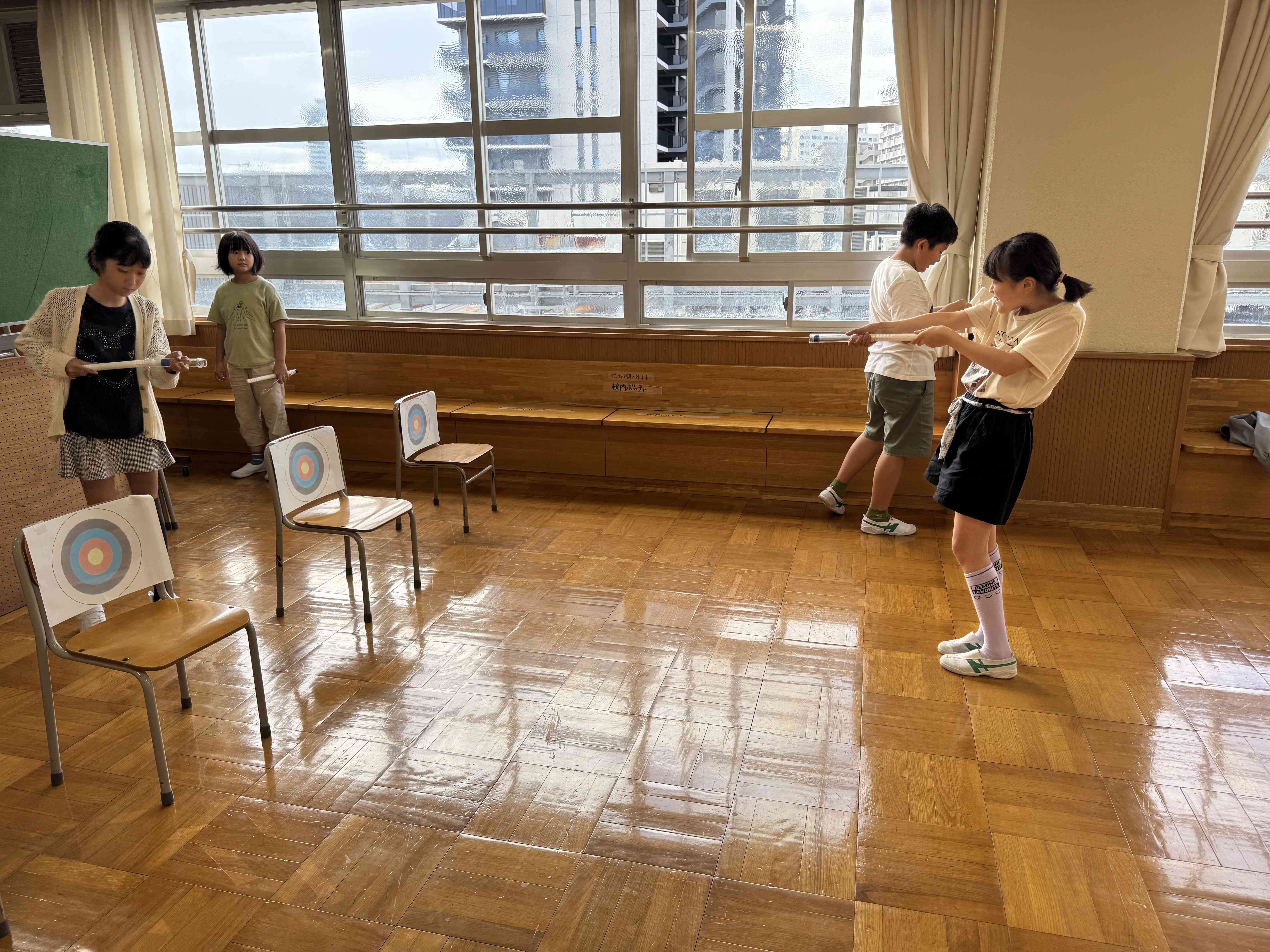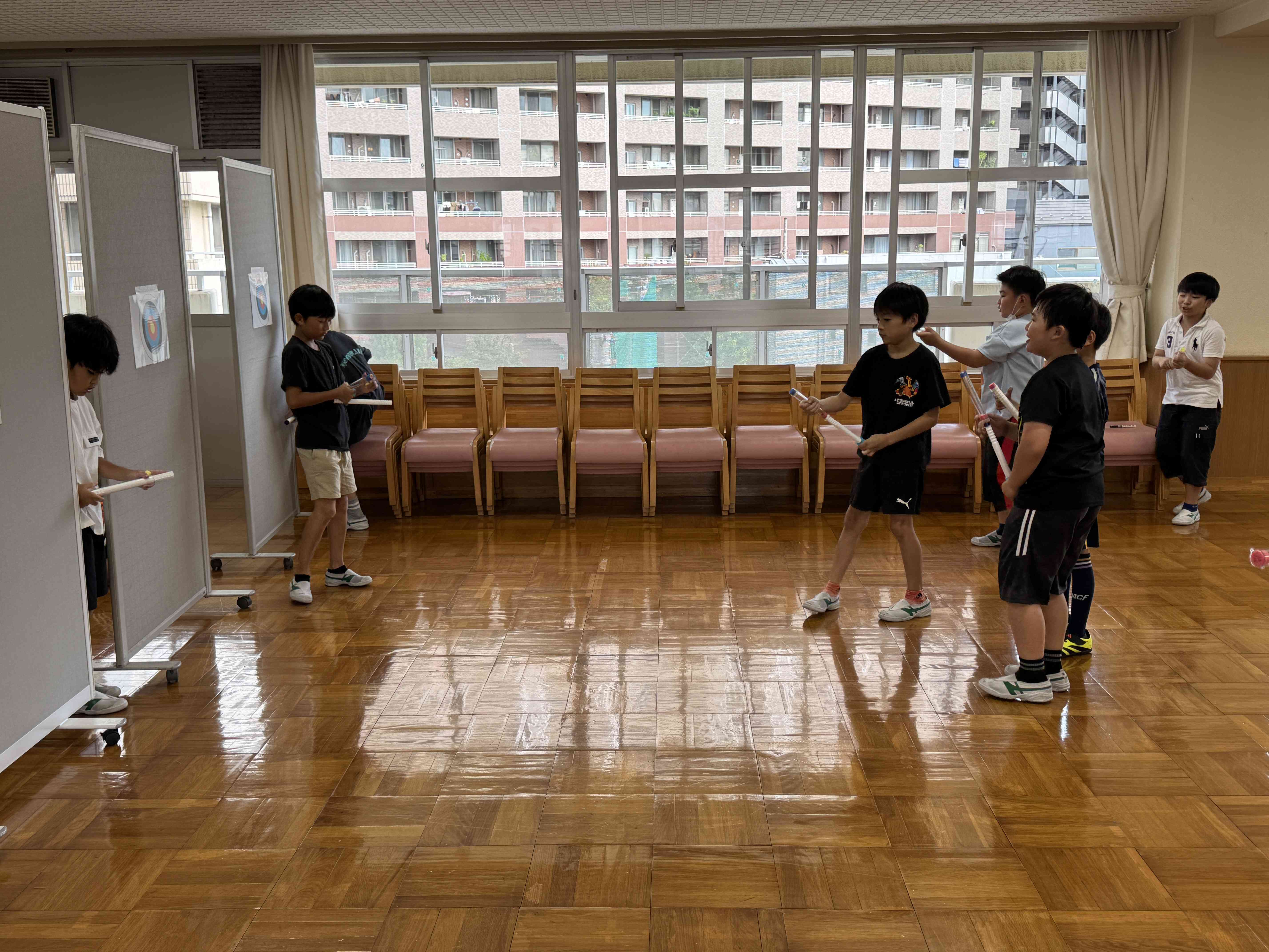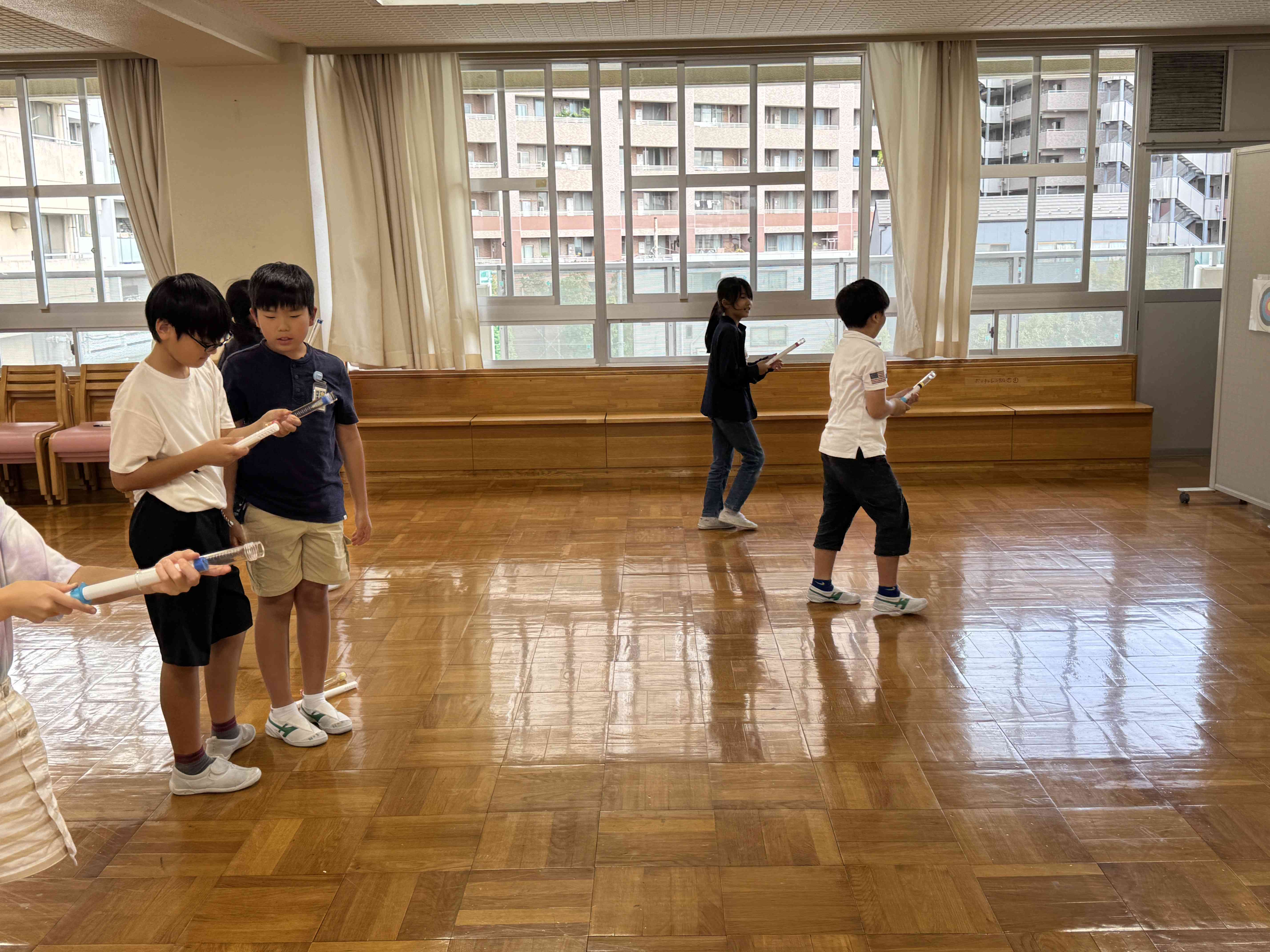 先日、理科「とじこめた空気と水」の授業で、空気砲の実験をしました。 つつにスポンジを詰めて、棒で勢いよく押すと、圧縮された空気で、スポンジが飛びます。子どもたちは、空気の性質について、実験を通じて楽しく学びました。 的にうまく当てようと、試行錯誤を繰り返しながら、玉を飛ばしました。的に当たると、とても嬉しそうに喜んでいました。