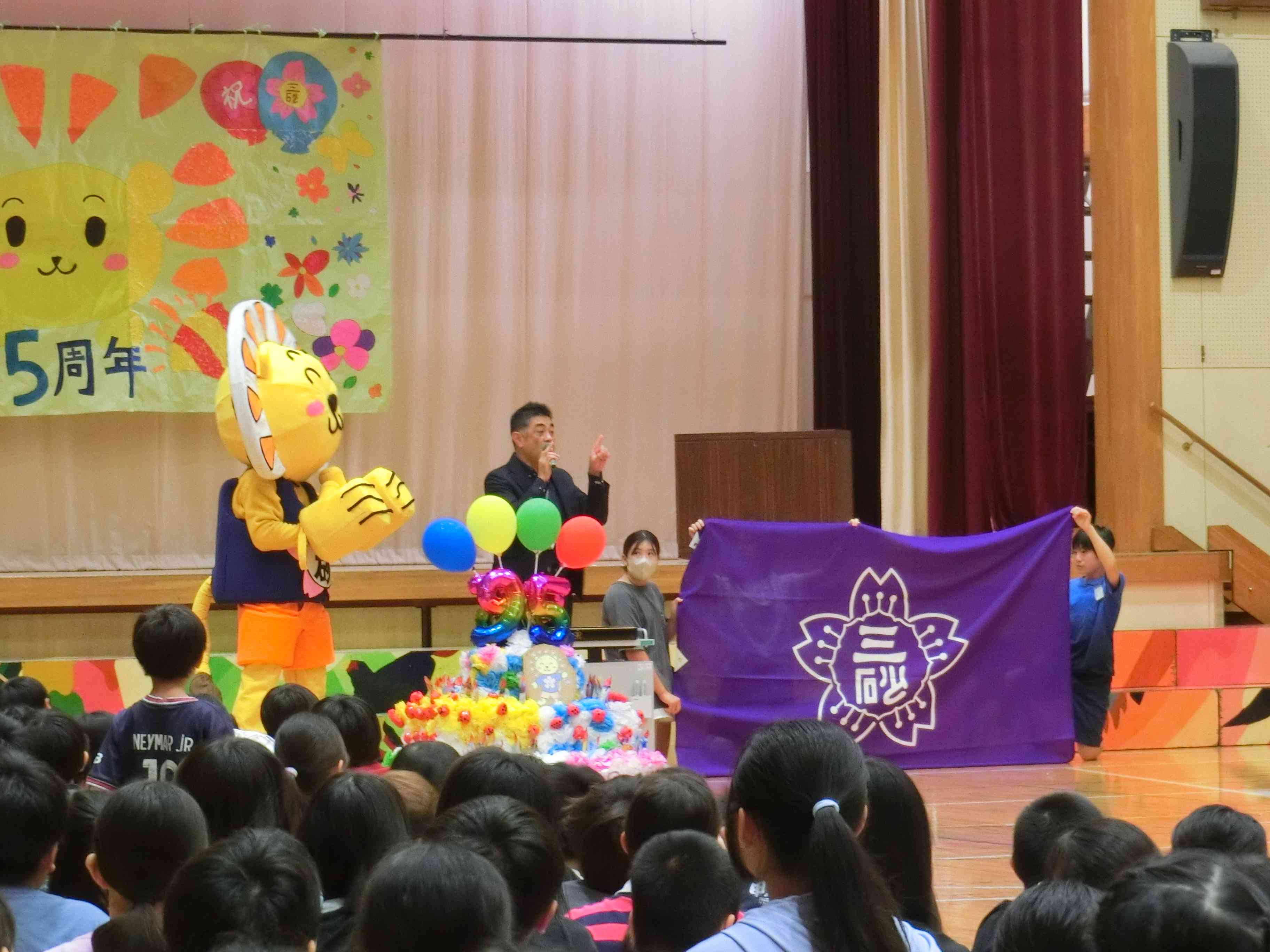 昨日、体育館にて創立95周年おめでとう集会を行いました。 ご来賓の方々をお招きして、多くの保護者の方々に参観いただきました。代表委員会の司会で各学年の出し物の後、全校から絵のプレゼントが紹介され、お返しにサンスナオンから校長先生へプレゼント(記念品)の発表がされ、会場の体育館がドッと沸きましたました。こどもが主役の和やかな会となりました。