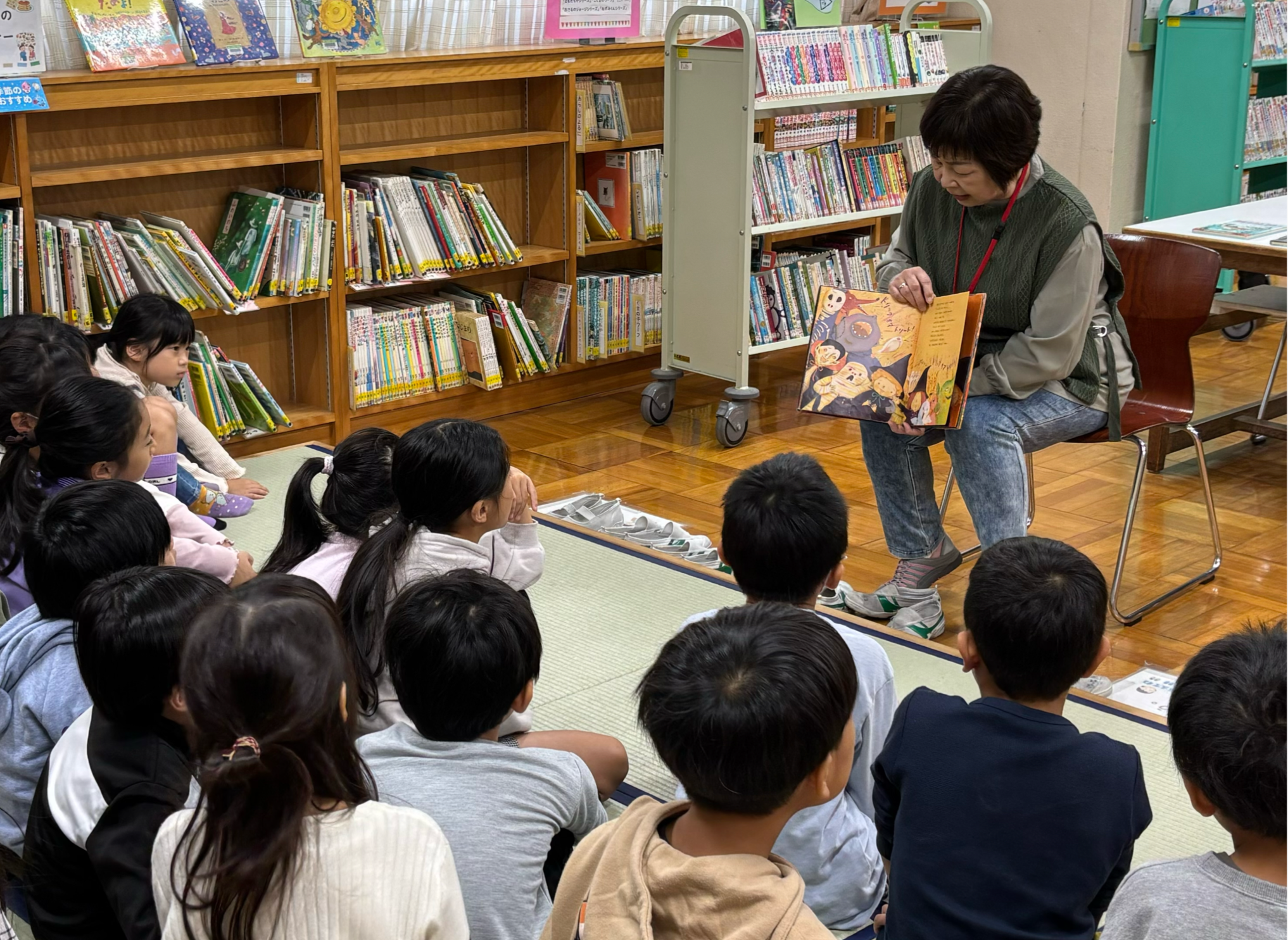 毎週の図書の時間は、お話会が開かれます。 今日はハロウィンも近いことから、『ハロウィンのランプ』というお話を読んでいただきました。おばけのパーティに迷い込んでしまった女の子のお話です。 楽しいお話に目を輝かせながら、夢中で聴いている姿が見られました。