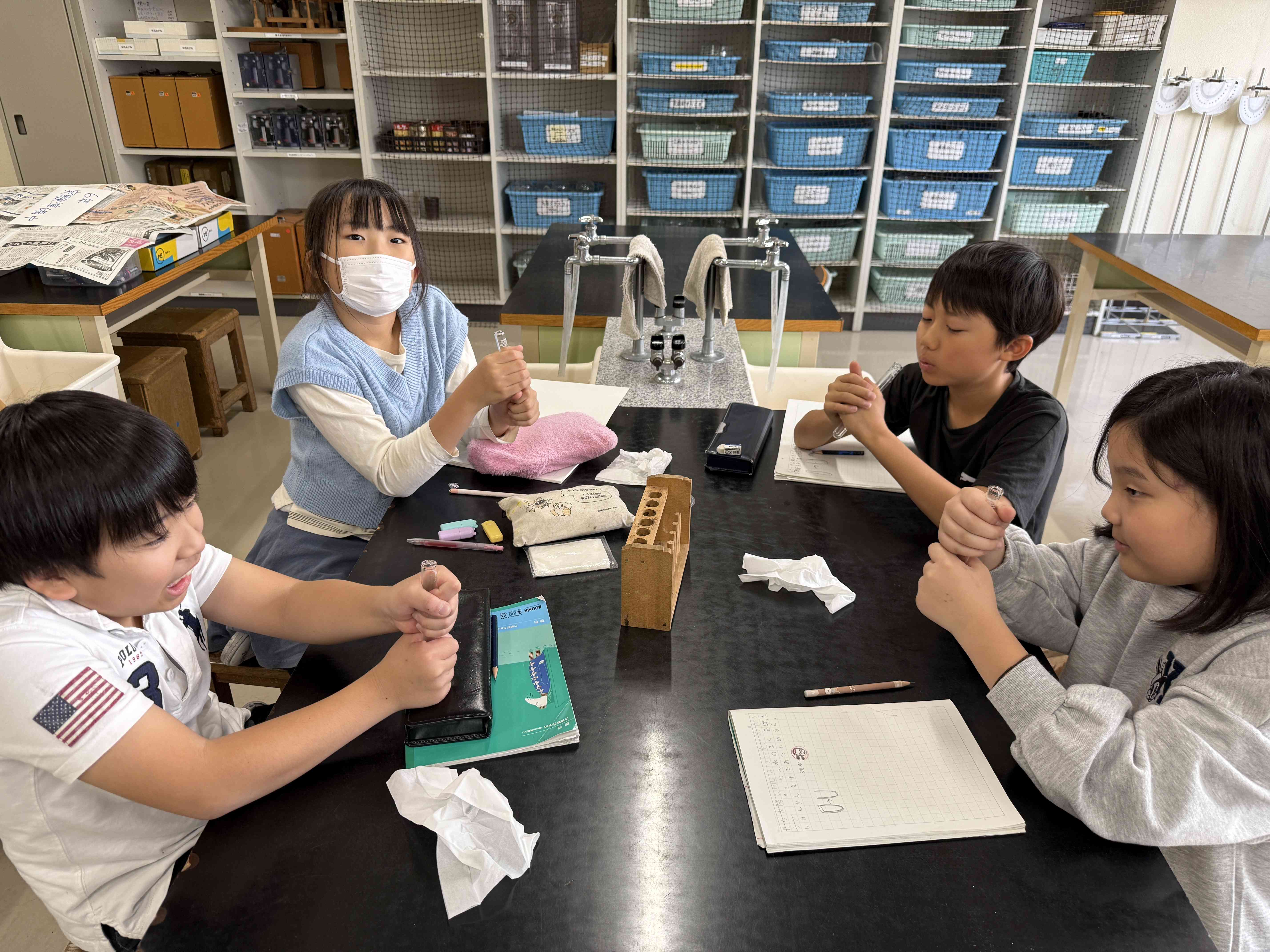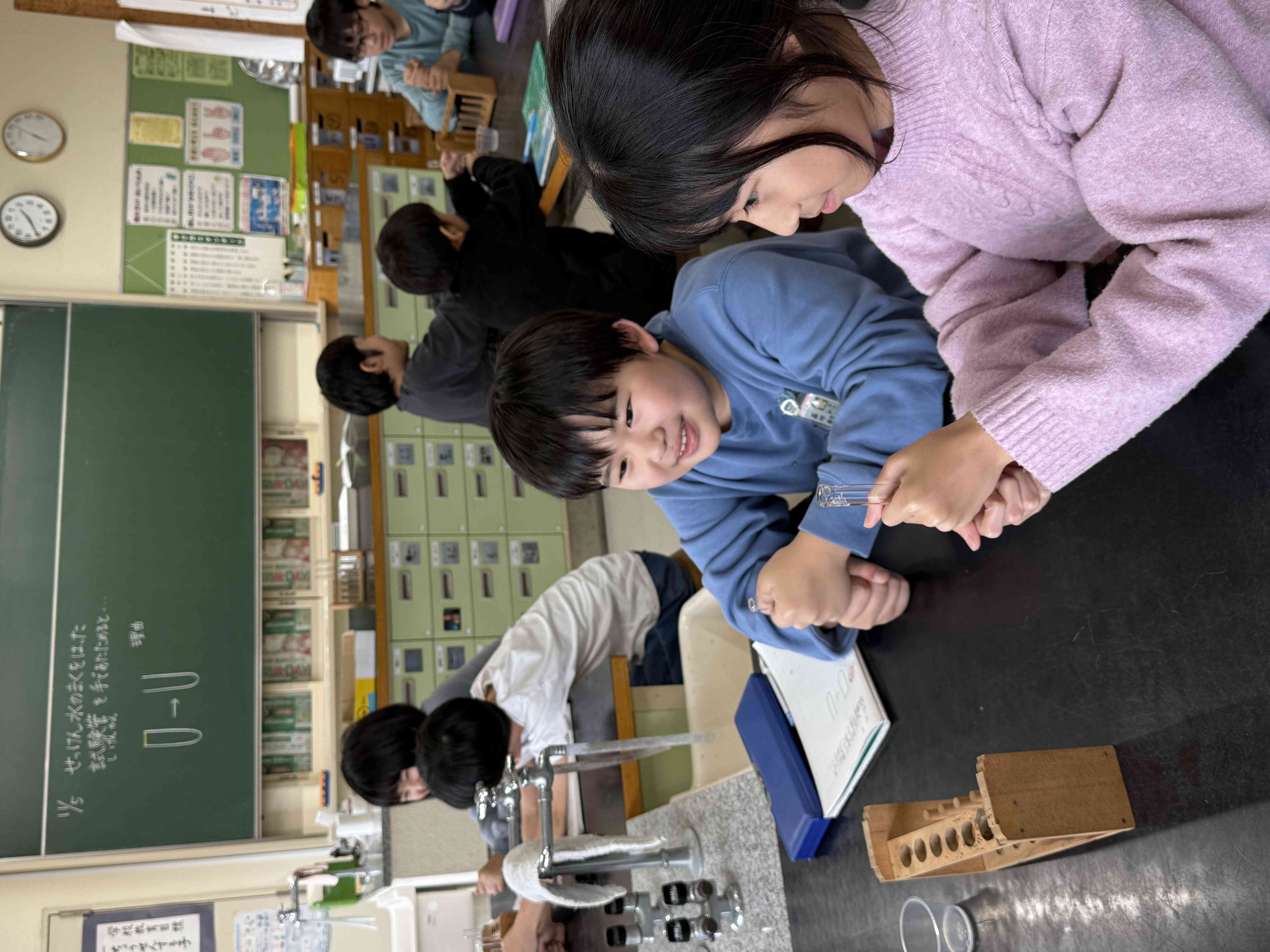 今日の理科の実験では試験管に石けん水の膜をつけて、試験管を手で温めた場合どうなるかについて予想を立てて実験しました。試験管を温めると、石けん水の膜が膨らんでいくのが観察できます。その理由を聞いてみると、「温まった空気は上にのぼっていくから。」という答えが出てきたので、今度は試験管を上下逆さまにしてやってみたらどうなるだろうか、という追加の実験もしました。仮説を立てて実験をして確かめる、という理科の基本的な考え方について学びを深めています。【添付ファイル】