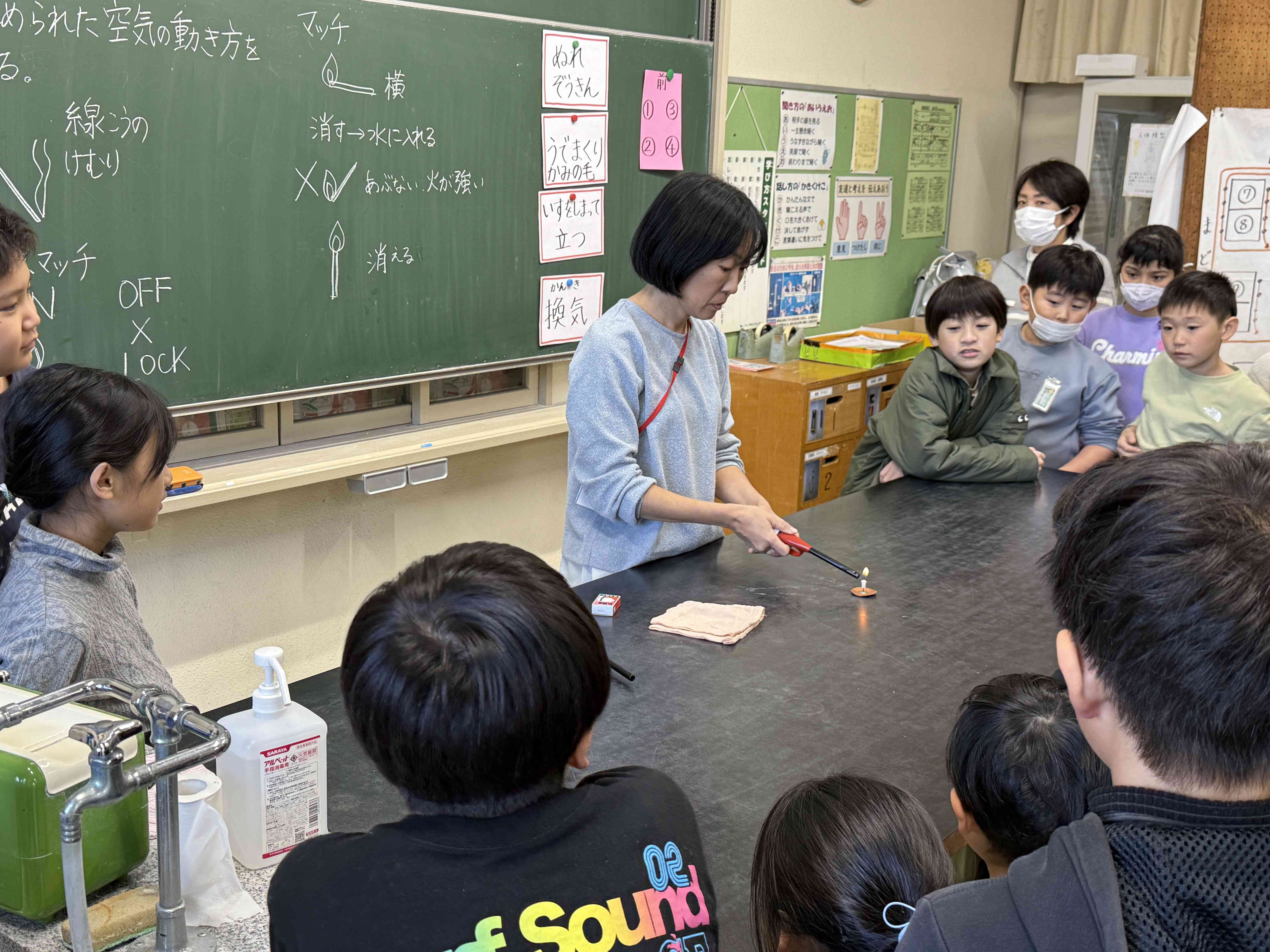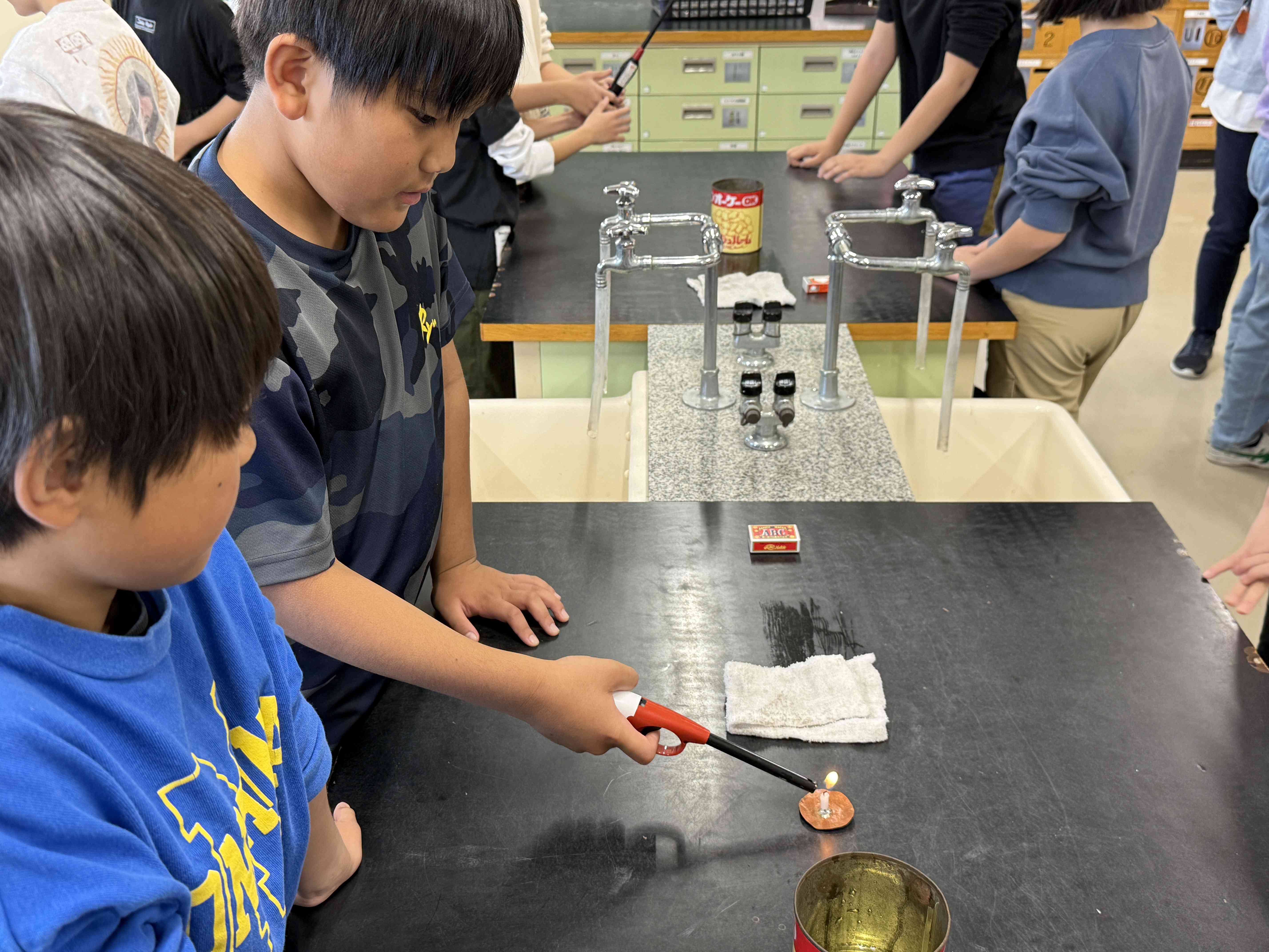 4年生の実験では火を扱うこともあります。そのためにガスライターやマッチを使う練習をしました。安全な使い方を学んだ後、実際に火をつけました。