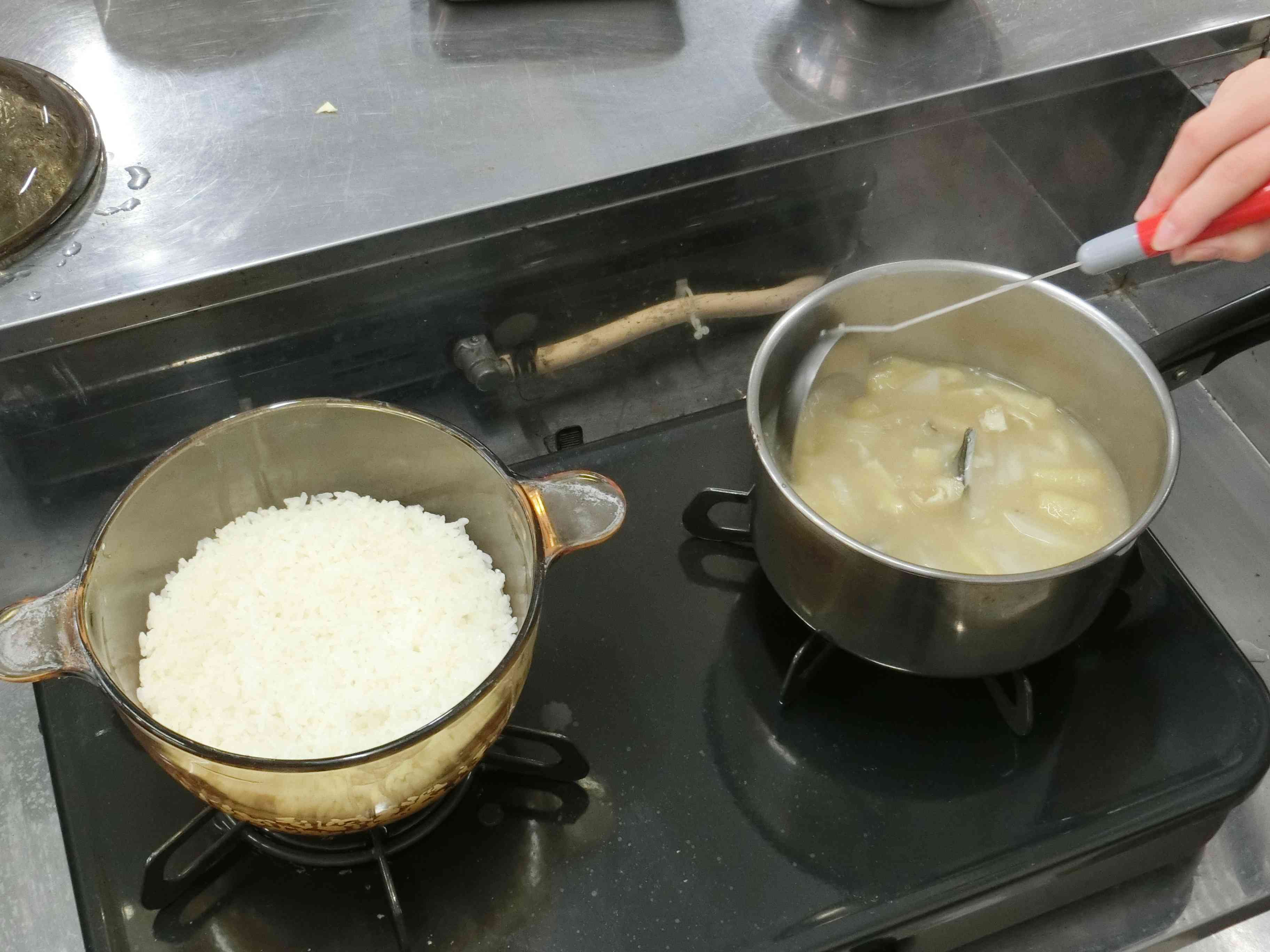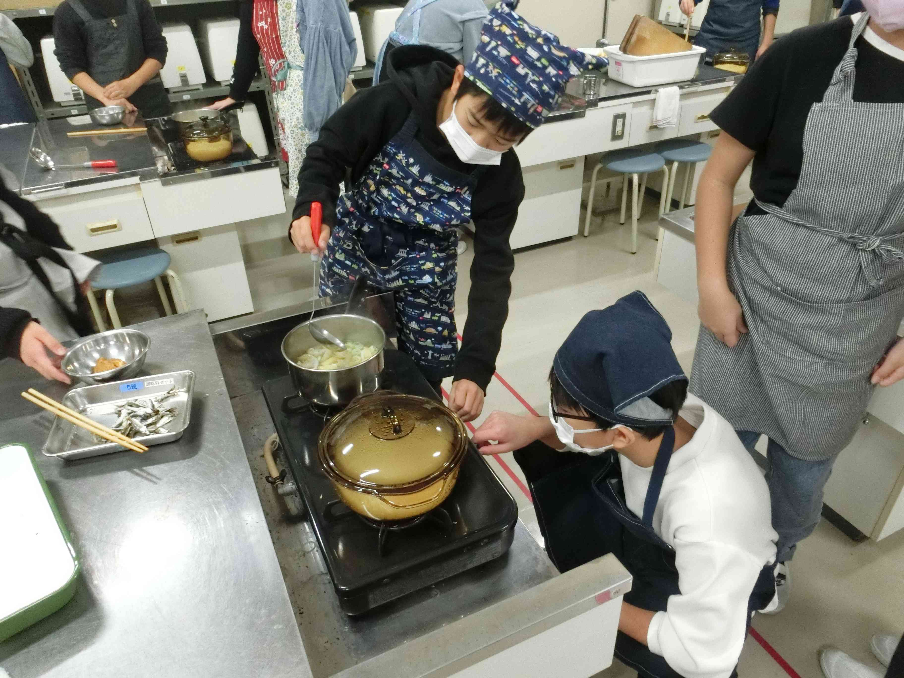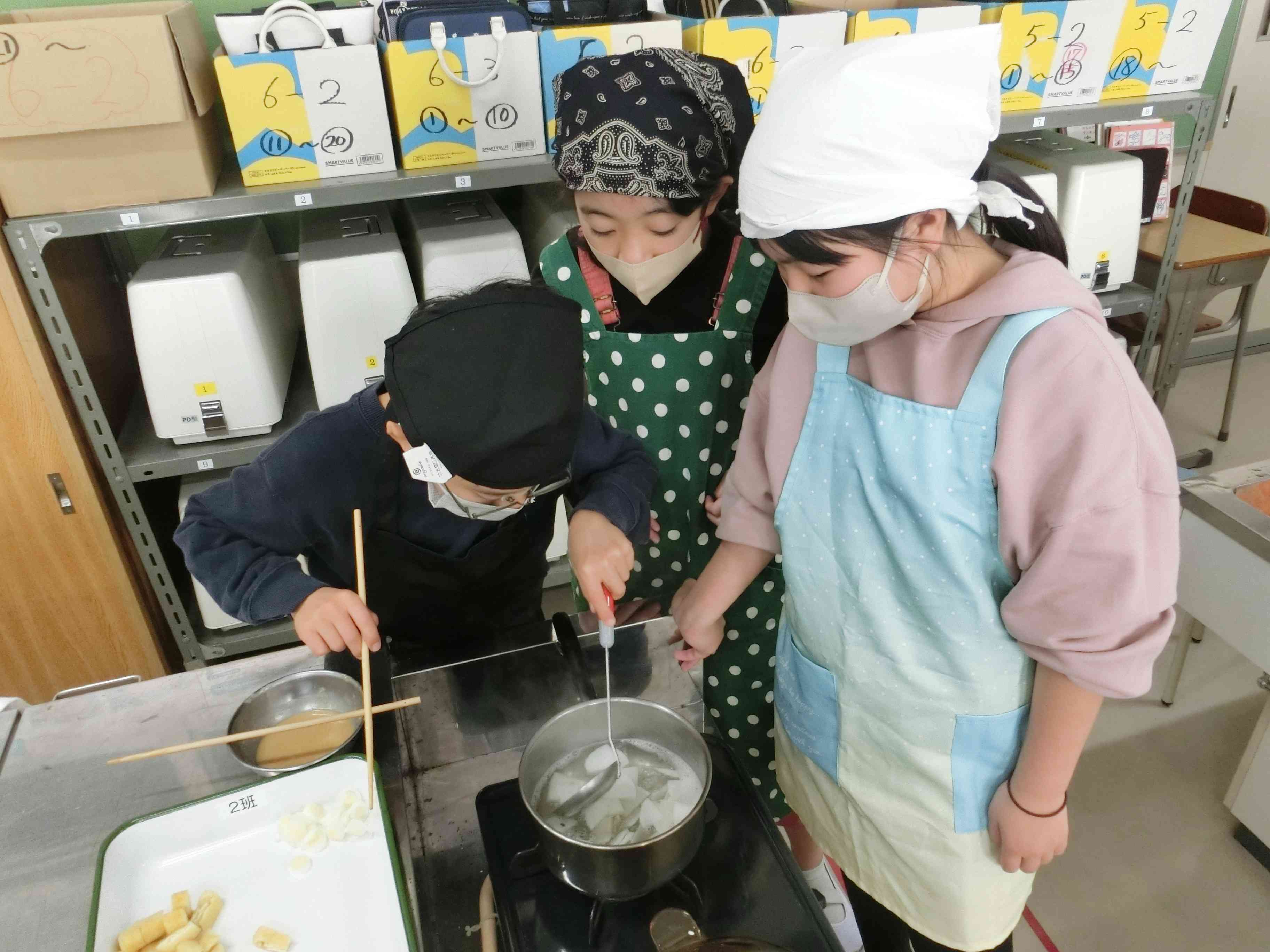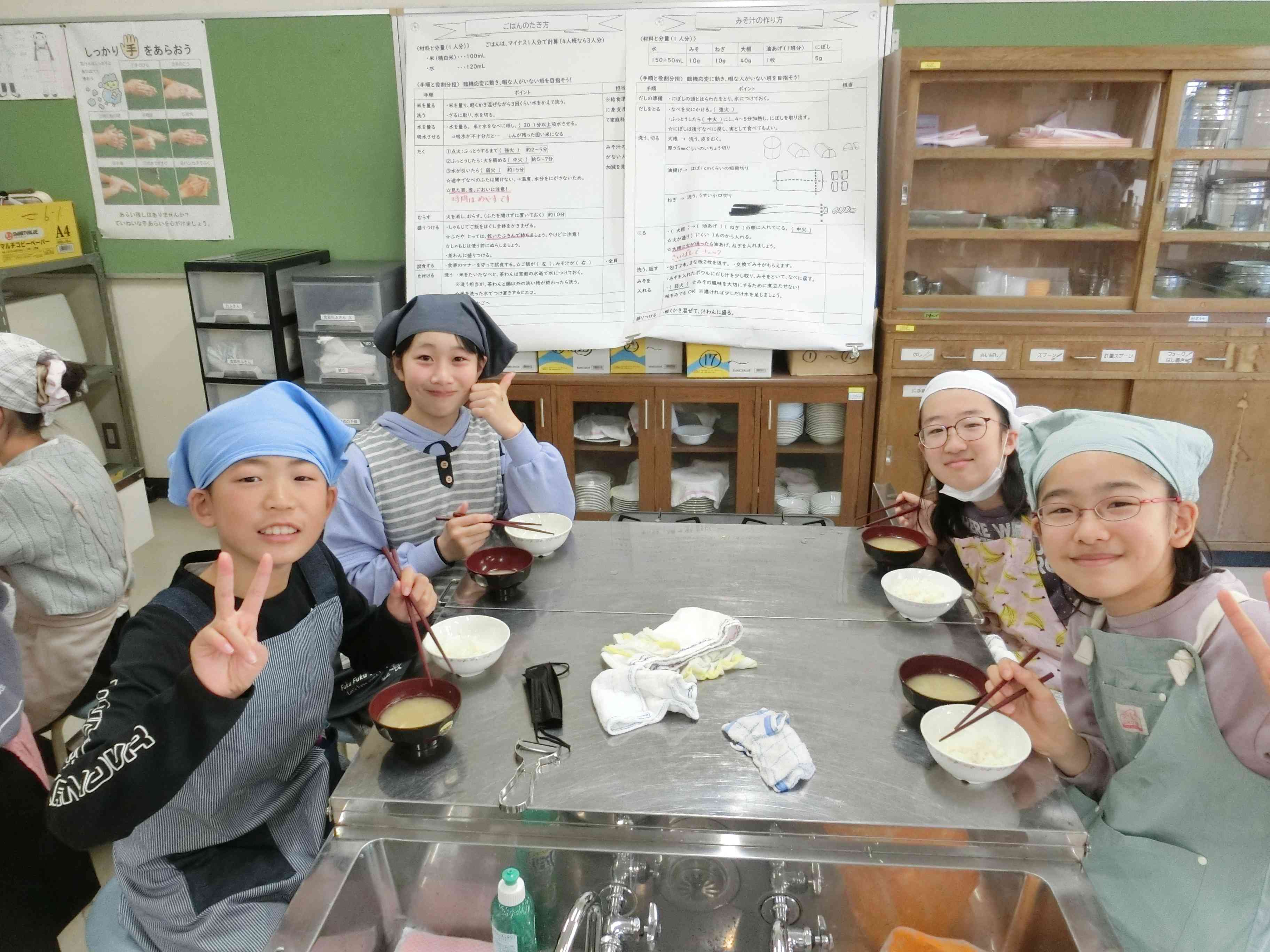 家庭科「食べて元気に」の学習で、ご飯とみそ汁を作りました。 家庭では炊飯器を使うことが多いと思いますが、今回はガラス鍋でご飯を炊きました。鍋の中の様子を注意深く観察しながら、火加減を調節しました。香ばしい「おこげ」ができて、こどもたちは大満足。みそ汁はにぼしで出汁をとり、大根や油揚げなどの具材を入れました。 2品を同時に作るのは大変でしたが、手際良く進めることができました。