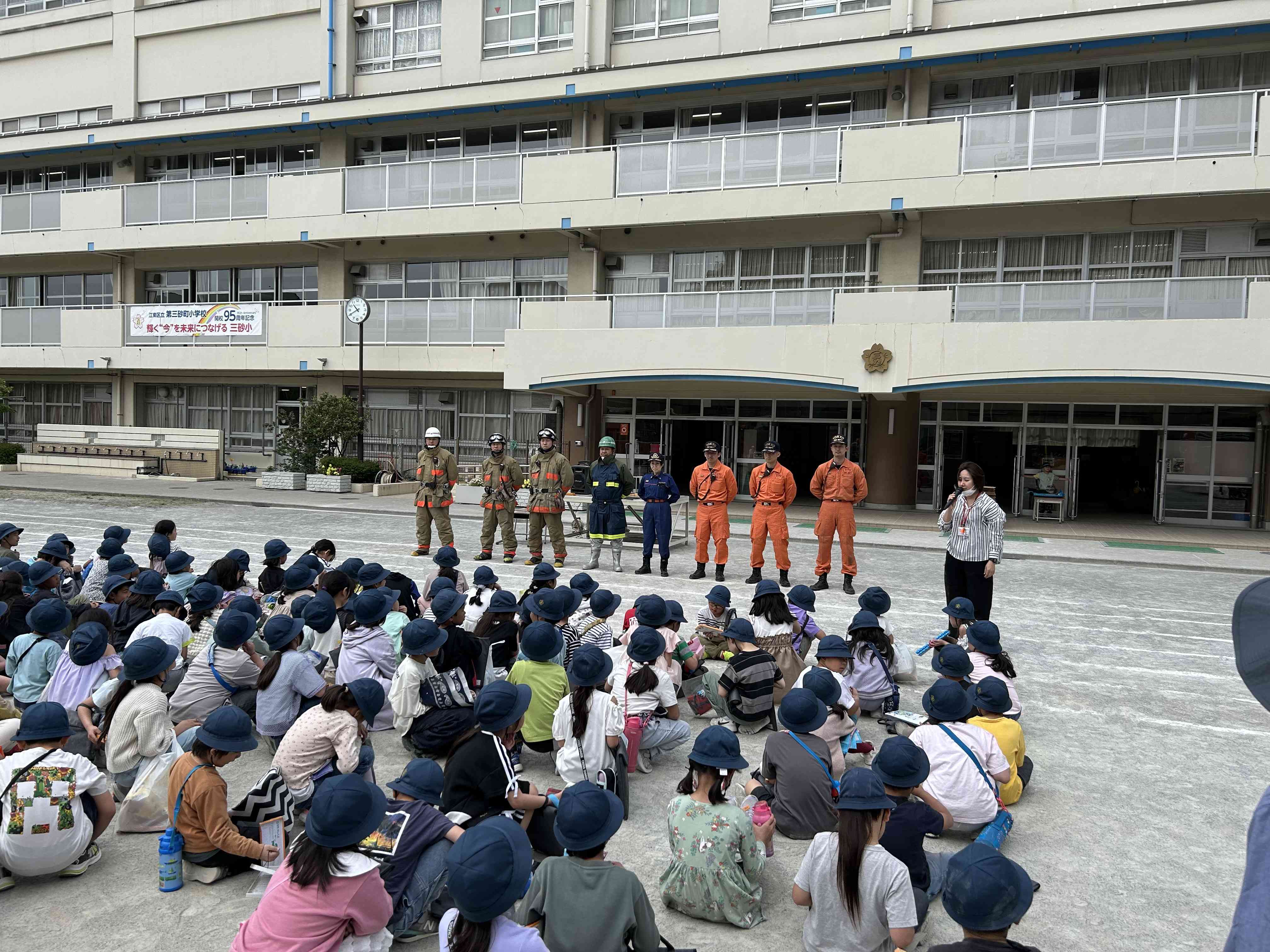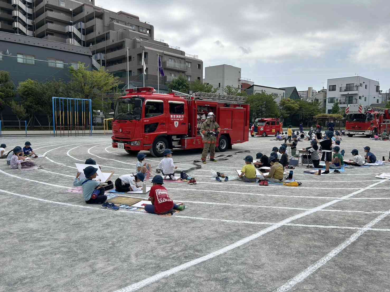 消防写生会を行いました。 城東消防署・消防団から3台の消防車と隊員の方がいらっしゃいました。 近くで消防車を見られる貴重な機会でした。 じっくりと観察しながらクレパスで絵を描きました。