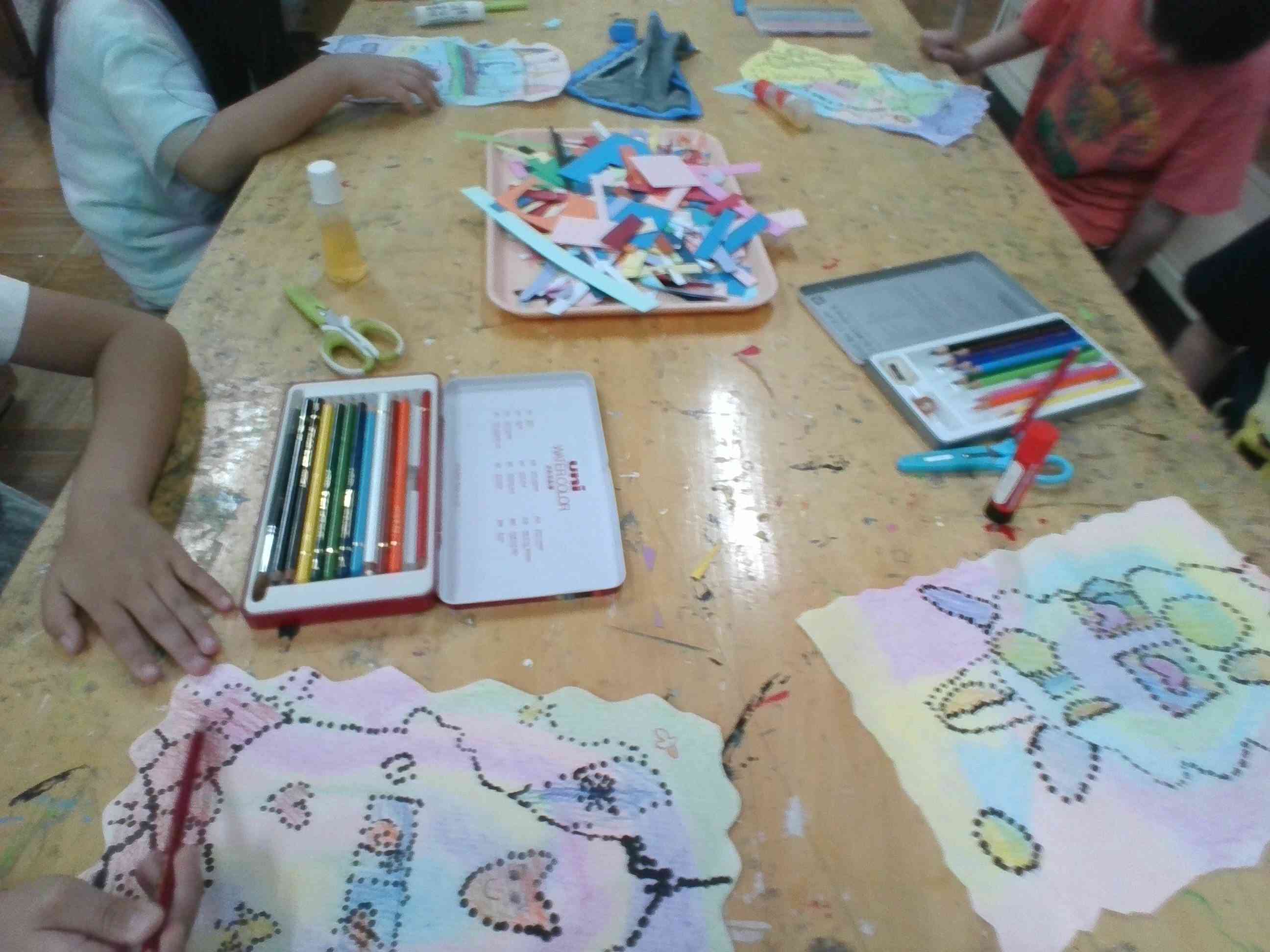 綿棒を使って点でタワーを描き、想像を膨らませながら自由に色を付けて作品を仕上げました。