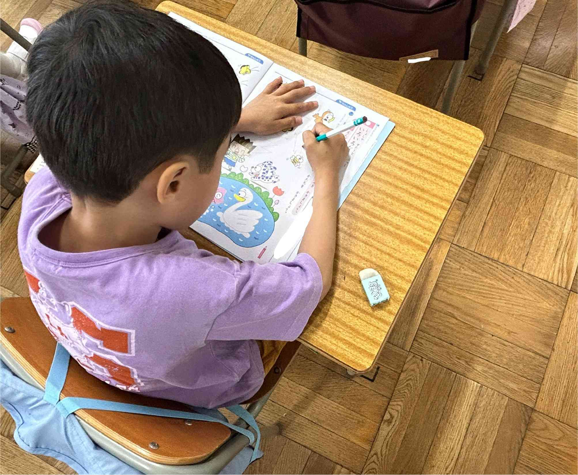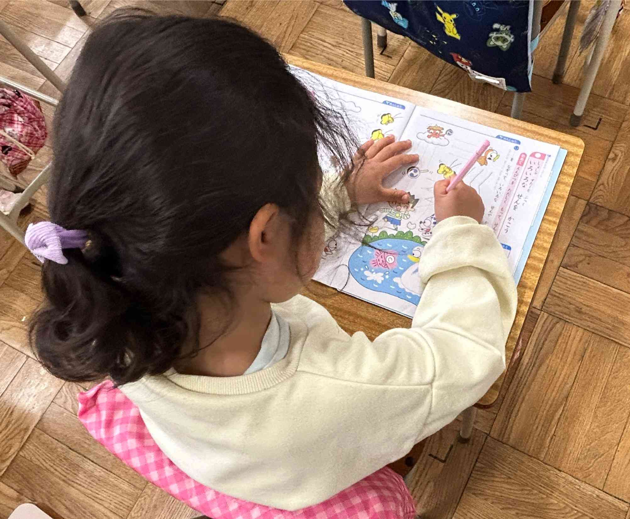 書写の時間には、国語で学習したひらがなをもう一度見本を見ながら丁寧に書くことをしています。 マスの部屋やとめ、はねを意識して集中して書くことができました。