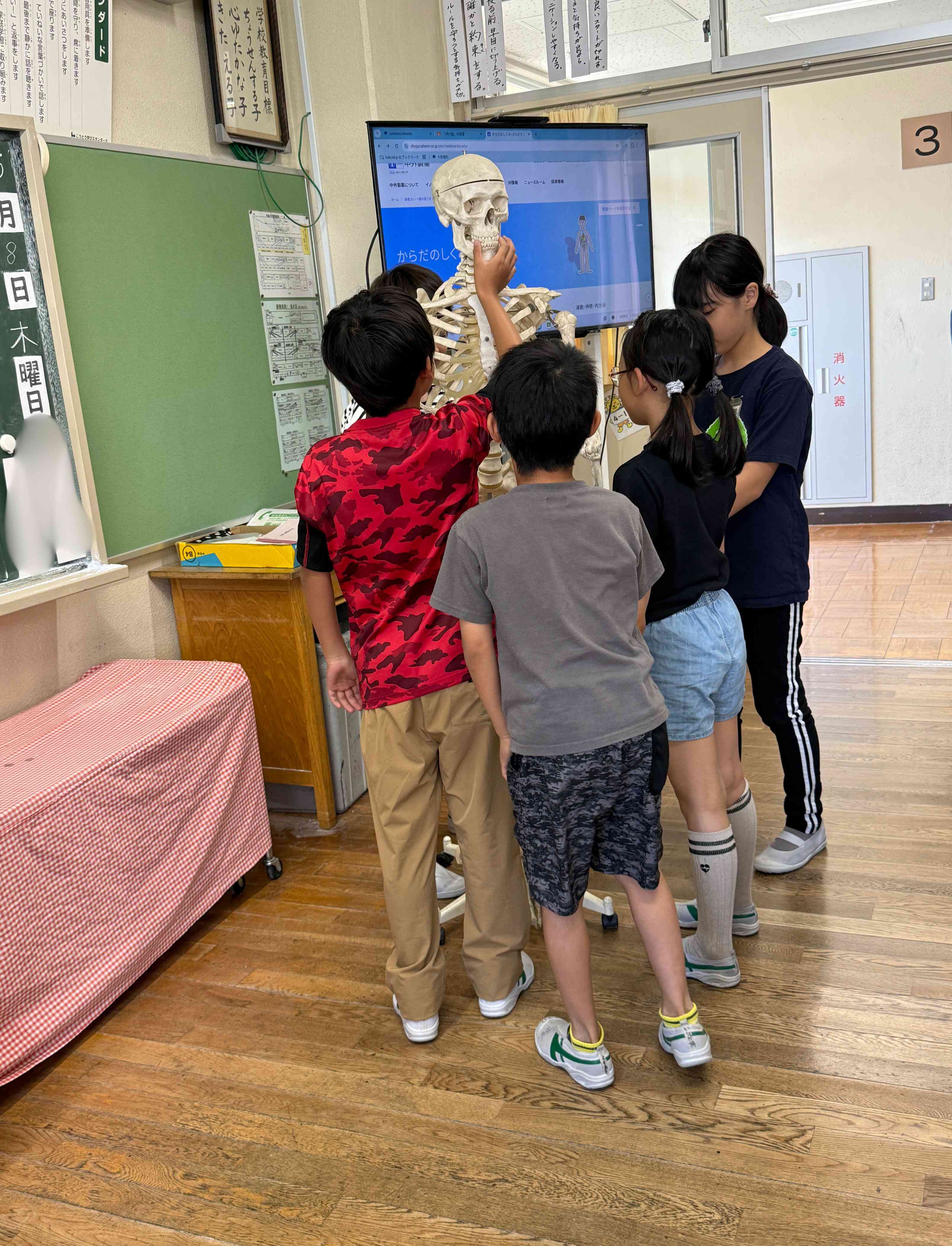 腕の動きを考えるために、理科室の骨格模型を教室に運んで詳しく観察しました。どのように腕が動くかどうか考えを深めました。