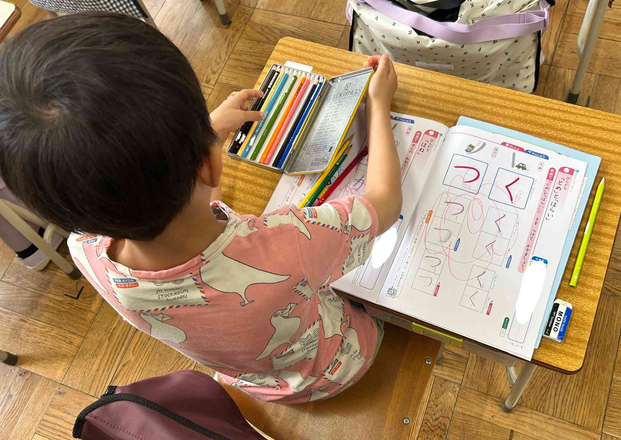 書写の時間には、「か」の練習をしました。 「か」を書くときには、マスの使うお部屋と、とめ、はらいを意識して書くことができました。