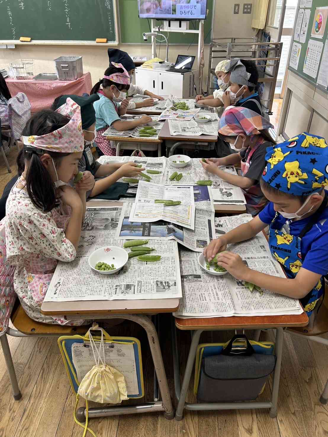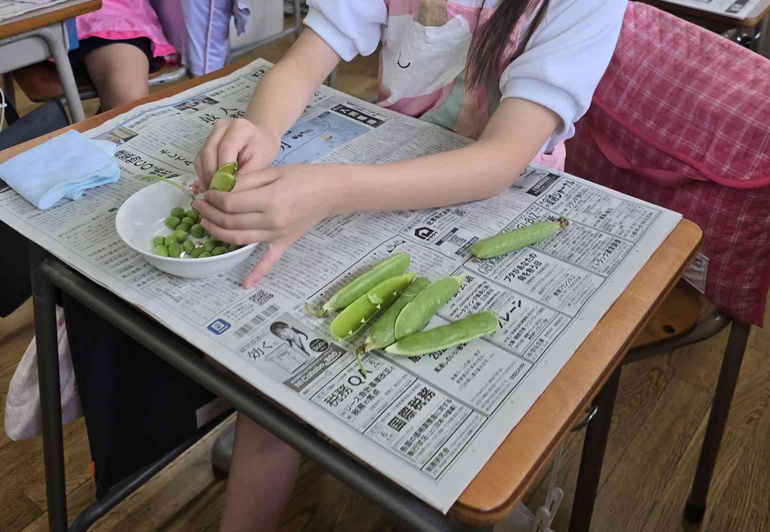 グリンピースのさやむき体験をしました。 よく見たり、音を聞いたりして観察しました。 むいたグリンピースは給食のピースごはんに使われました。