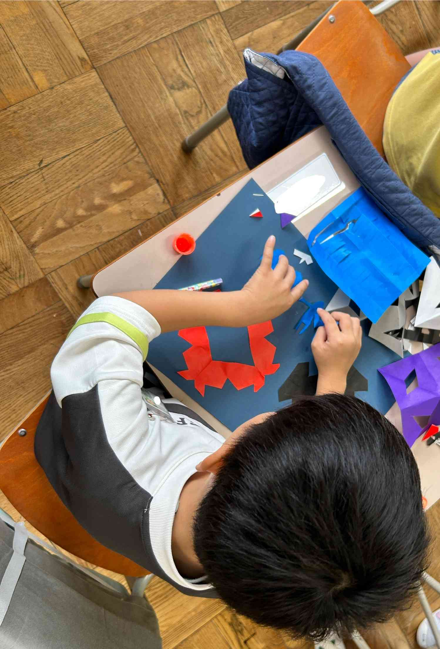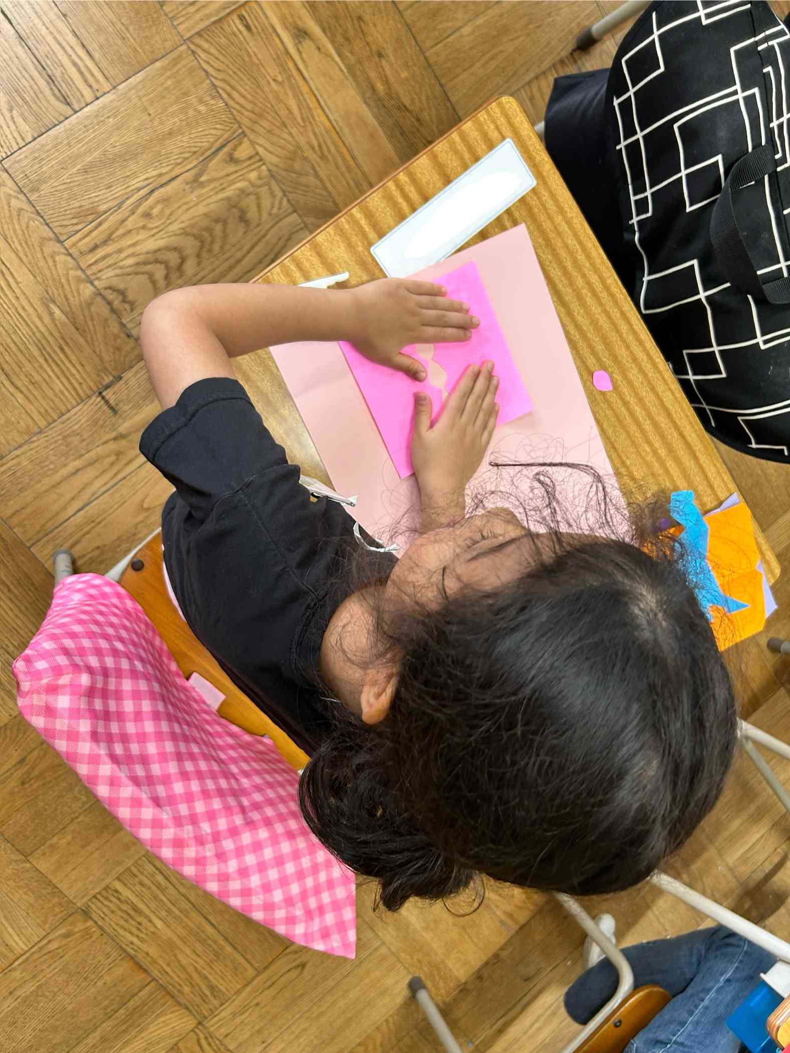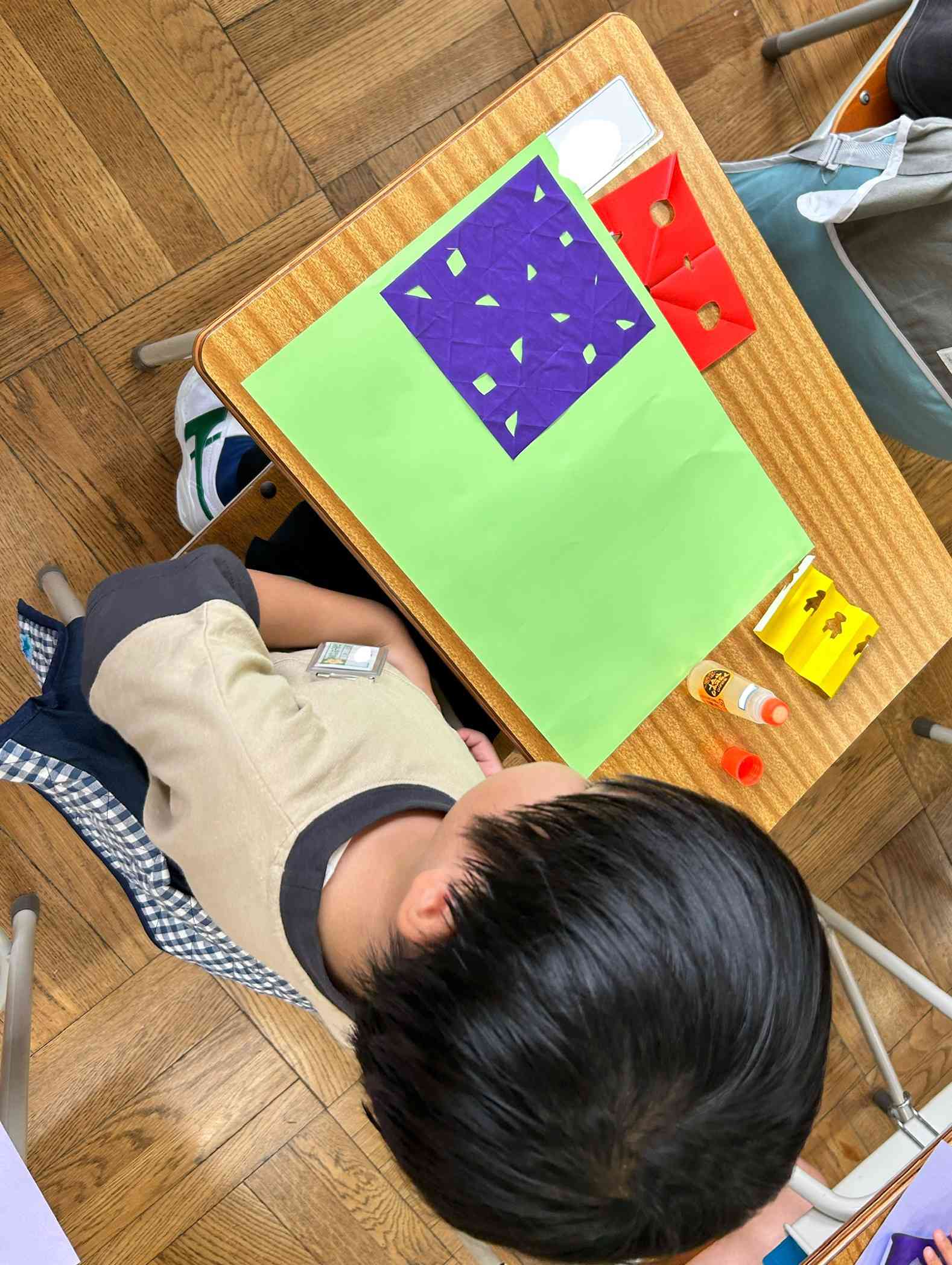 本日はチョッキンパッを作り、気に入ったものを画用紙に貼りました。 貼り方や画用紙の色まで工夫をし、素敵な作品ができました。 学習中に出てきたゴミも自分たちでしっかり片付け、教室をピカピカにしていました。