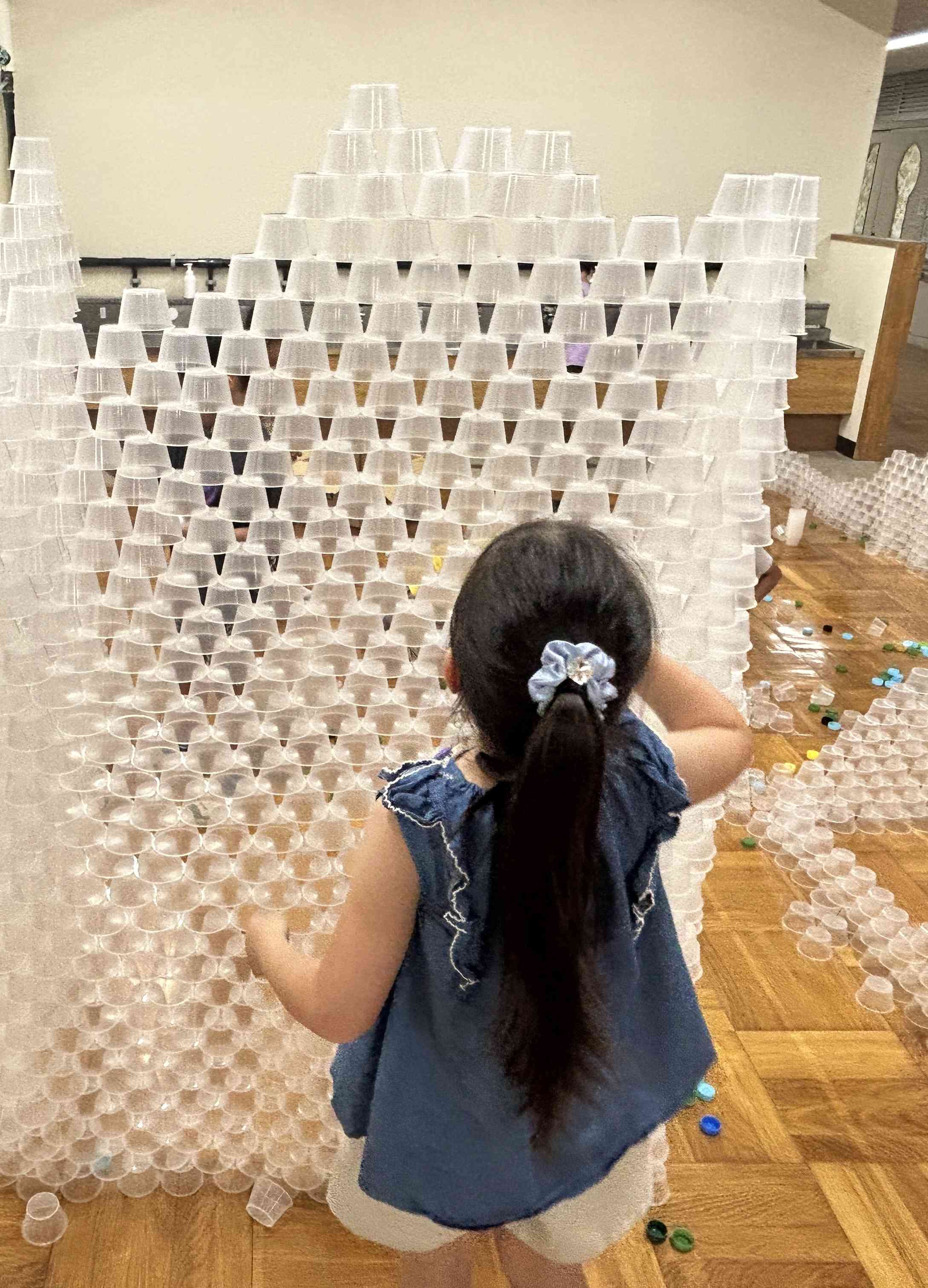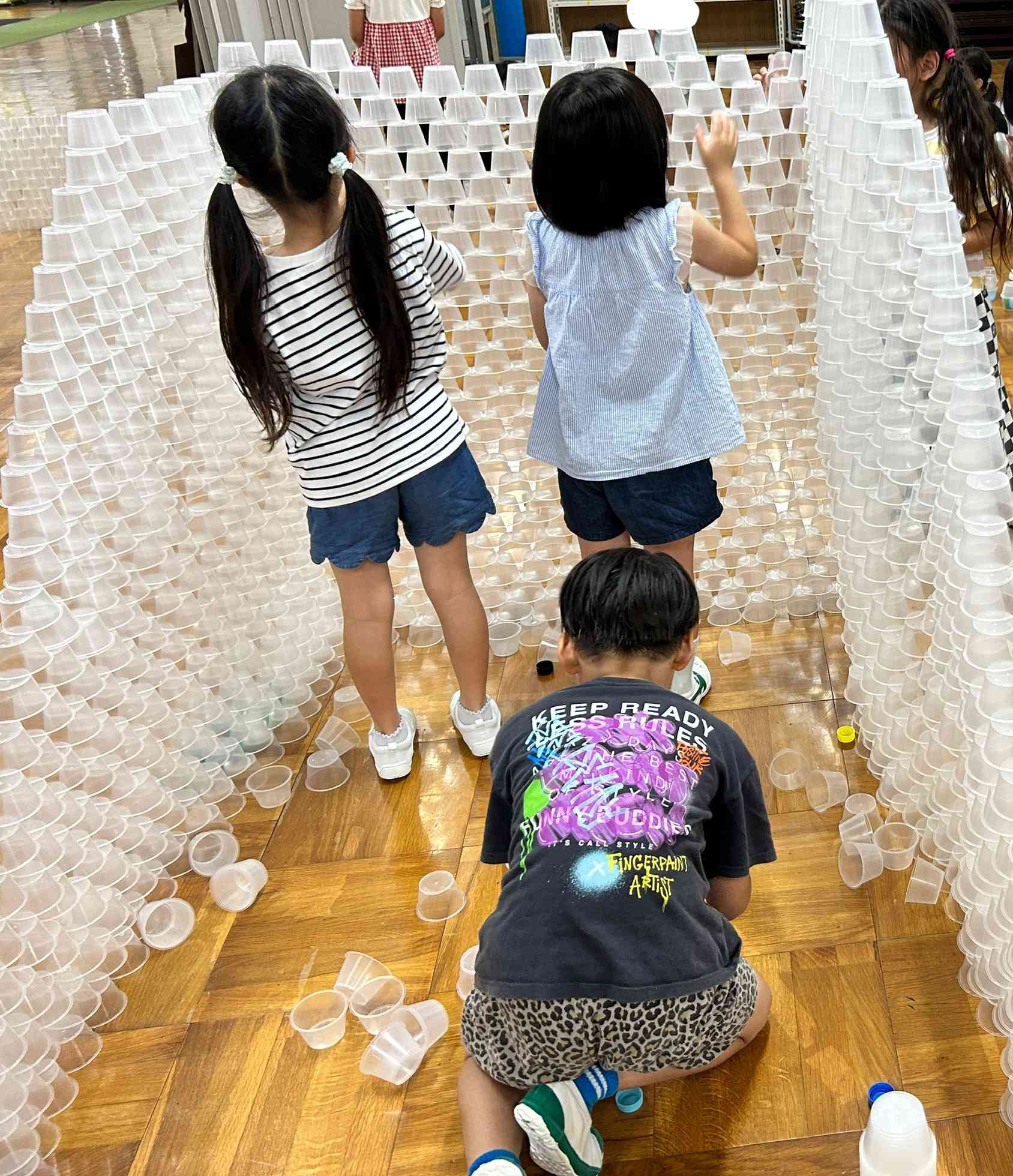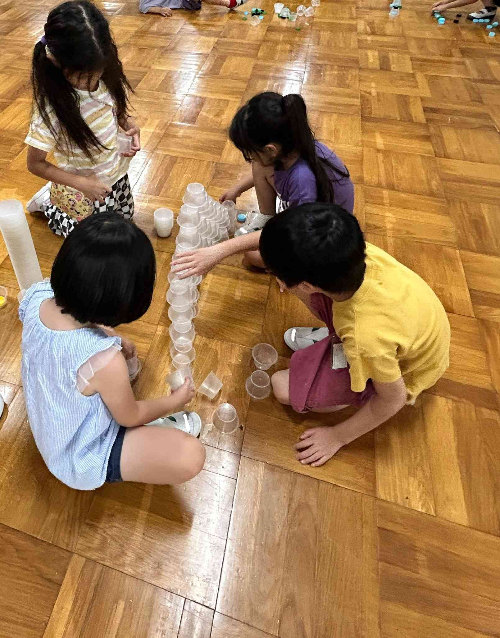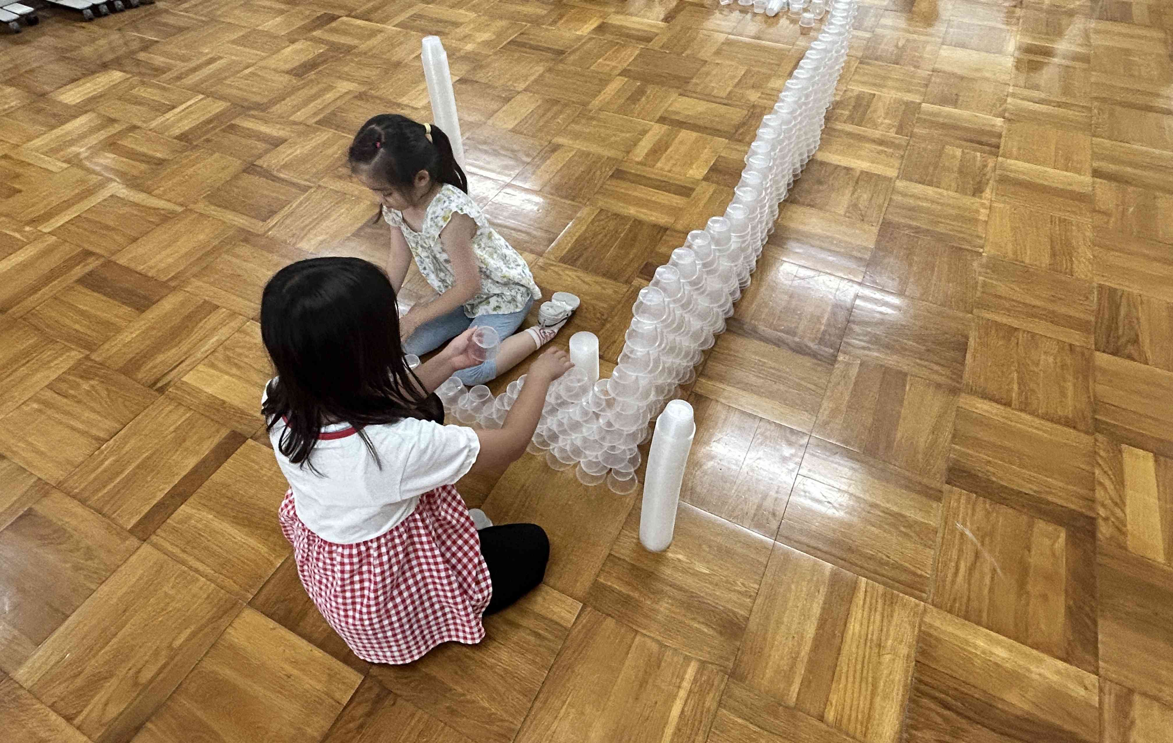 図画工作の学習では、「ならべてみつけて」を行いました。 カップやペットボトルキャップを並べたり組み合わせたりして、自分の好きな並べ方を見つけました。 友達と一緒に協力して楽しく活動していました。