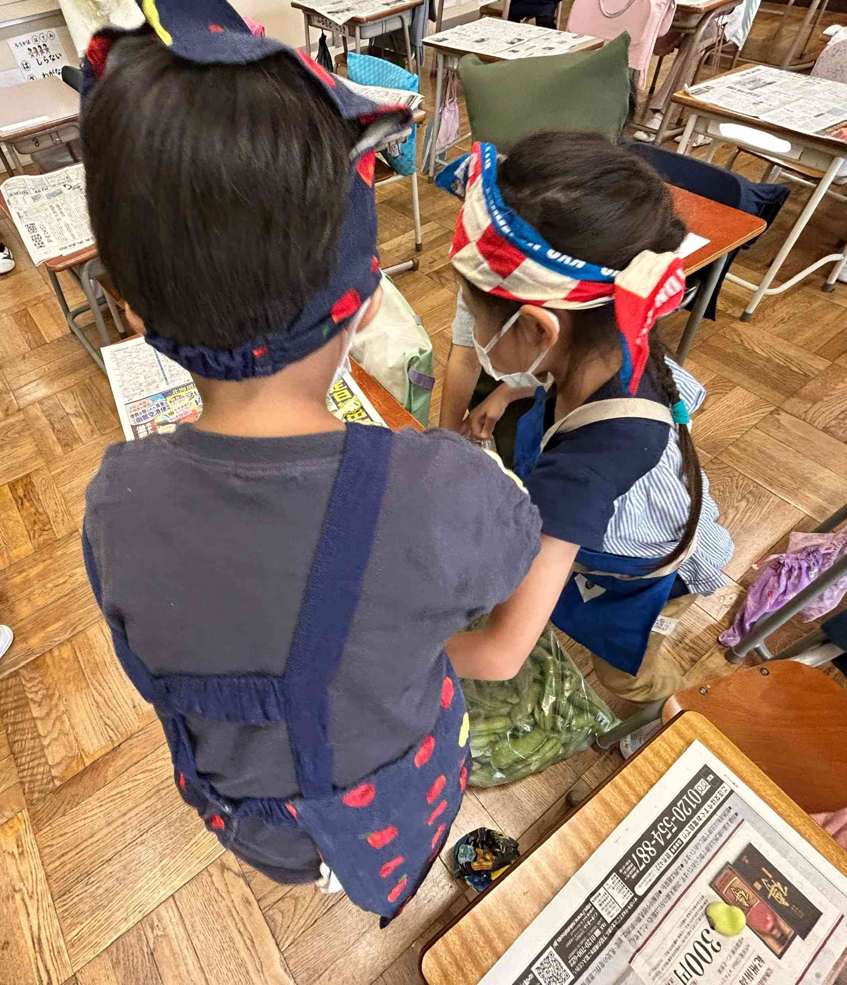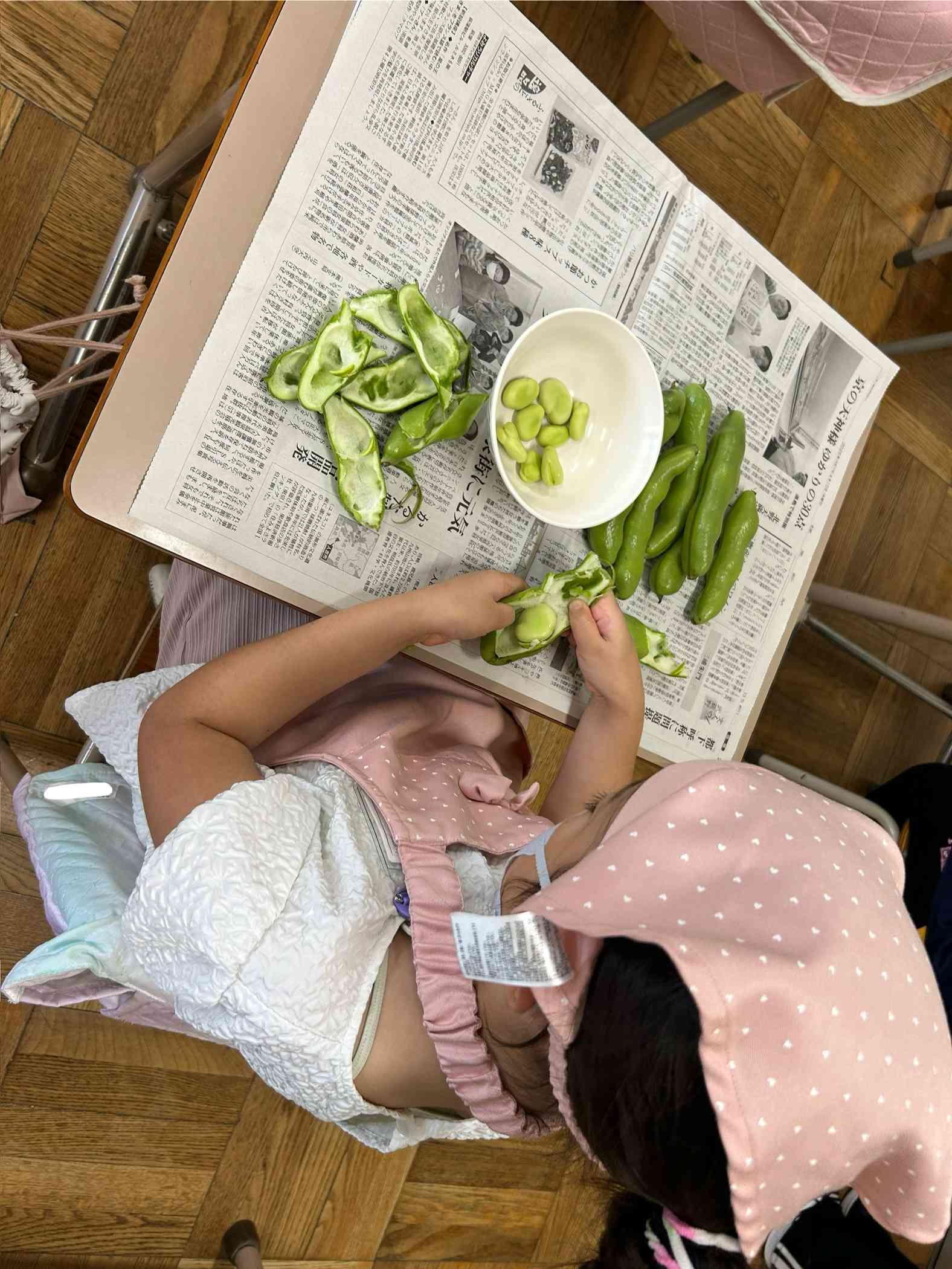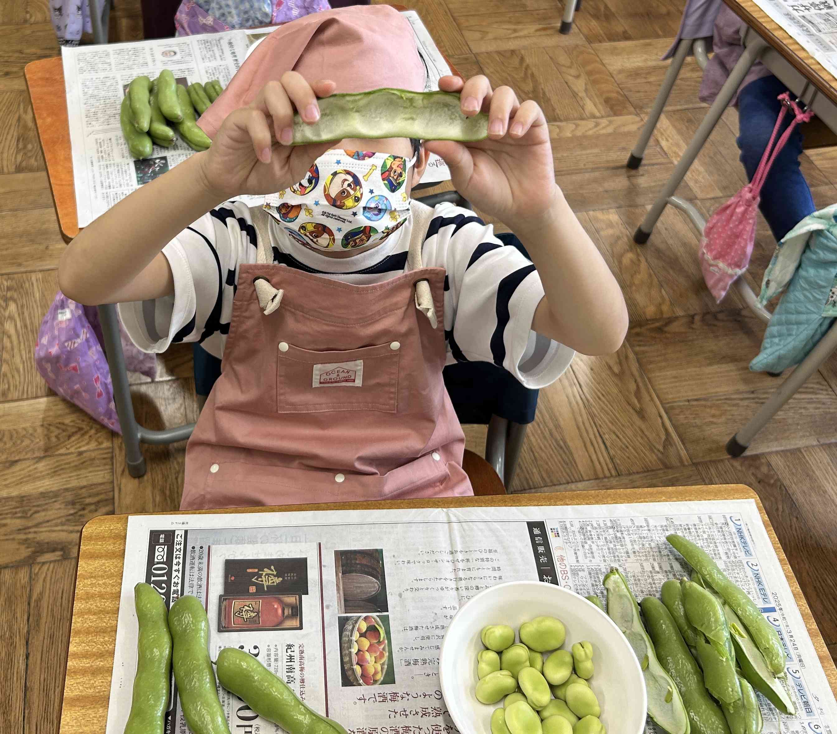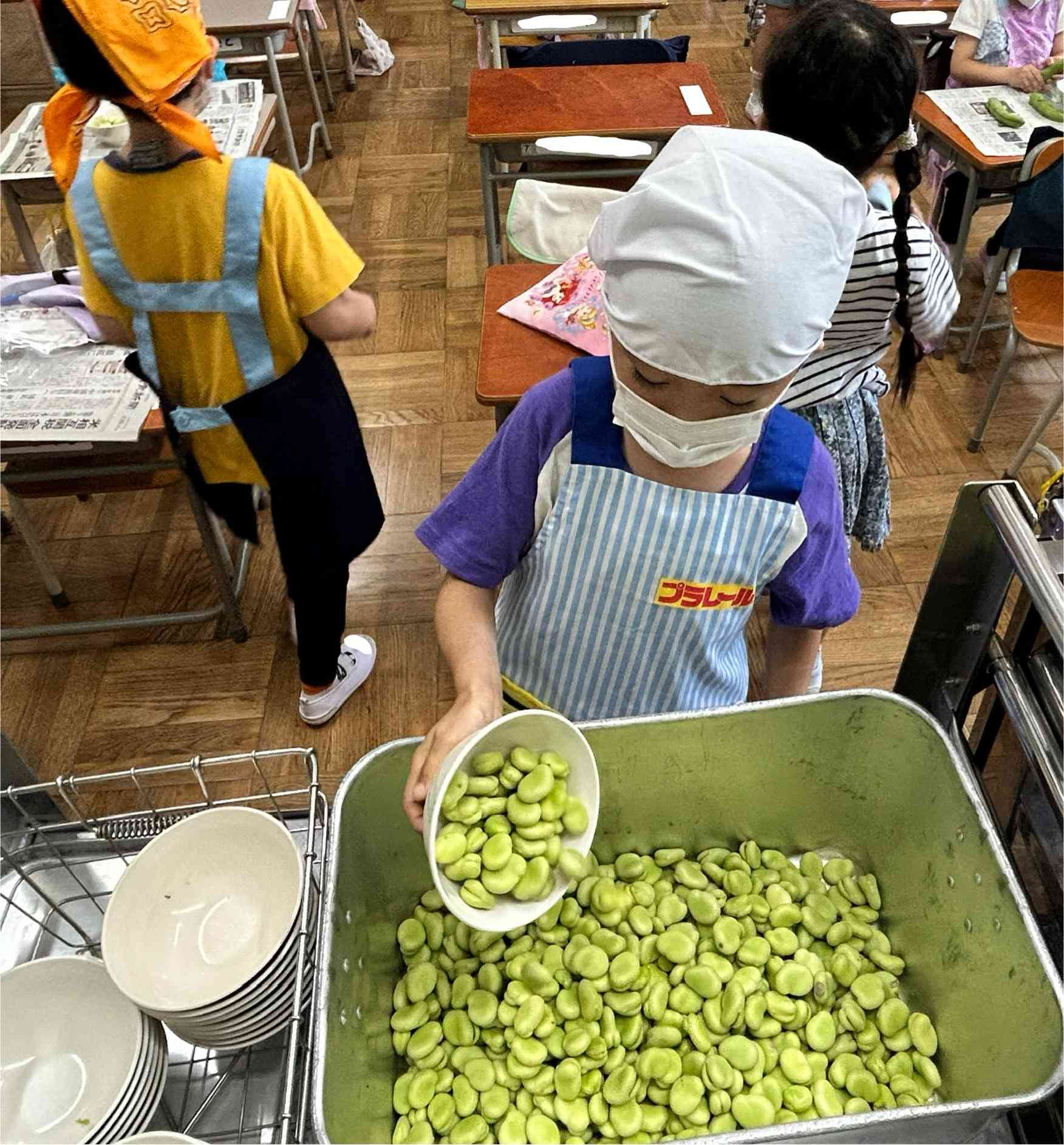 本日はそら豆のさやむき体験でした。 「そら豆に触るのははじめて!」「そら豆のさやってふわふわしているんだね。」「そらまめくんのベッドは、ふかふかしてたけれど、本当なのかな。」と色々なことを話しながらさやむきをしました。 そして、1年生が一生懸命むいたそら豆は全校給食に出てきました。 自分でむいたものが給食で出てくるという経験をすることができて嬉しそうでした。