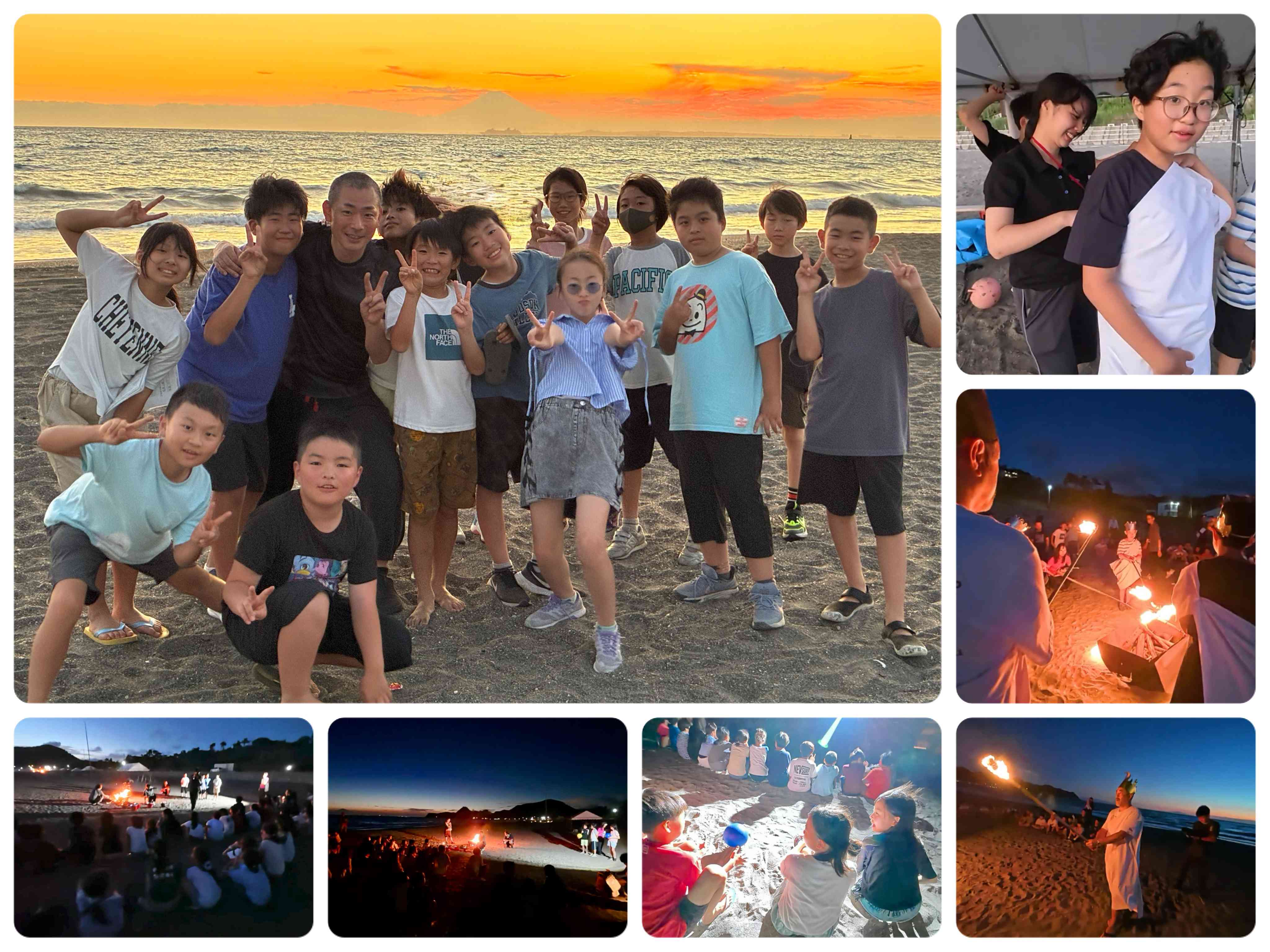 臨海学校初日の夜のイベントは、レク係が中心となって準備したキャンプファイヤーです。風が強くて火を囲むことはできませんでしたが、様々なゲームを楽しむ三砂っ子の楽しそうな声が岩井の海岸に響いていました。サプライズで駆け付けてくれた副校長先生と一緒に、夕日に浮かび上がる富士山のシルエットをバックにパチリ!
