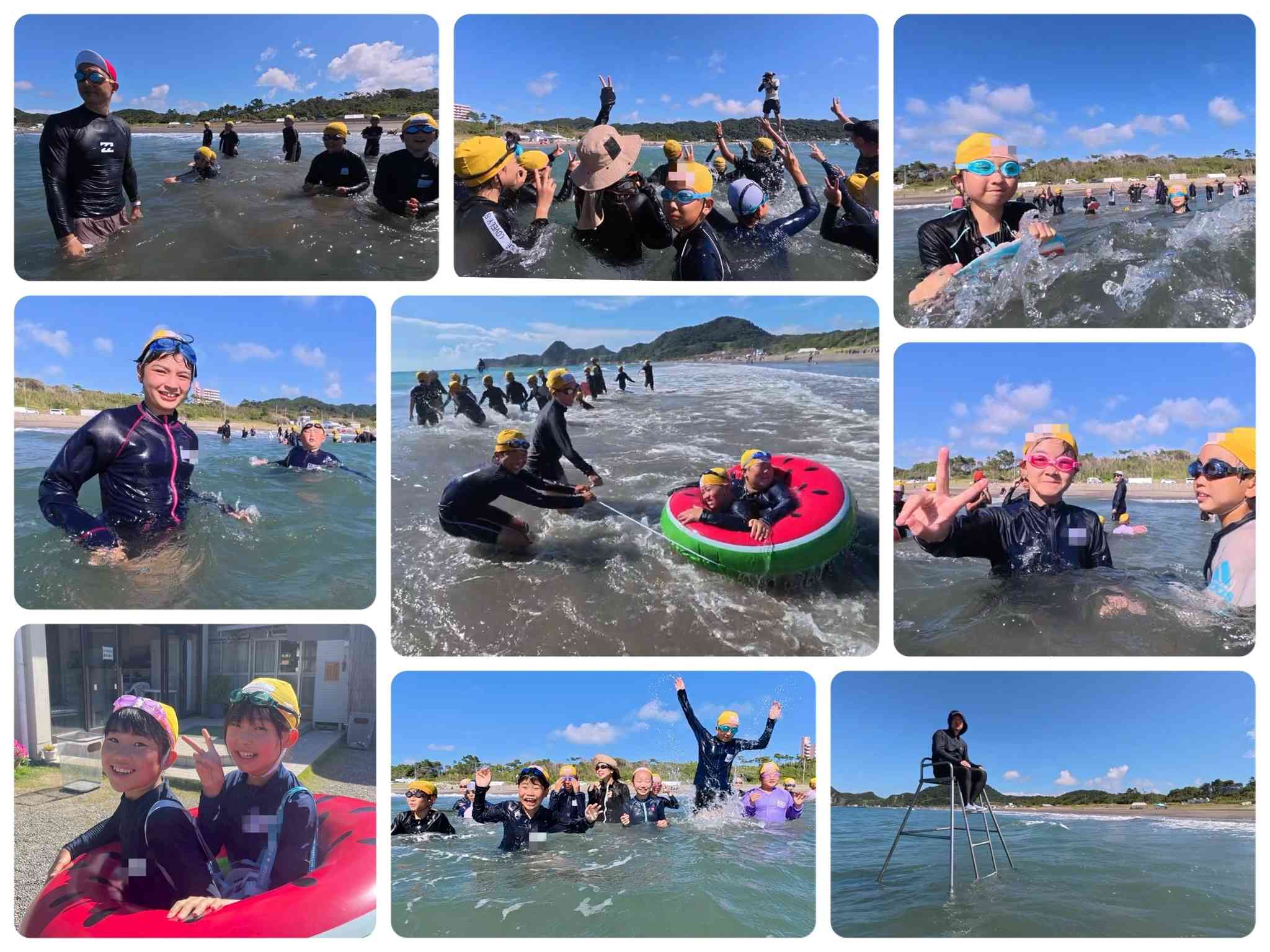 お昼寝のあとは、海へ!午前中よりも潮が満ちてきていて、波も高く、海の面白さを存分に味わえるコンディションでした。ビート板で波に乗ってみたり、すいかの浮き輪で浮かんでみたり…全力で海水浴を楽しみました!