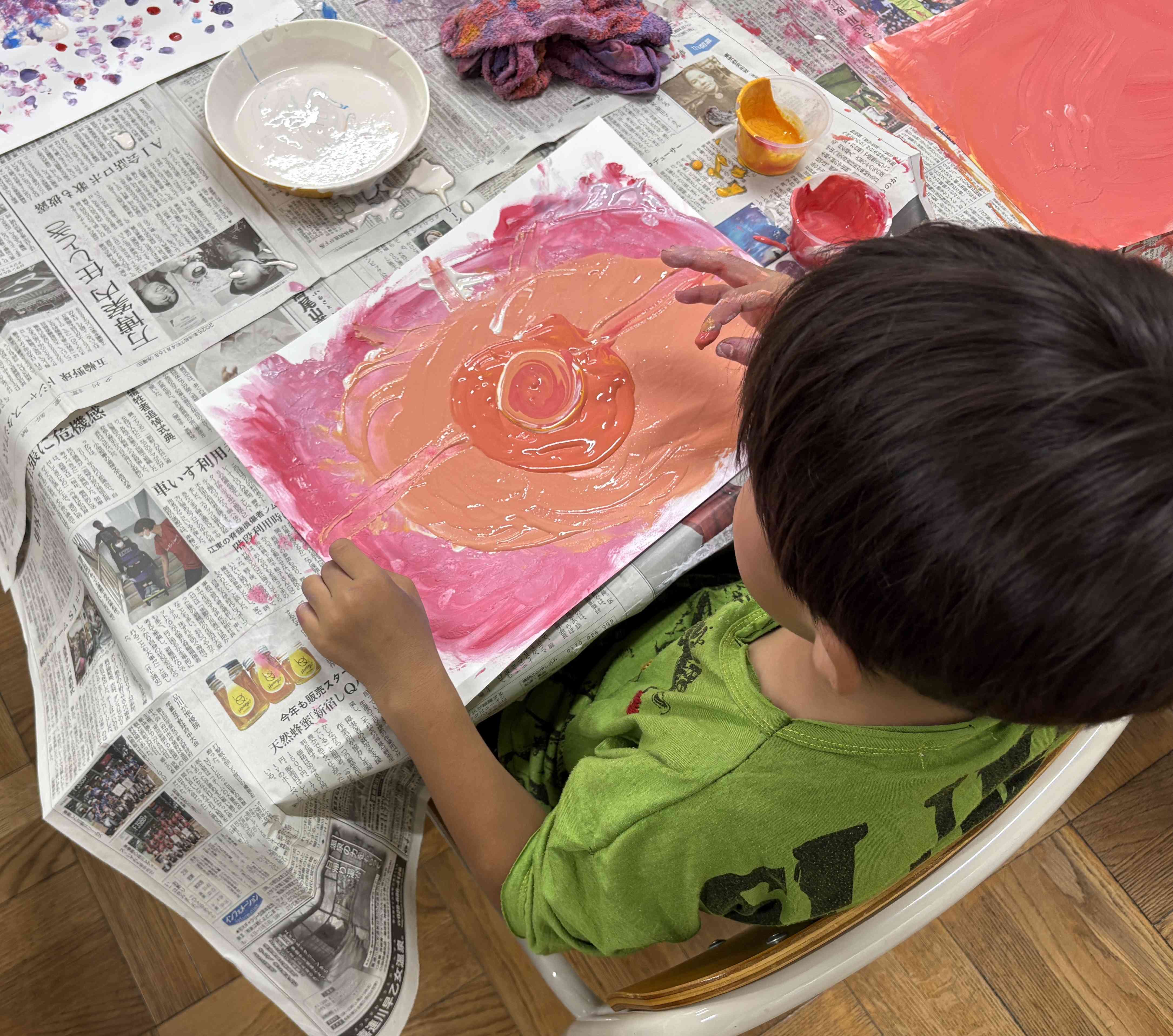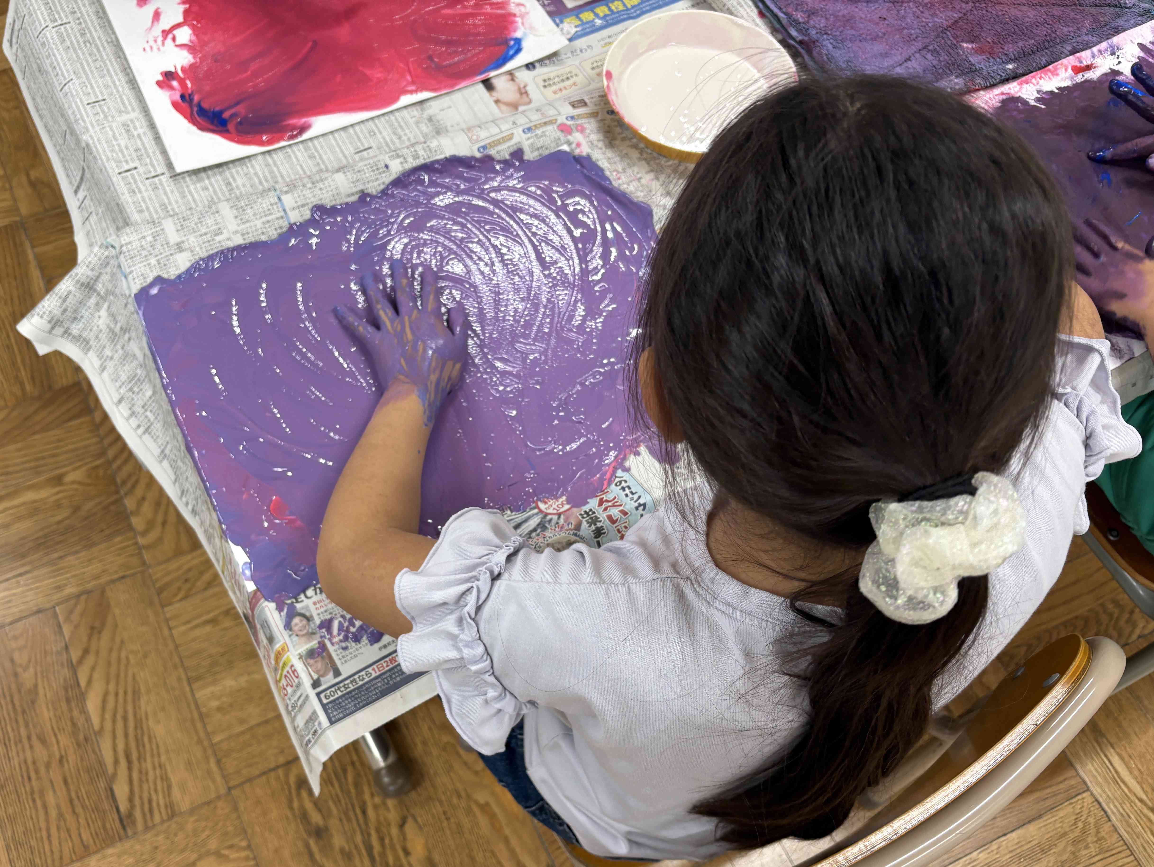 図工の学習では、液体粘土と絵の具をまぜてとろとろ絵の具を作りました。 とろとろ絵の具の感触を楽しんだり、絵で表現したりしました。 とろとろ絵の具を使うことがはじめての児童もいて、触ったときのひんやりした感じを楽しんでいました。 片付けが少し大変でしたが、みんなで協力して、綺麗に片付けすることができました。