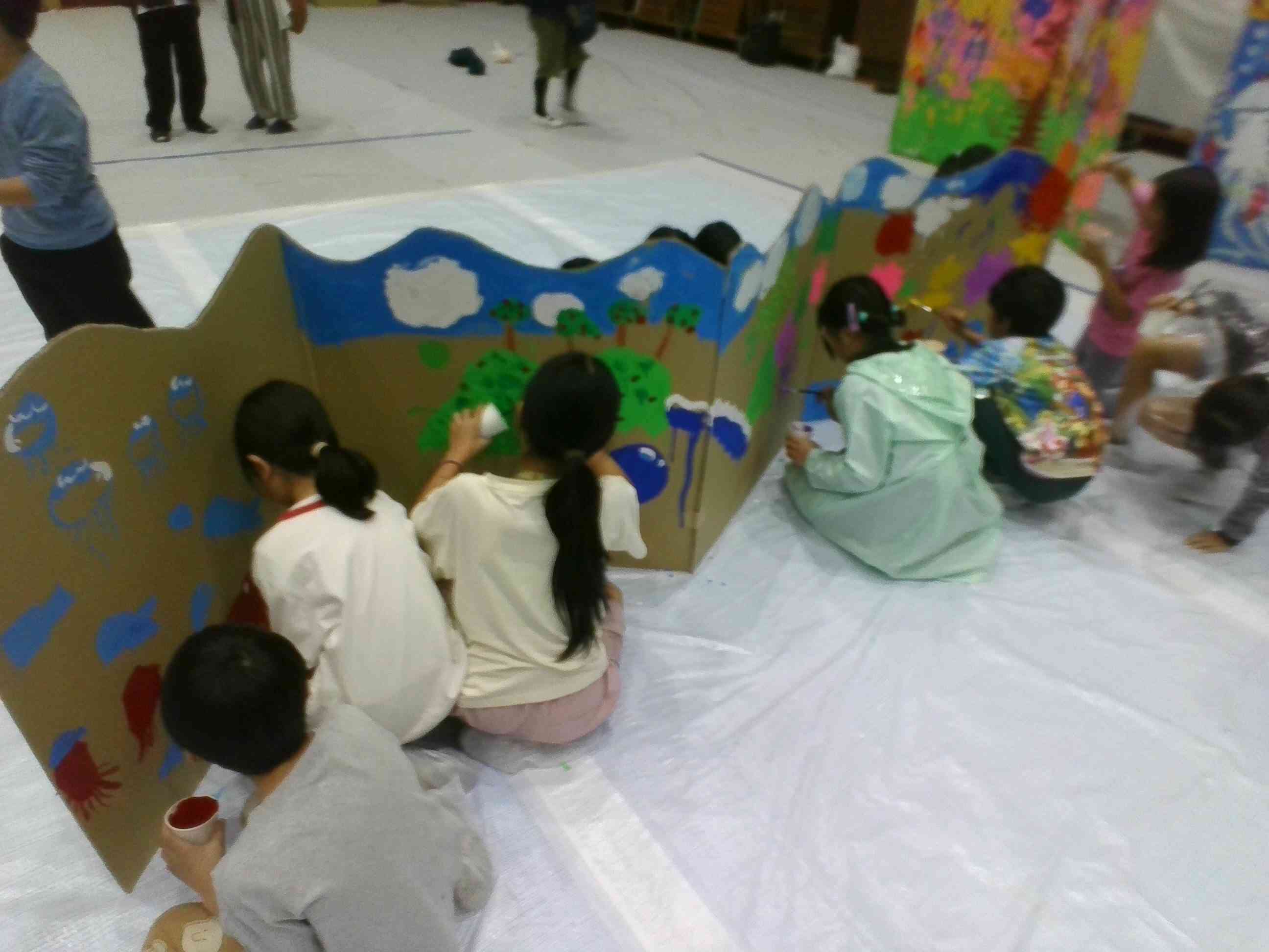 10月21日に第1回芸術祭共同制作ワークショップが開催されました。「平和な海と山の世界」をテーマに、学年みんなで段ボールの巨大なキャンバスに自由に絵を描きました。