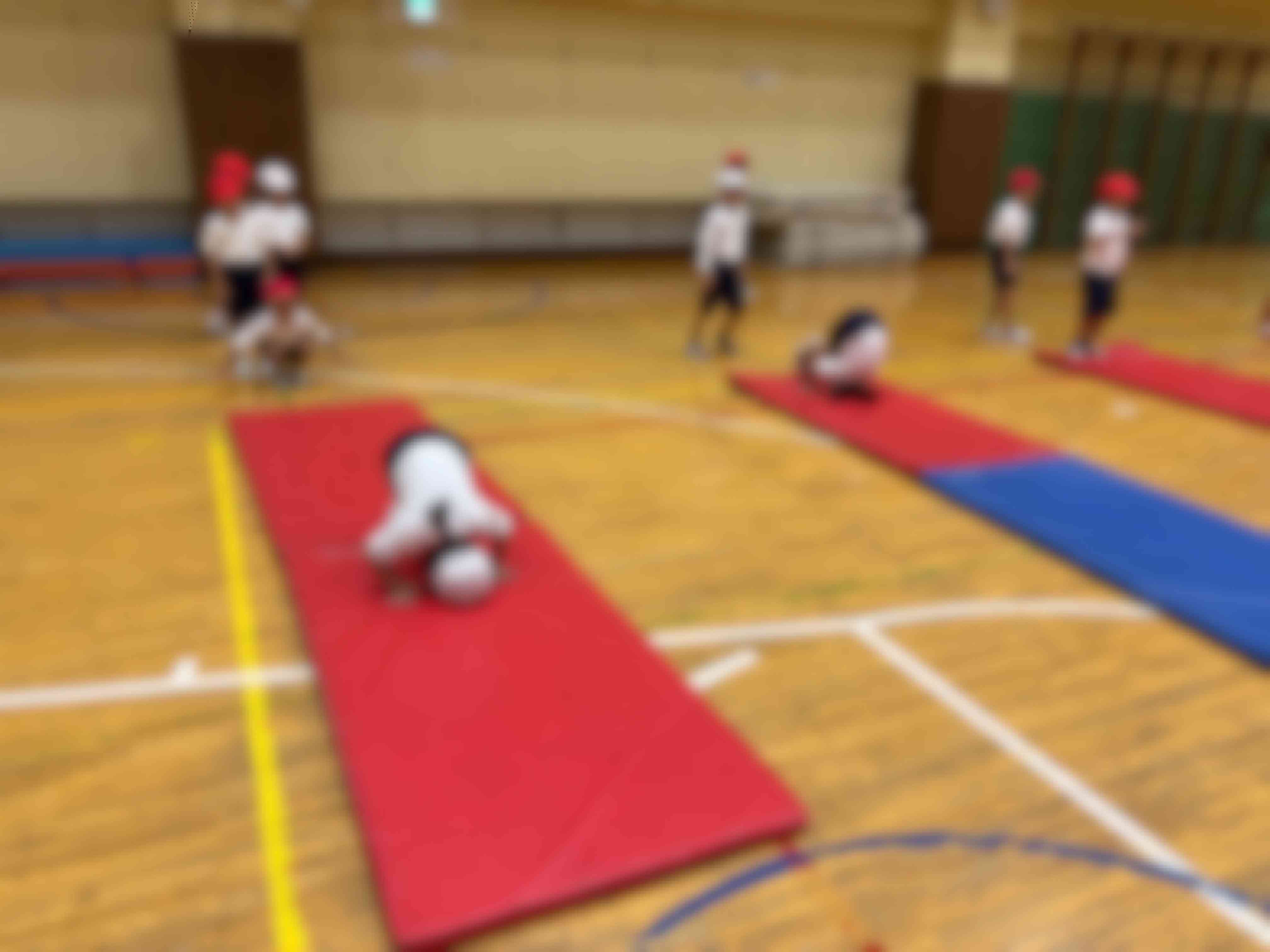 体育では、マット運動遊びをしています。 本日は、前転の練習をしました。 丁寧に前転することを意識し、前転したあとのポーズも決めることができました。