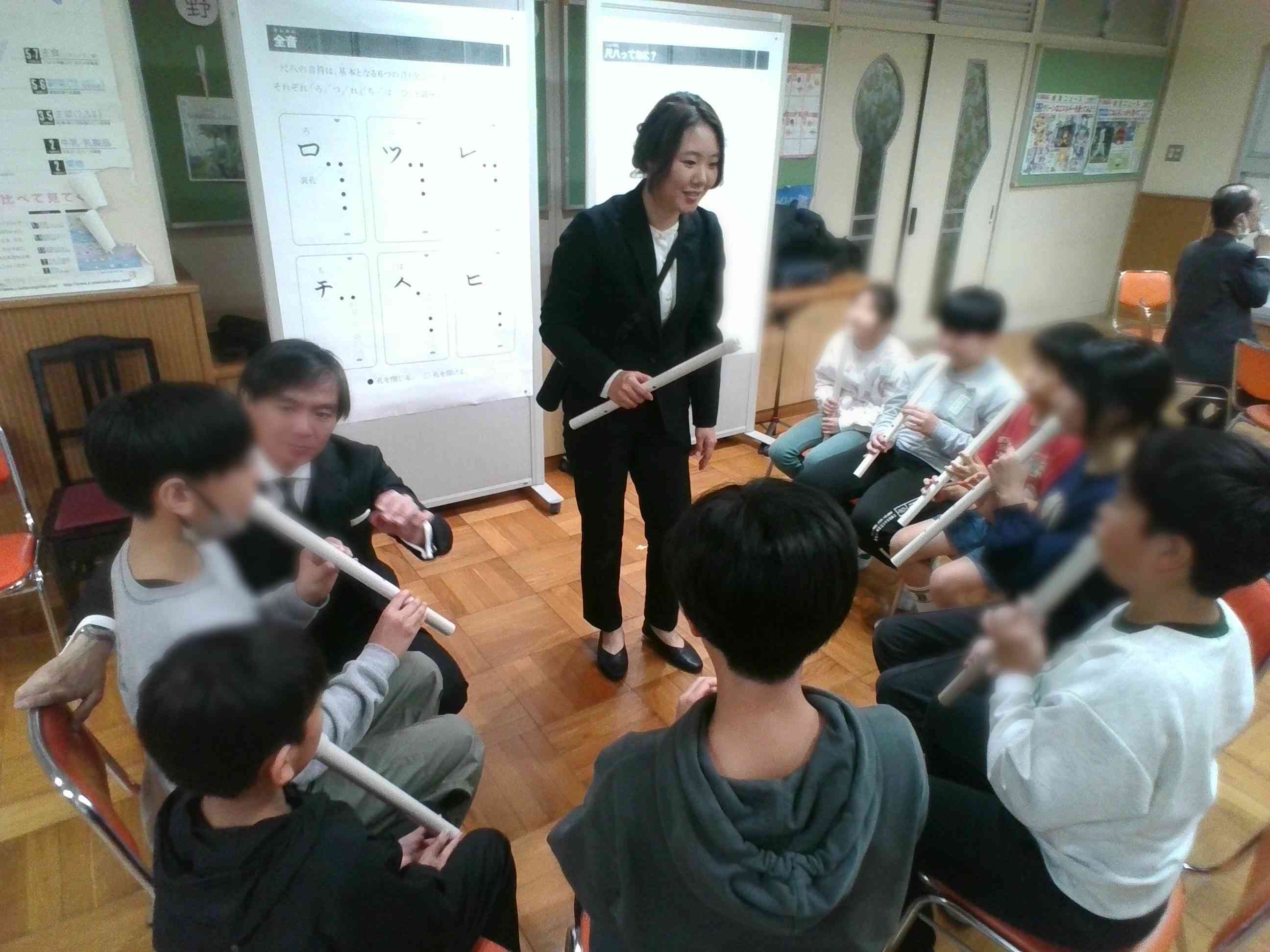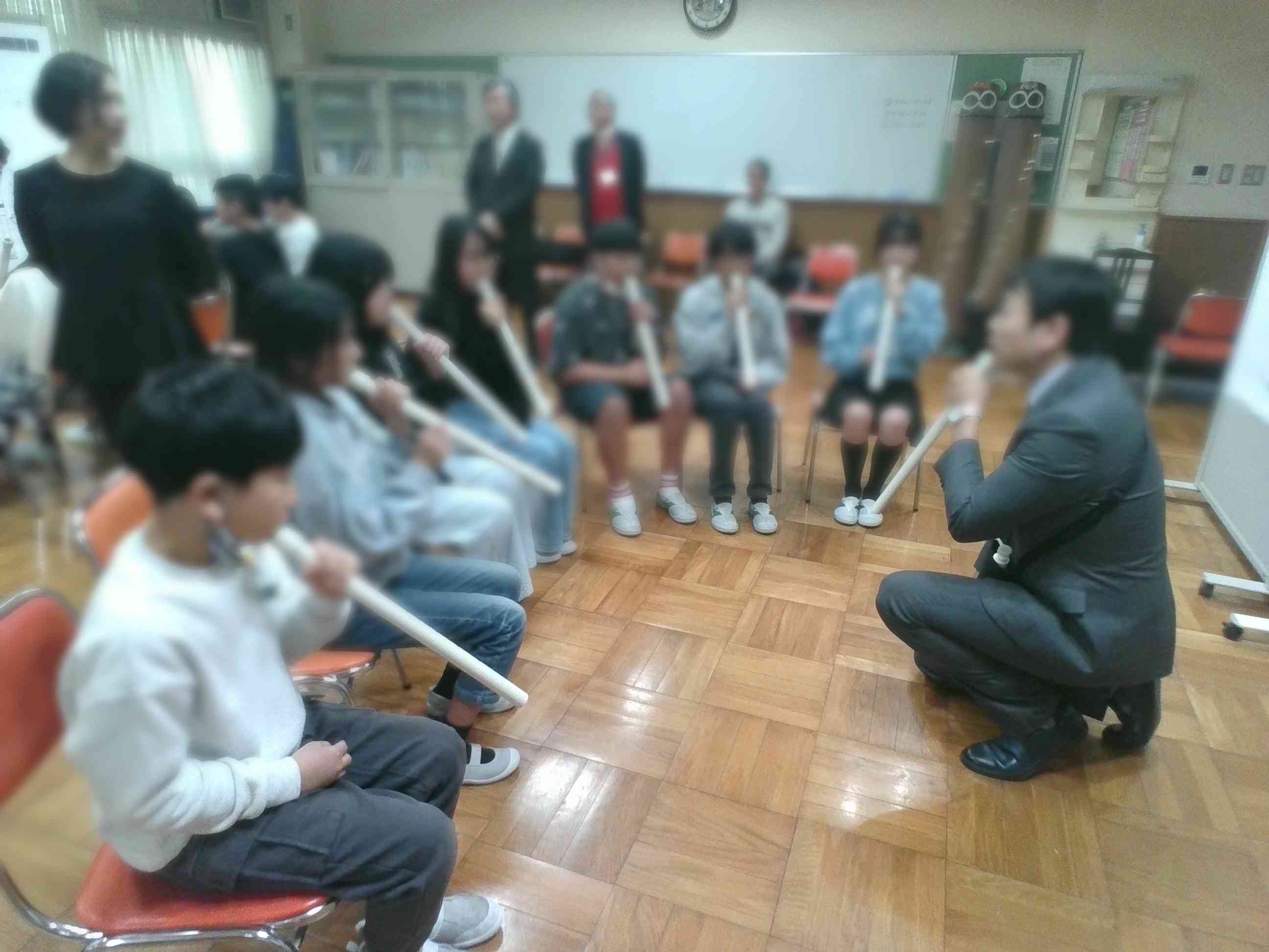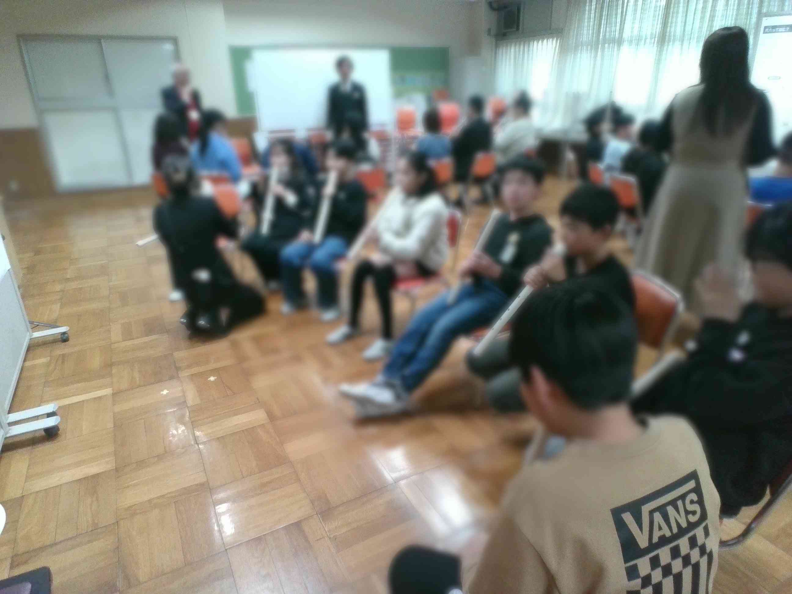 本日、5年生が東京都の「子供のための伝統文化・芸能体験事業」の中のプログラム「和楽器いろいろ」に参加しました。人間国宝の野村鋒山氏をはじめとする日本三曲協会の講師の方から尺八の吹き方を教わり体験したほか、尺八、三弦(三味線)、箏を使った「春の海」と「八千代獅子」の演奏を聴きました。 子供たちの感想からは、「リコーダーのように吹いても音が出なくてビックリした」や「想像よりもとても難しかった」、「みんなが難しそうに吹いていた尺八をあんなに息遣いもうまくできていいて本当に達人みたいでかっこよかった」など体験したからこそ感じたことや気付いたことがあり、学びの多い貴重な時間となりました。【添付ファイル】