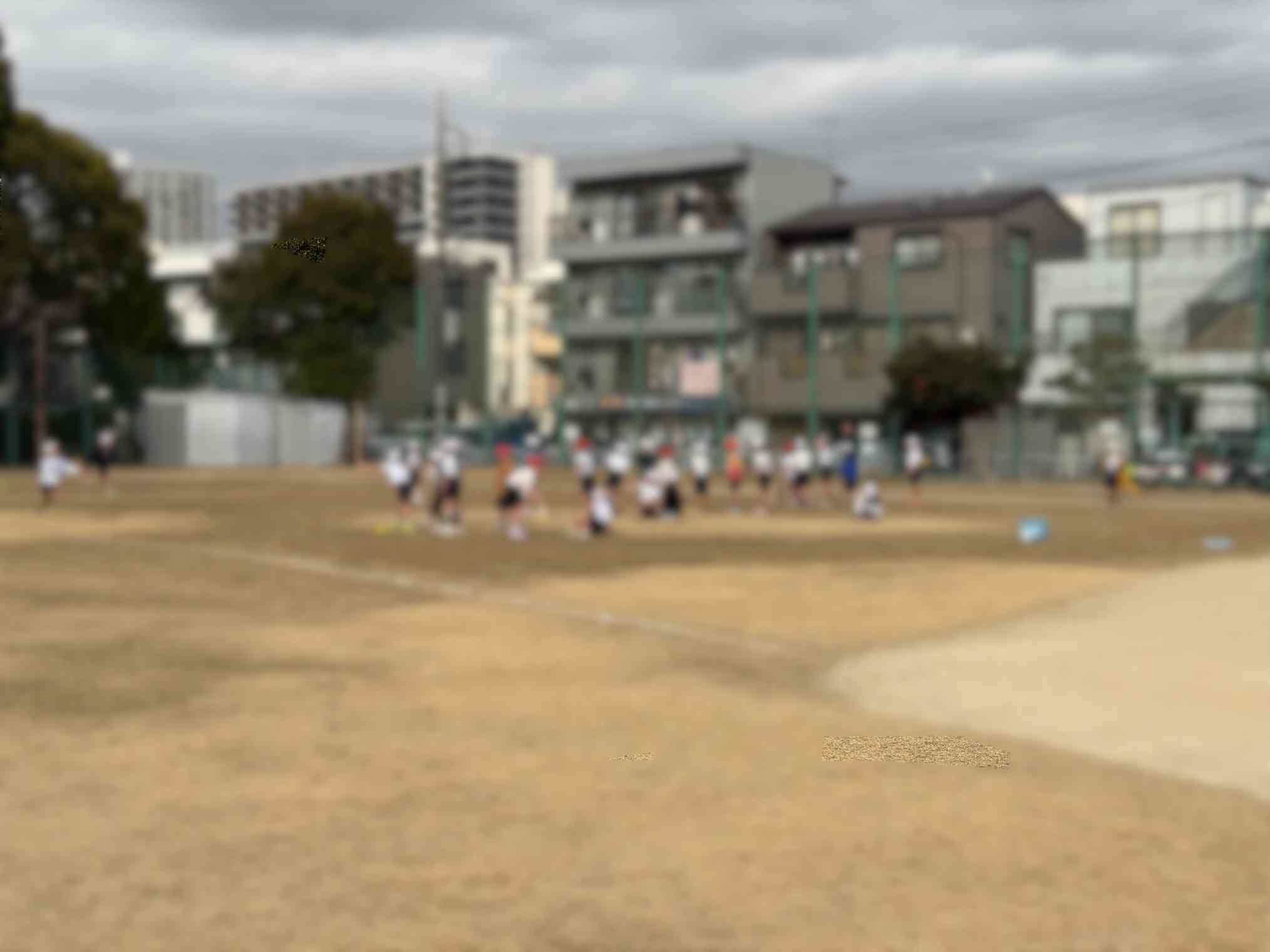 校庭が工事中のため、近くの野球場で体育をしています。 広い場所でのびのびと活動しています。
